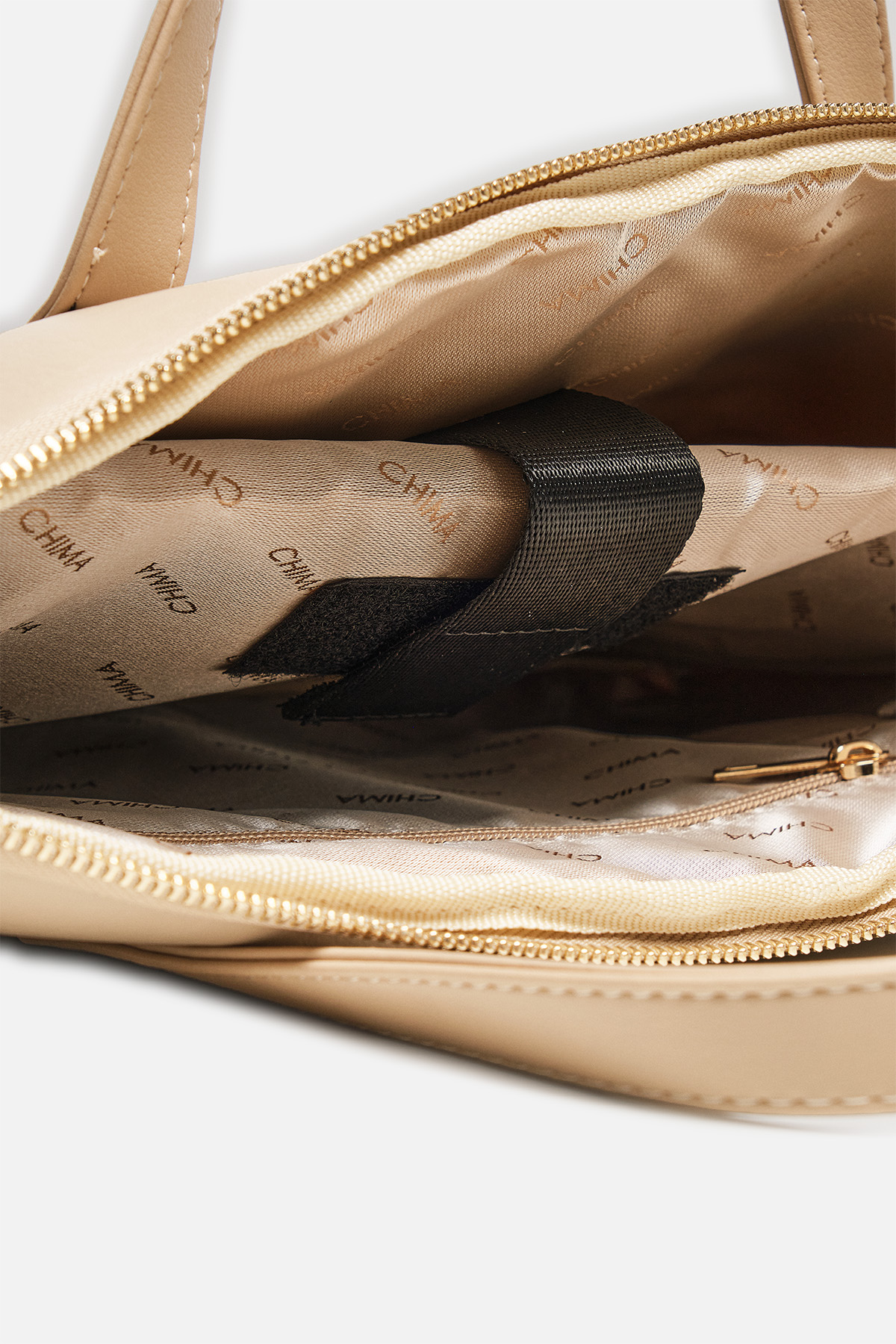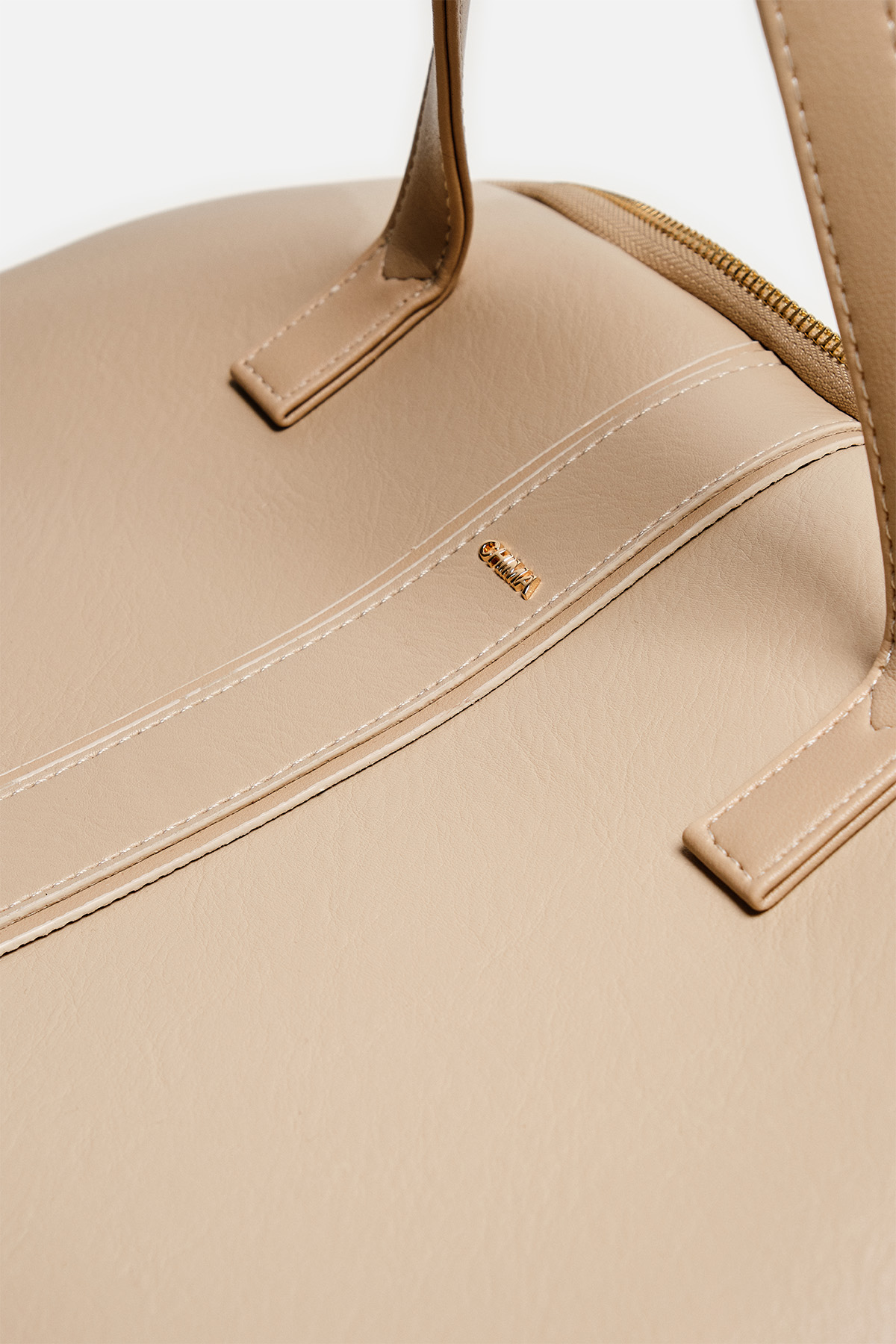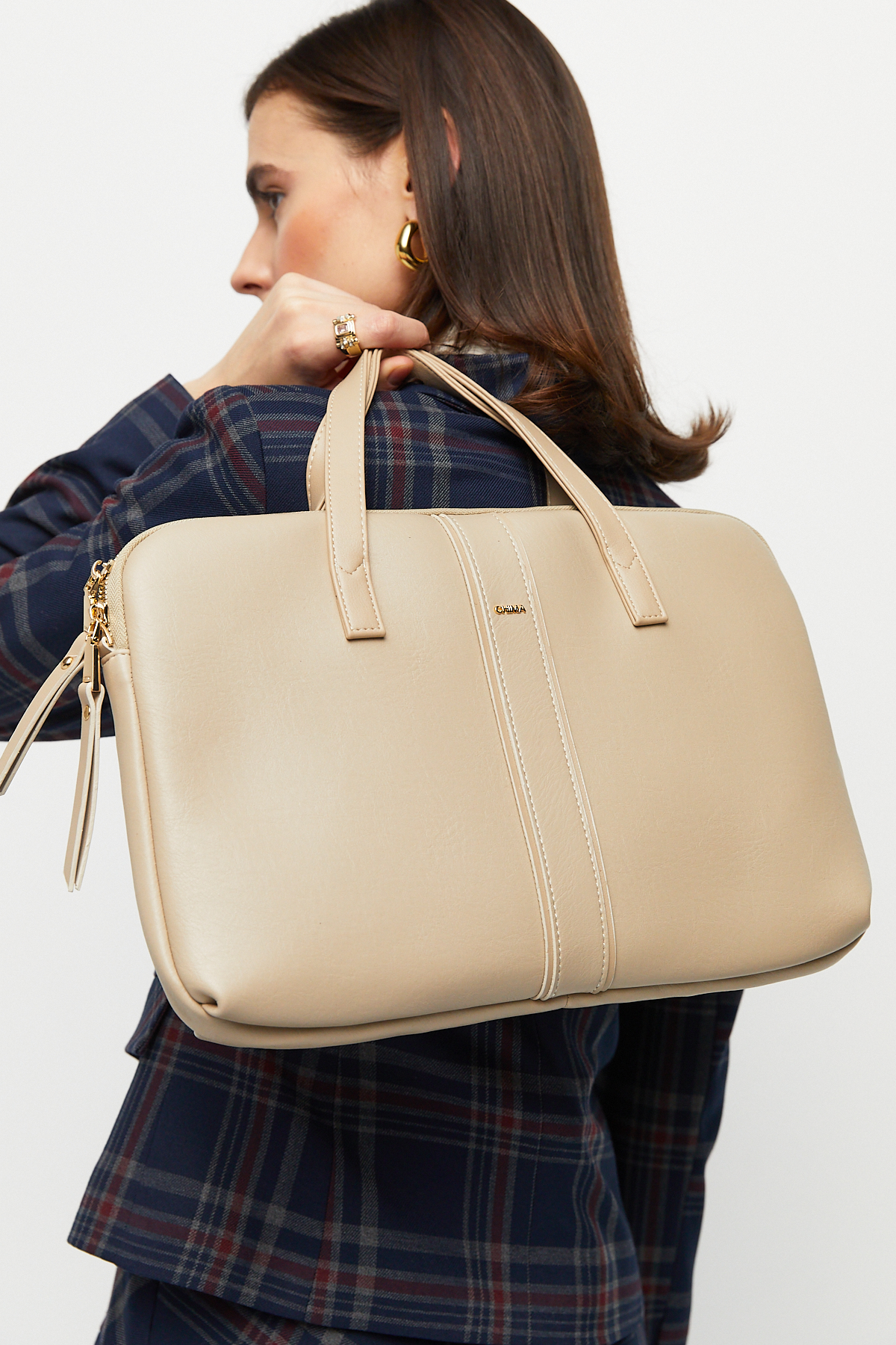 Minimalist Vurgular: Çantanın ortasındaki dikey dikiş detayı ve merkeze zarifçe yerleştirilmiş altın/metal logo plakası şıklığı pekiştirir.