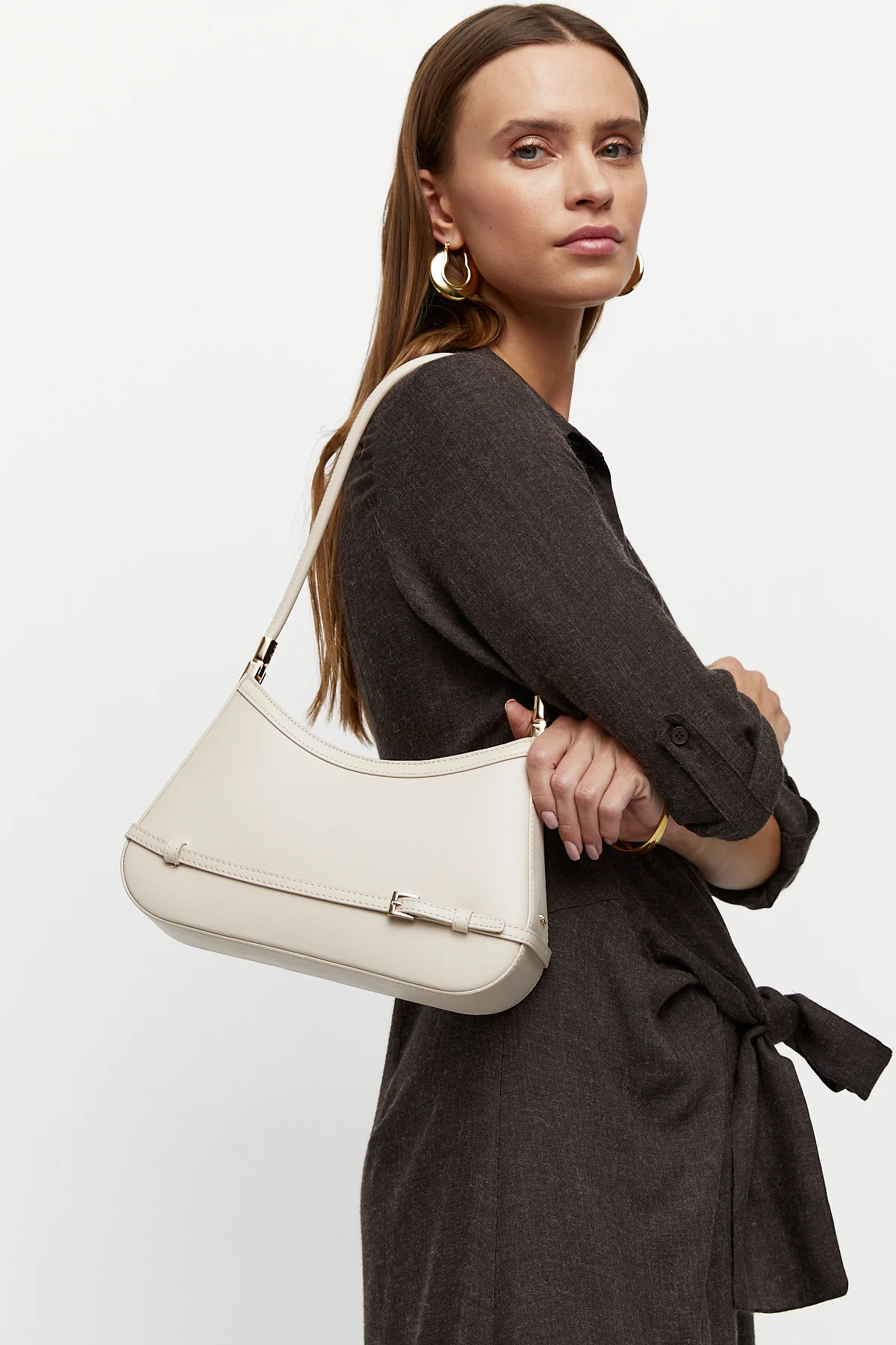 Tasarım: Ay şeklindeki (yarım ay / hobo) formu ve zarif kavisli çizgisiyle çağdaş bir görünüme sahiptir. Ayarlanabilir tokalı ön kemer detayı, çantaya sofistike ve özgün bir hava katarken, altın rengi metal aksesuarlar şıklığı tamamlar.