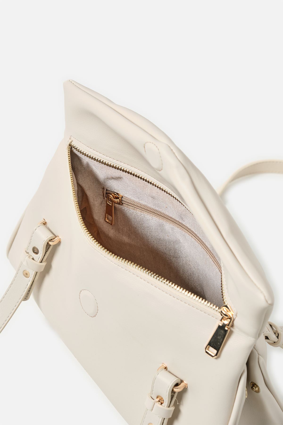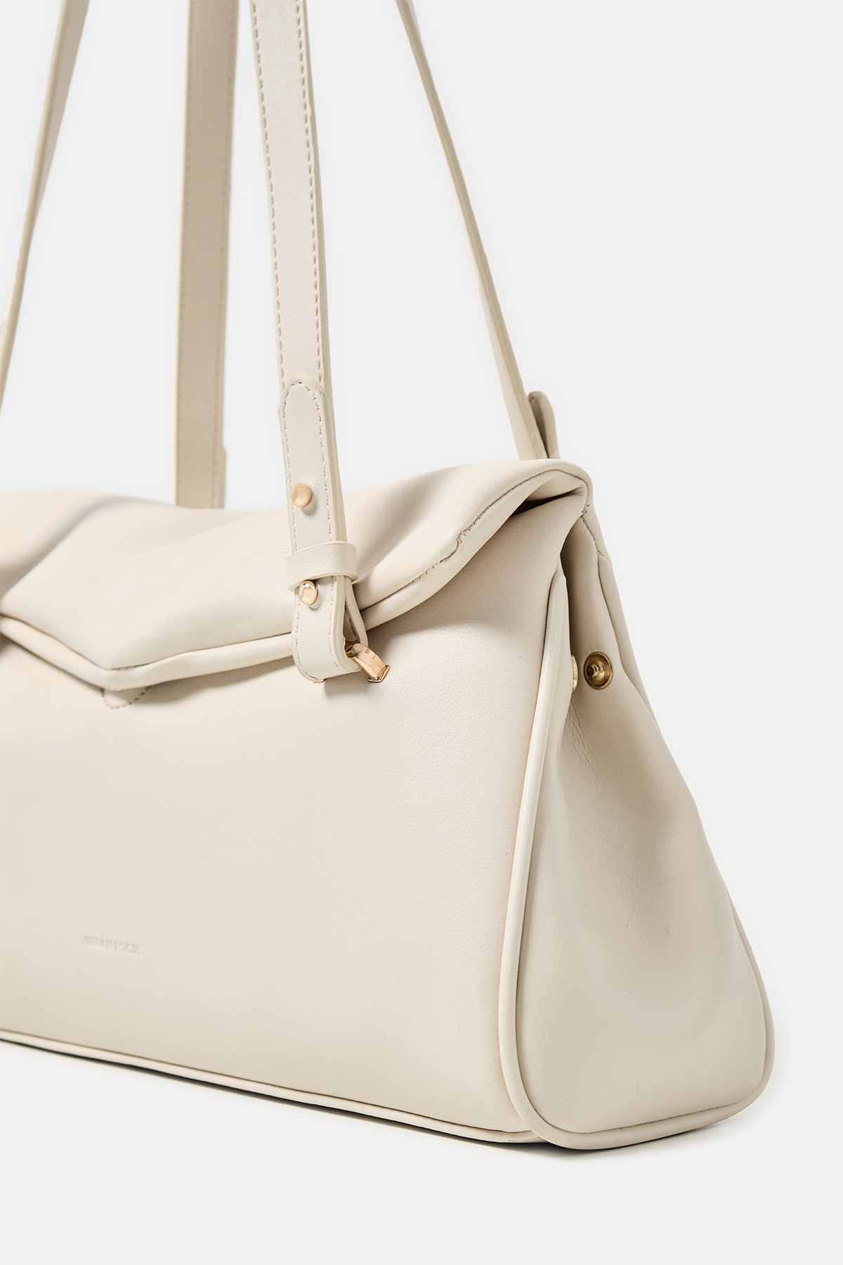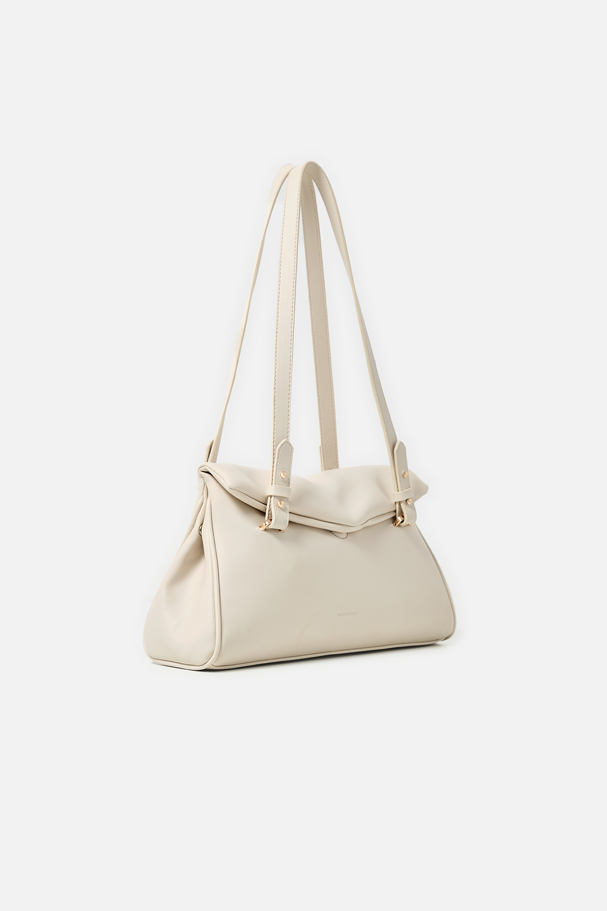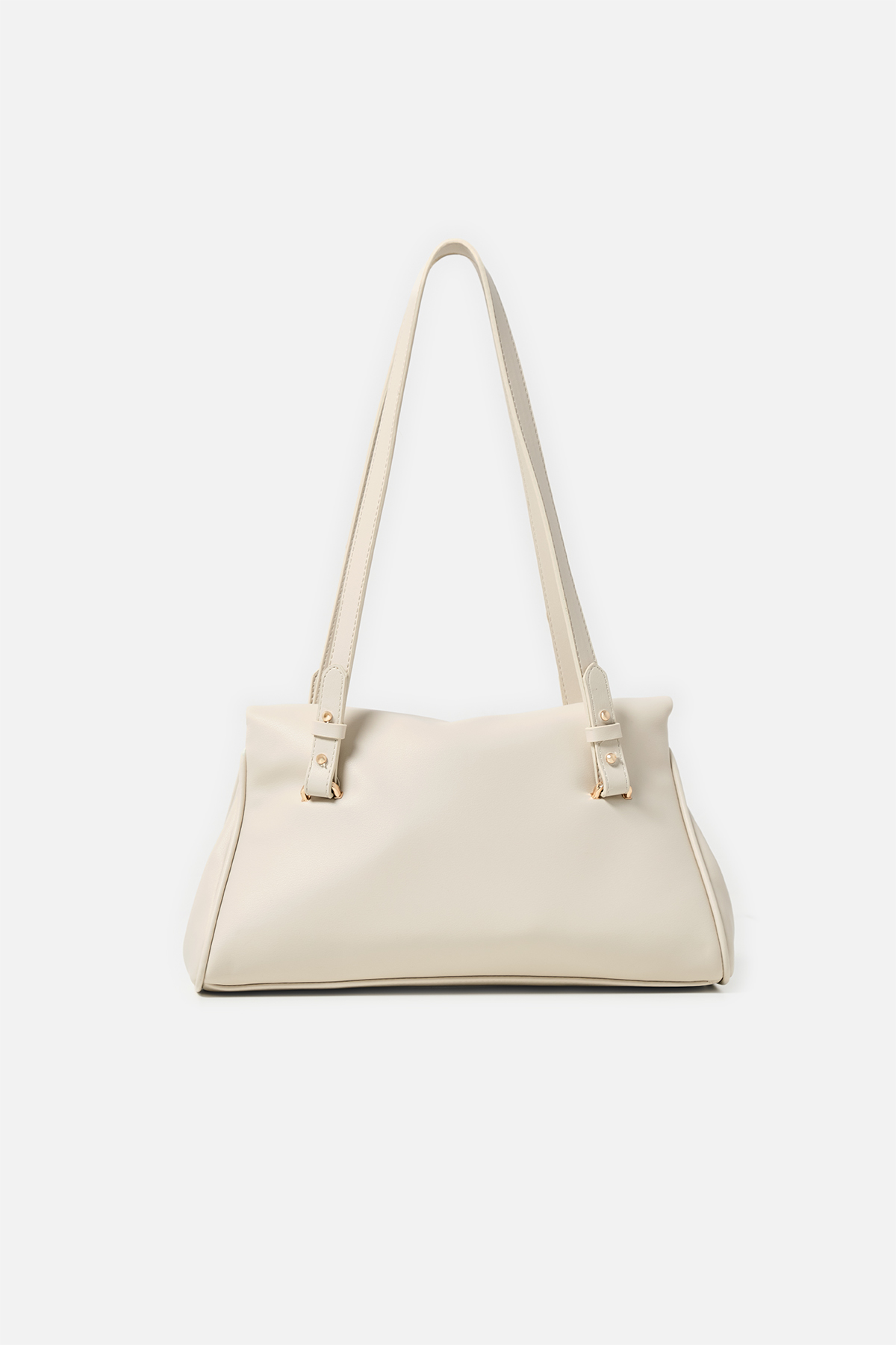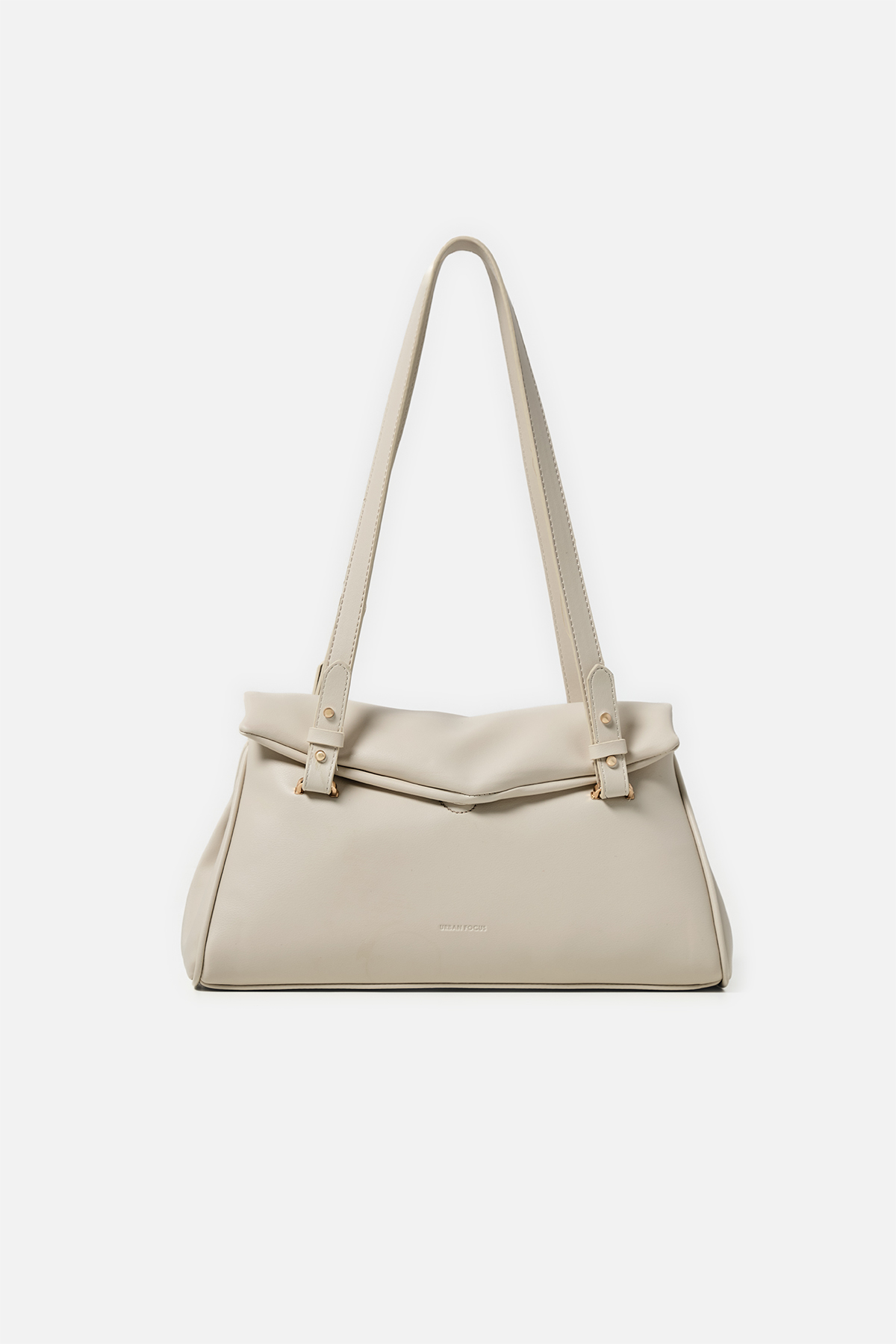 Yumuşak dokulu suni deri. Çift tutma saplı omuz çantası. Altın rengi metal detaylar. Mıknatıslı kapamalı. Fermuarlı, astarlı iç cepli.