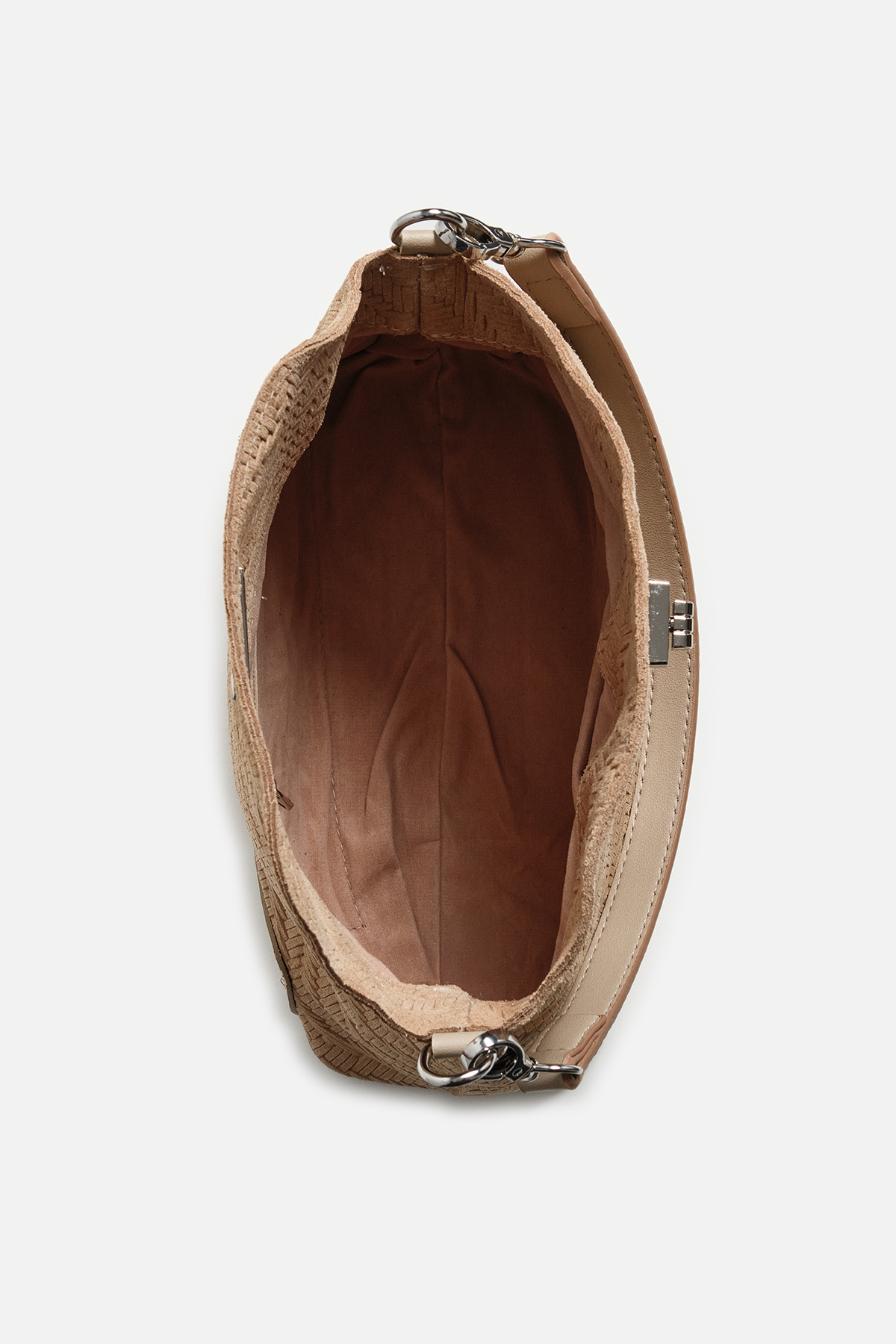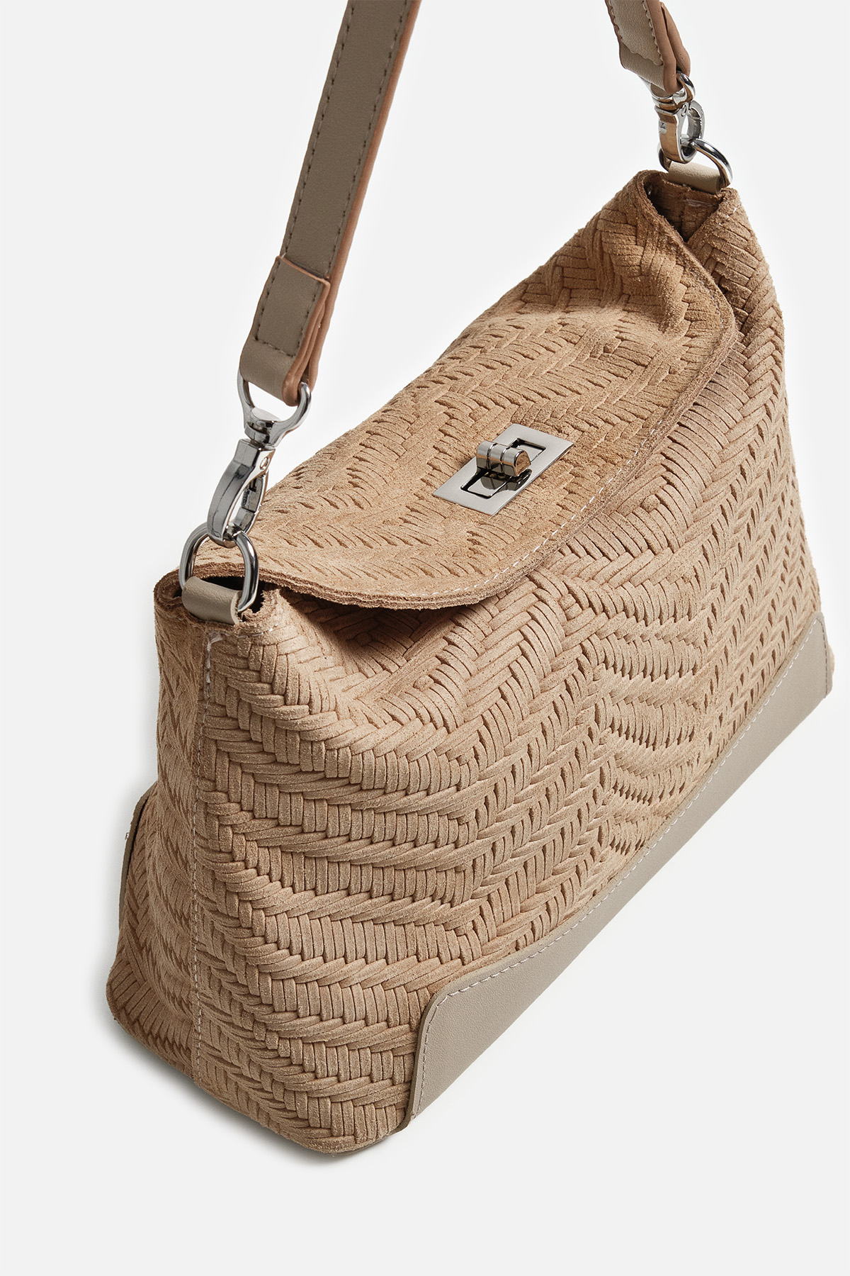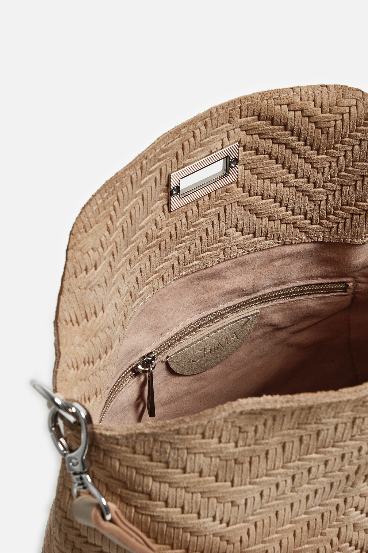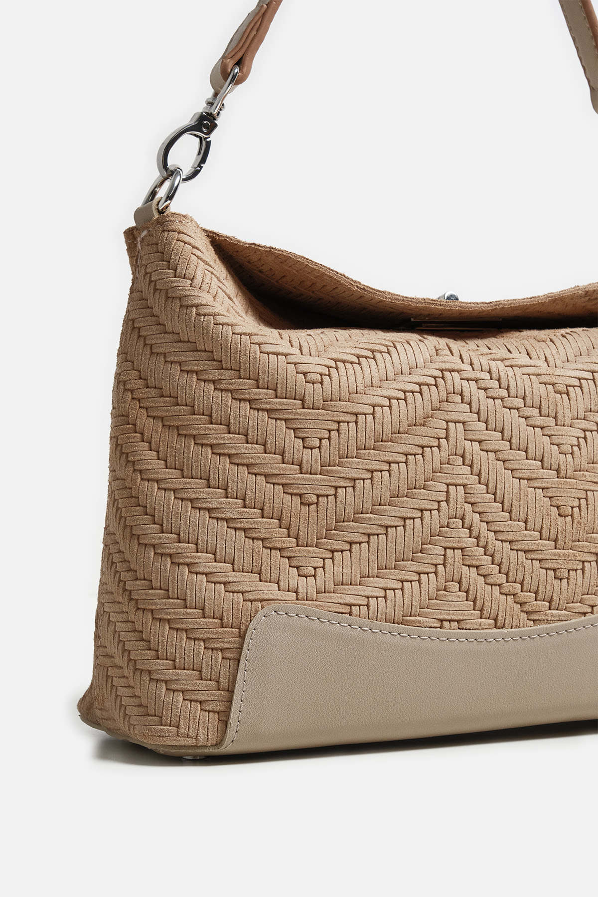 Dokulu hakki süetten dış yüzey . Çıkarılabilir tutma sapı. Aayarlanabilir çapraz askılı. Gümüş kilit kapama. Fermuarlı iç cepli iç astarlı çanta .