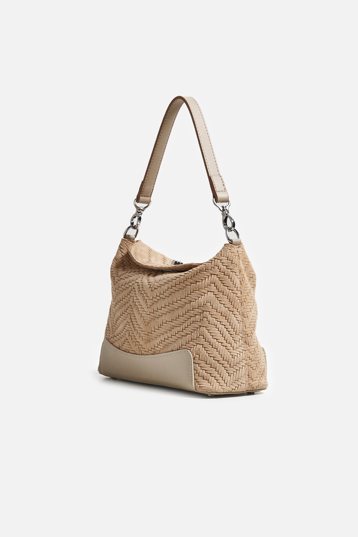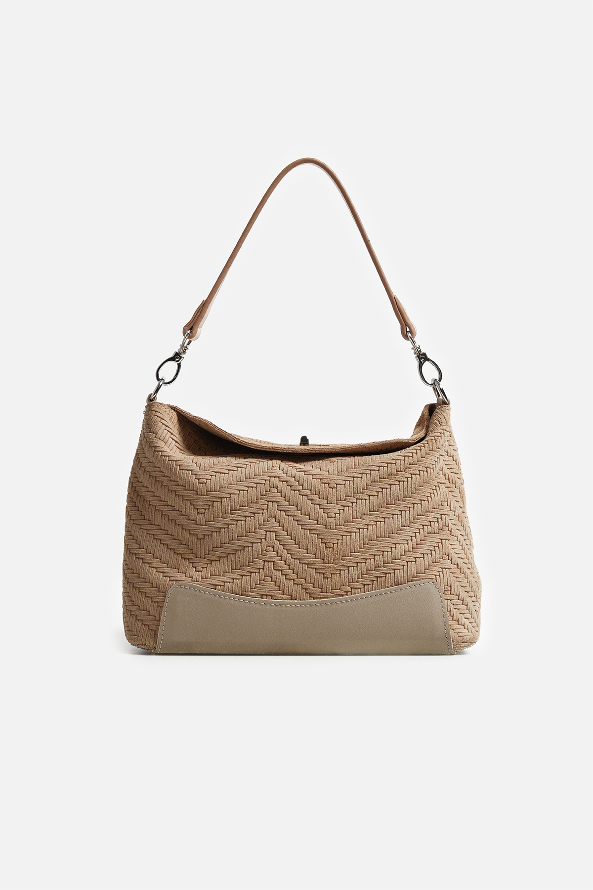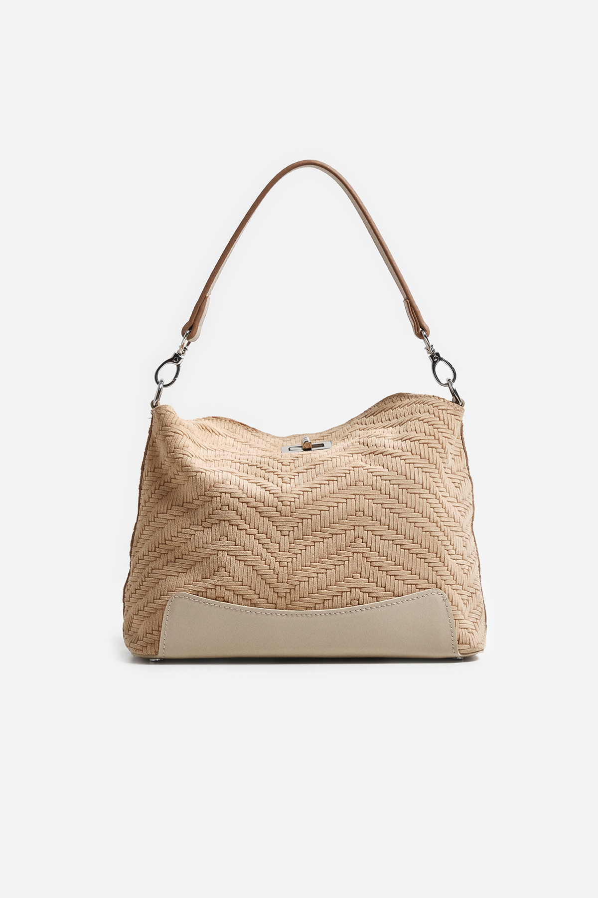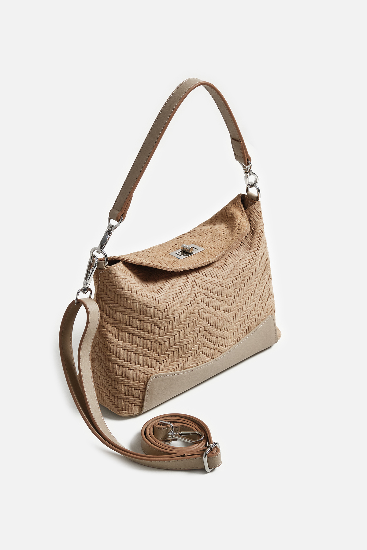Dokulu hakki süetten dış yüzey . Çıkarılabilir tutma sapı. Aayarlanabilir çapraz askılı. Gümüş kilit kapama. Fermuarlı iç cepli iç astarlı çanta .