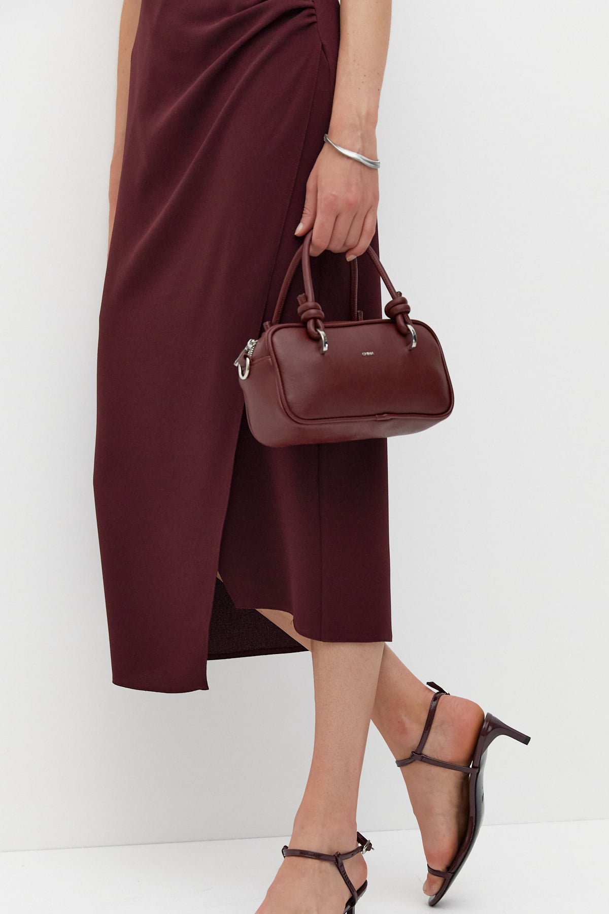 Yumuşak dokulu suni deri kumaştan üretilmiş bu mini el çantası, zarif düğüm detayları ve modern siluetiyle her kombine sofistike bir dokunuş katar.