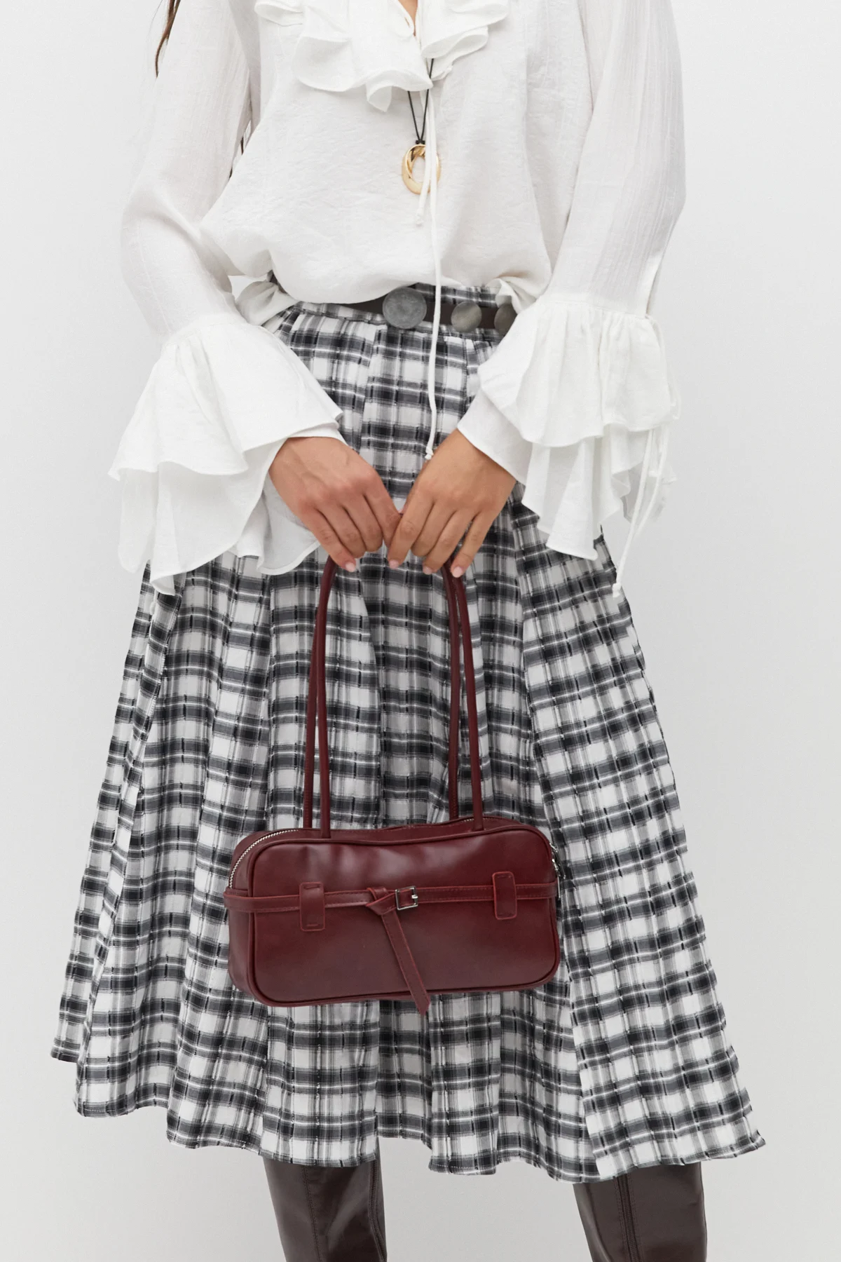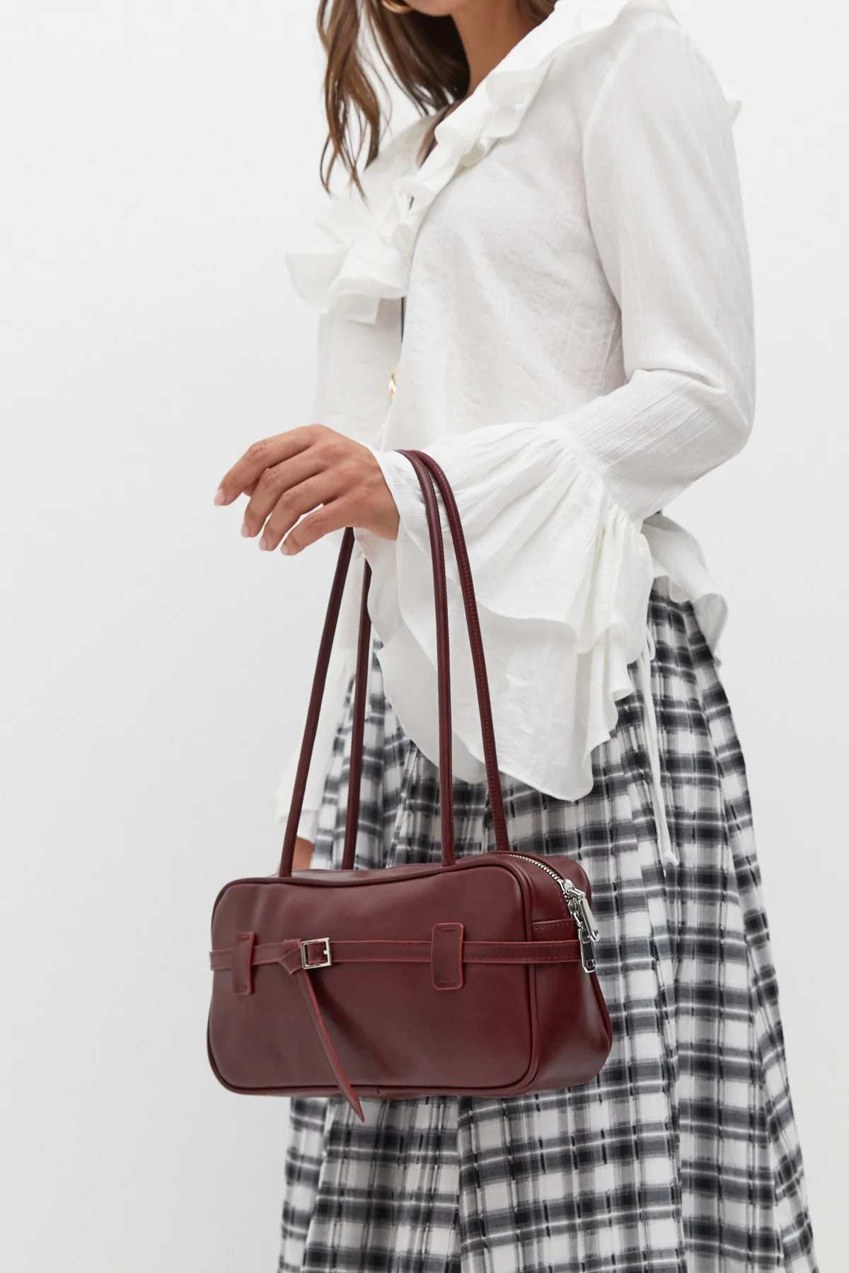 Modern ve şık bir silüete sahip tokalı omuz çantası.