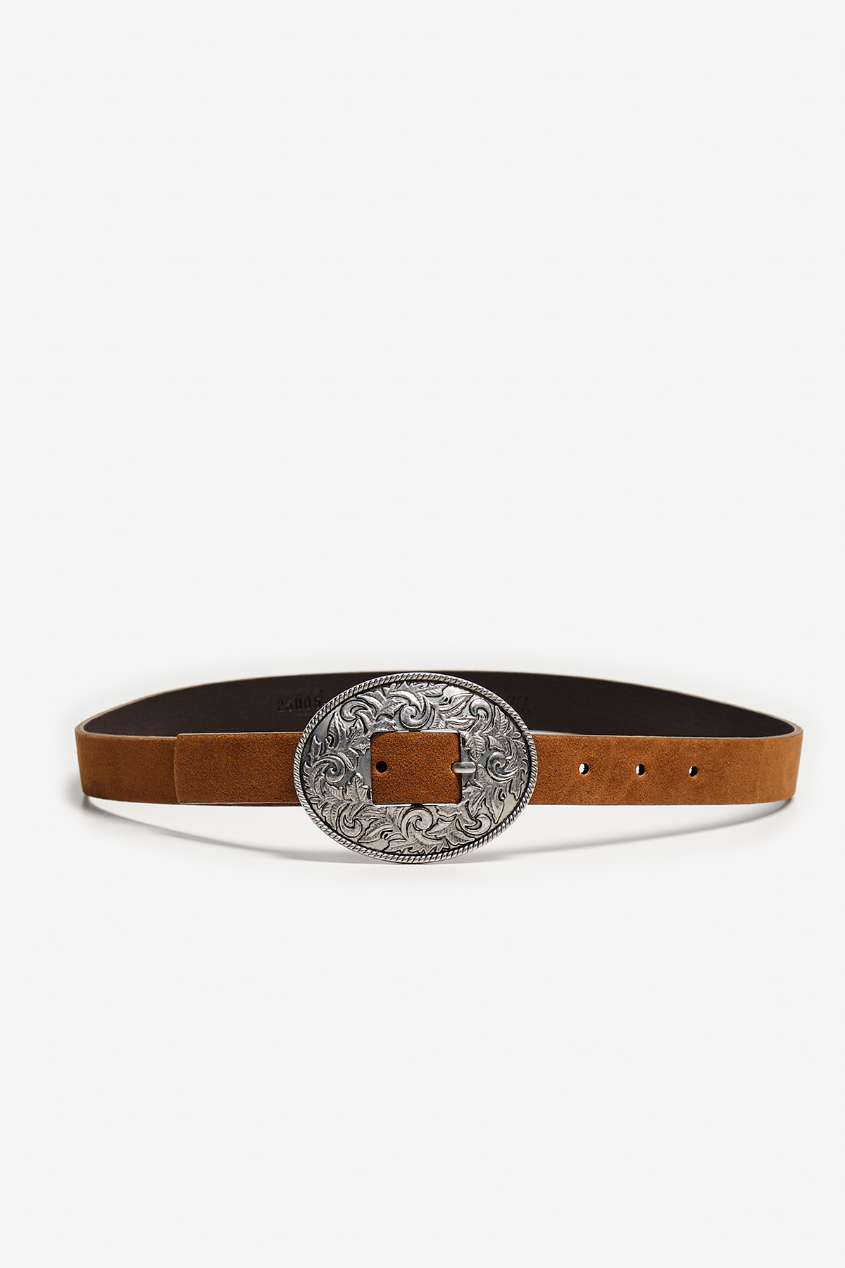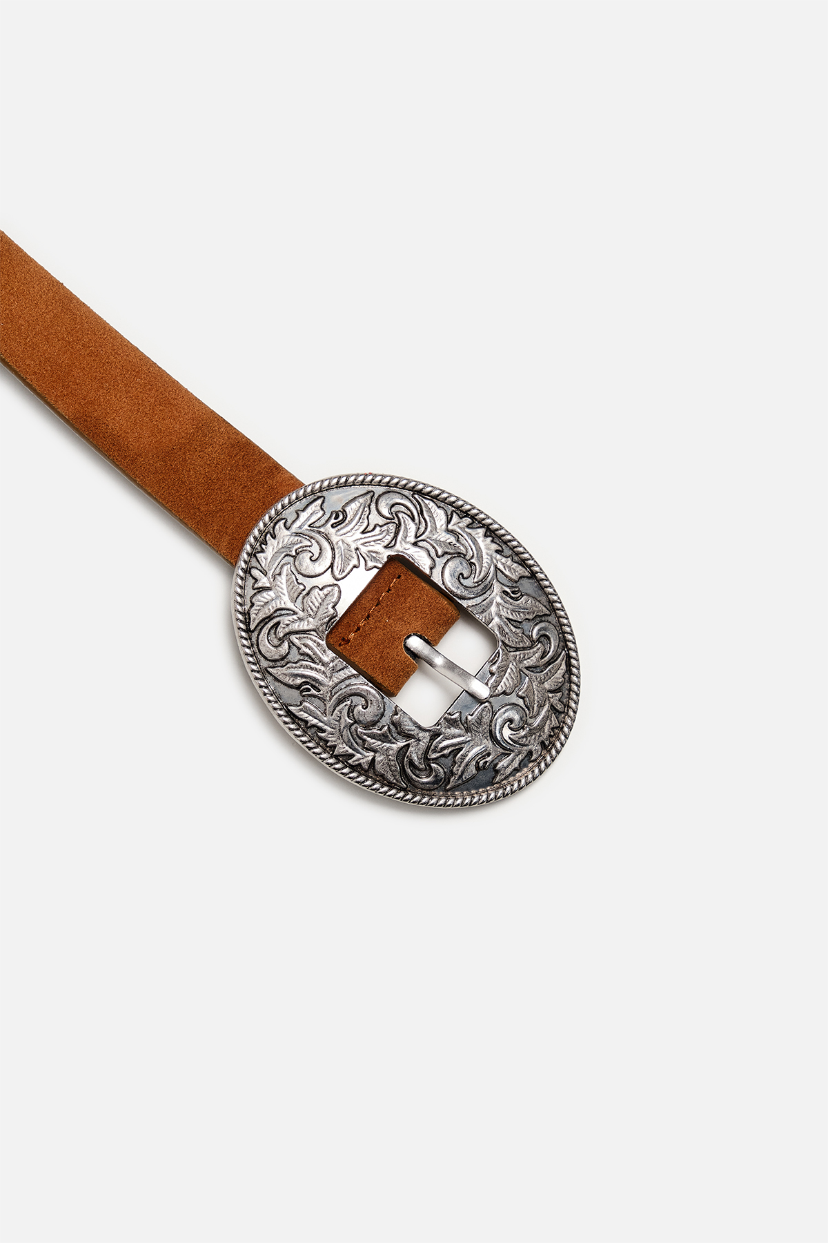 Toprak tonlarının en doğal hali camel ve kahve süet kemerde! Yumuşacık dokusuyla teninize dost, antik gümüş rengi oval oyma tokasıyla ise tam bir western ikonu. Detaylı işlemeleriyle her bakışta fark yaratır, bohem ve özgür ruhlu kombinlerin vazgeçilmezi olur.