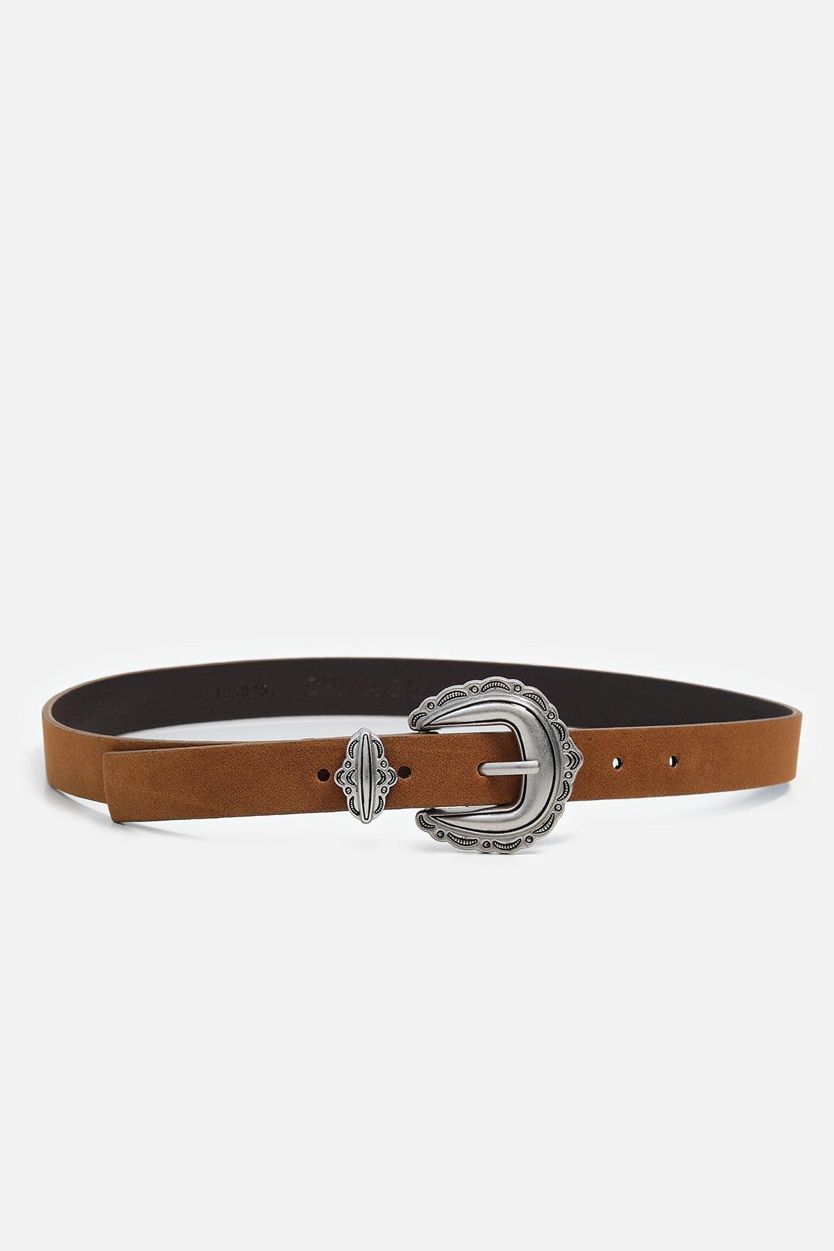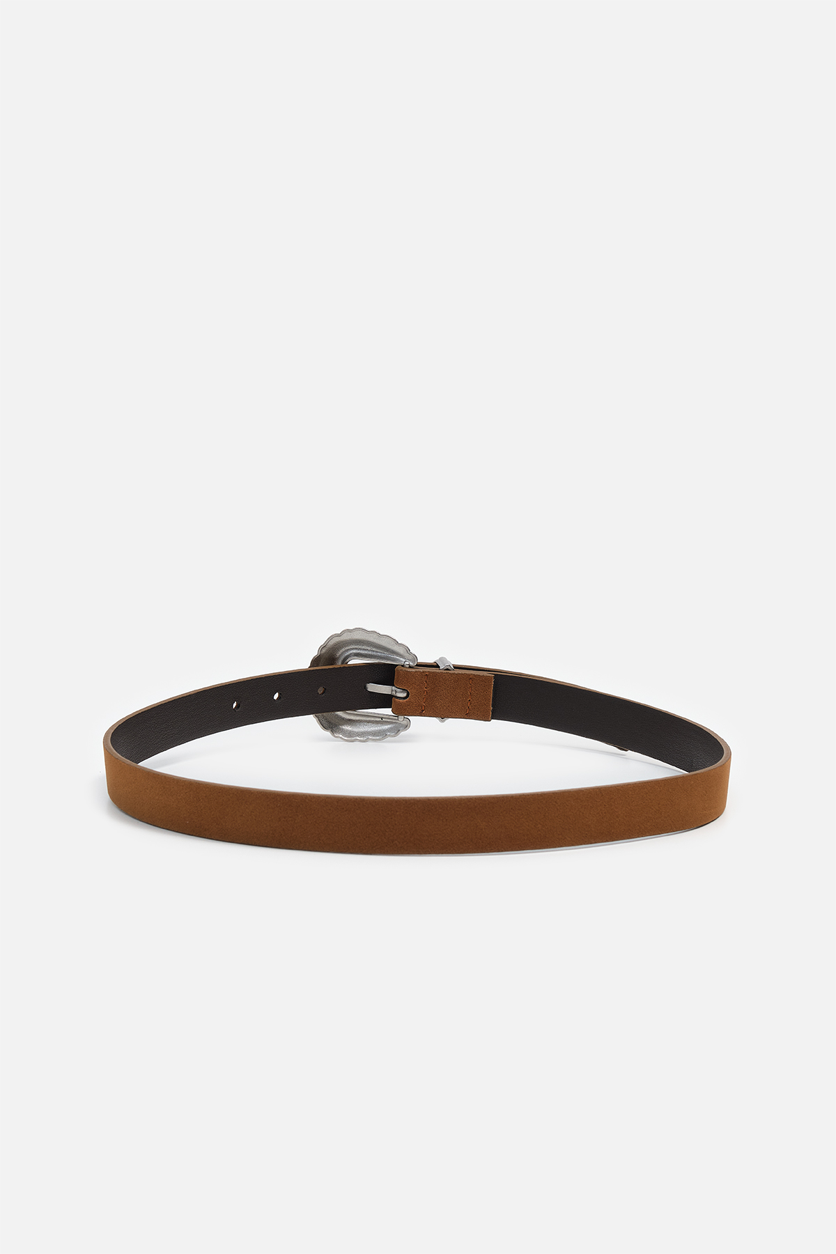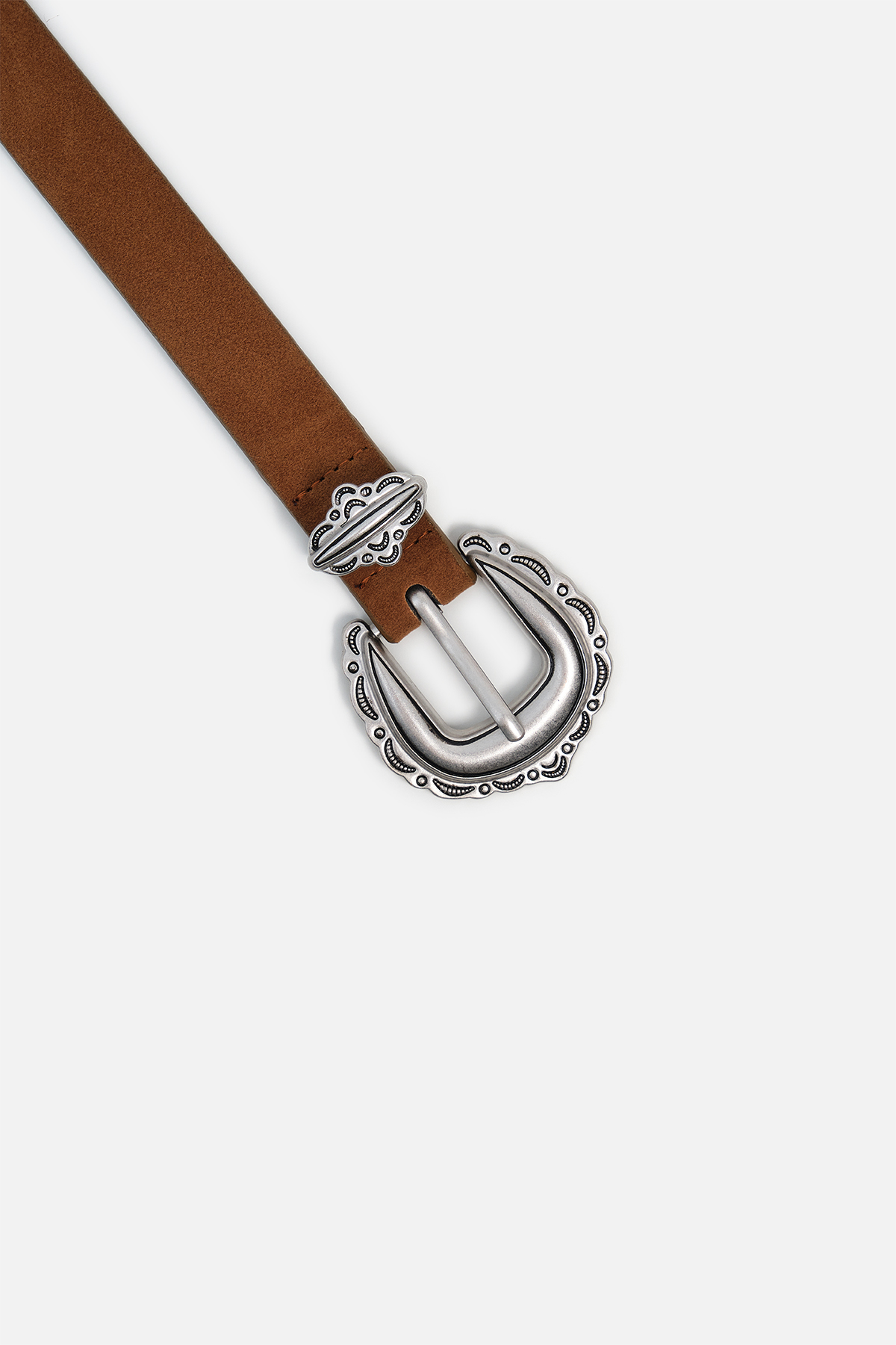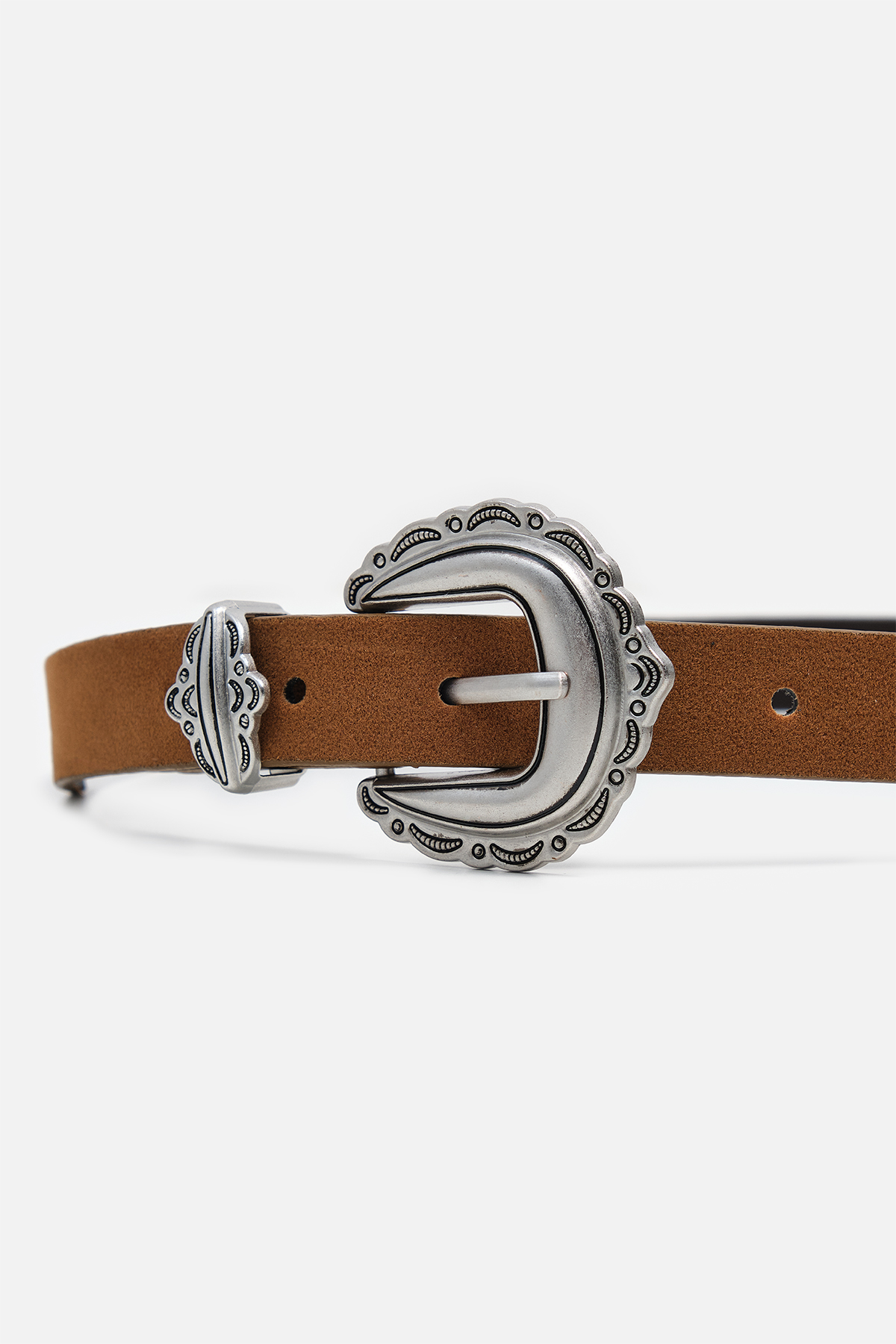 Vahşi batı ruhunu modern şıklıkla buluşturan bu kahverengi süet kemer, detayların büyüsüyle dikkat çeker! Kadifemsi dokusuyla yumuşacık, antik gümüş rengi işlemeli tokasıyla ise göz kamaştırıcı. Her kombine karakter katar, özgün bir stilin imzası olur.