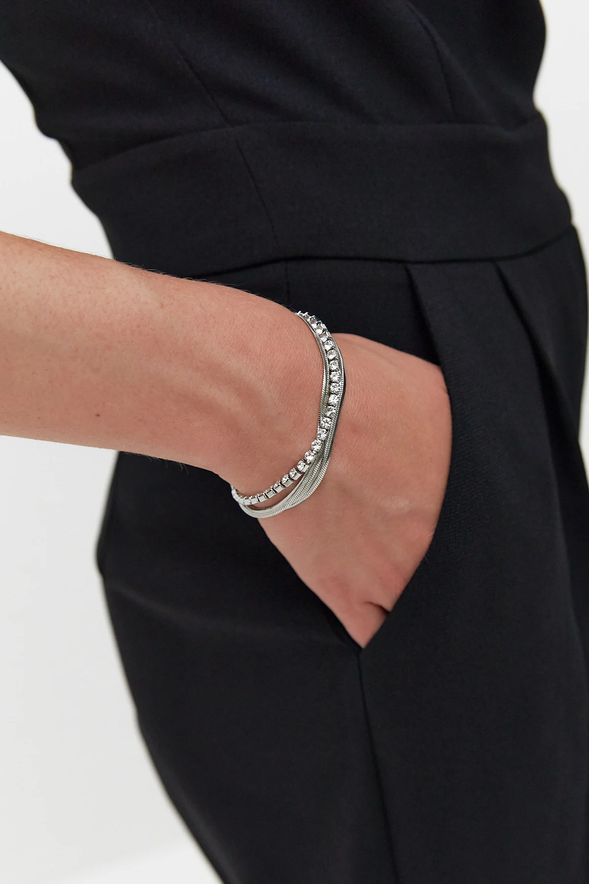 Işıltılı zirkon taşların ve zarif zincirlerin çok katmanlı uyumuyla dikkat çeken bu bileklik, bileği sofistike bir dokunuşla sarmalar. Parlak gümüş tonu, taşların ışıltısını mükemmel şekilde yansıtırken, ayarlanabilir uzatma zinciri sayesinde ideal uyumu yakalamanızı sağlar. Gündüz şıklığından gece davetlerine kadar her anınıza eşlik edecek, modern ve çarpıcı bir aksesuar.