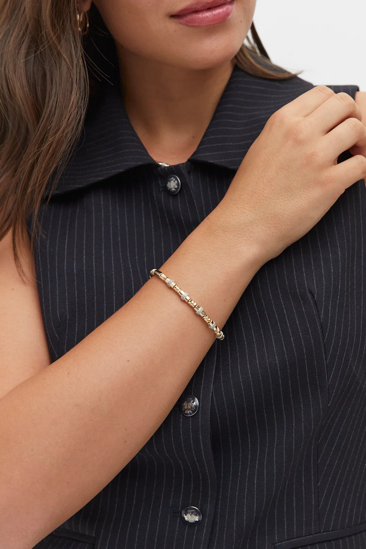 Altın tonlu damla zincir bileklik, her bir halkasında yer alan pırlanta taşlarla süslü damla formlarıyla sofistike bir şıklık sunar; narin ve özenle işlenmiş tasarımı, ışığı zarifçe yansıtarak elegan bir parlaklık yaratır. Günlük kullanım için ideal olan bu parça, diğer takılarla uyumlu bir şekilde kombinlenebilir; zamansız estetiğiyle her stile kolayca uyum sağlar ve özel anlar için çarpıcı bir tamamlayıcıdır.