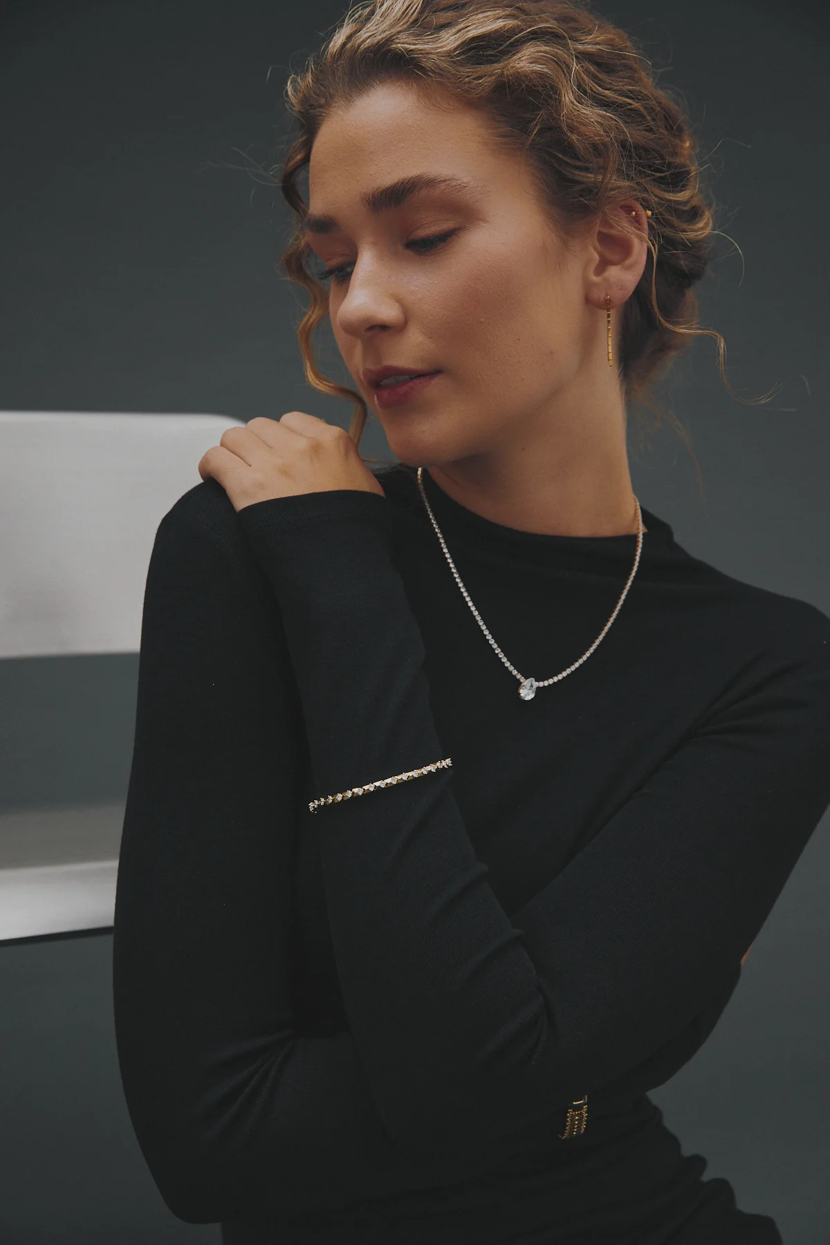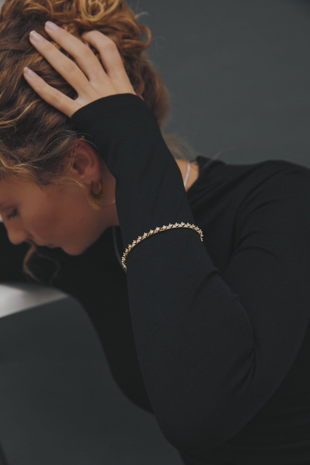 Zarif altın tonlu zincir bileklik, her bir halkasında yer alan pırlanta taşlarla bezeli kesim detaylarıyla göz alıcı bir şıklık sunar; ince ve zarif tasarımıyla ışığı yakalayarak parlak bir etki yaratır. Hafif yapısıyla günlük kullanım için mükemmel olan bu parça, diğer takılarla uyumlu bir şekilde istiflenebilir; zamansız estetiğiyle her stile kolayca adapte olur ve özel anlar için sofistike bir tamamlayıcıdır.