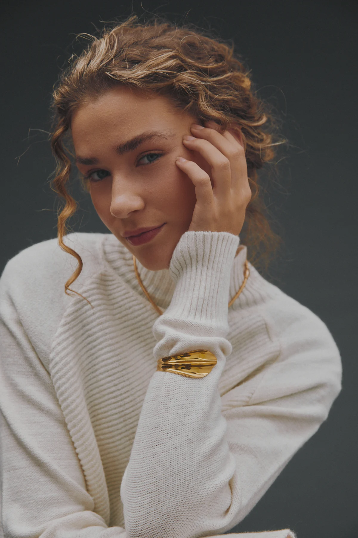Bu altın rengi bileklik, organik formlu uç tasarımıyla heykelsi bir görünüm sunar. Akışkan hatları sayesinde bileğe zarifçe oturur ve modern bir şıklık kazandırır. Parlak yüzeyi, ışıltılı bir etki yaratarak sade kombinlere bile sofistike bir hava katar.Tek başına minimal bir ifade yaratırken, farklı bilekliklerle kombinlenerek daha iddialı bir stil oluşturabilir. Gündüzden geceye, her ortamda rahatlıkla kullanılabilecek zamansız bir aksesuar.