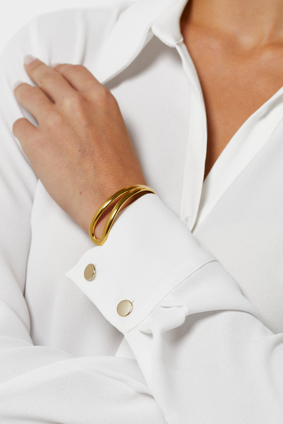 Modern ve minimalist bir duruş sergileyen bu altın rengi bileklik, dalgalı ve açık form tasarımıyla bileğinize zarif bir hareket katar. Parlak yüzeyi sayesinde ışığı yansıtarak sade ama iddialı bir görünüm oluşturur.