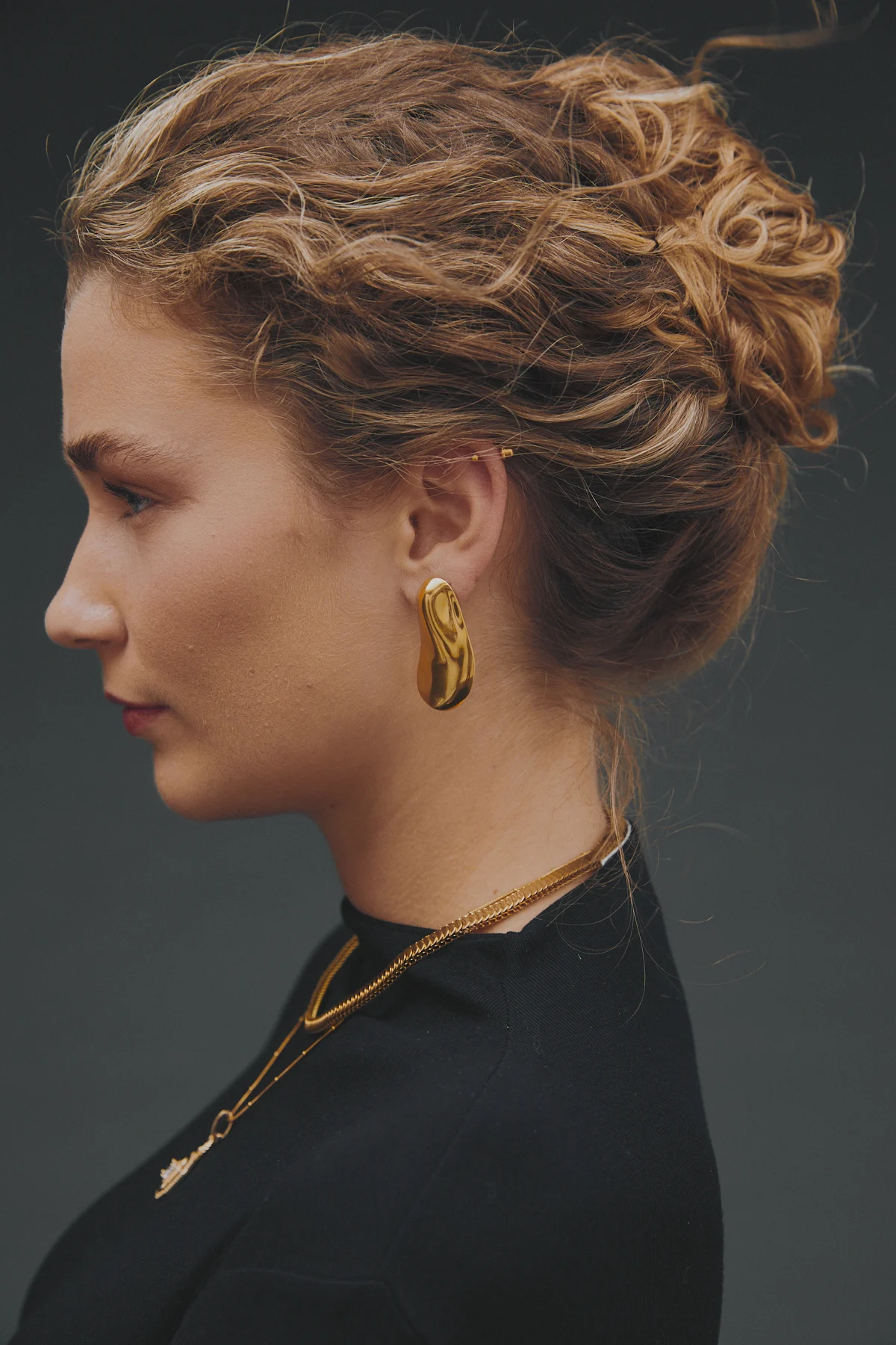 Akışkan ve organik hatlarıyla modern bir görünüm sunan bu altın renkli küpeler, minimal şıklığın en zarif hali. Hem gündüz hem gece kombinlerinizde sofistike bir dokunuş yaratır.