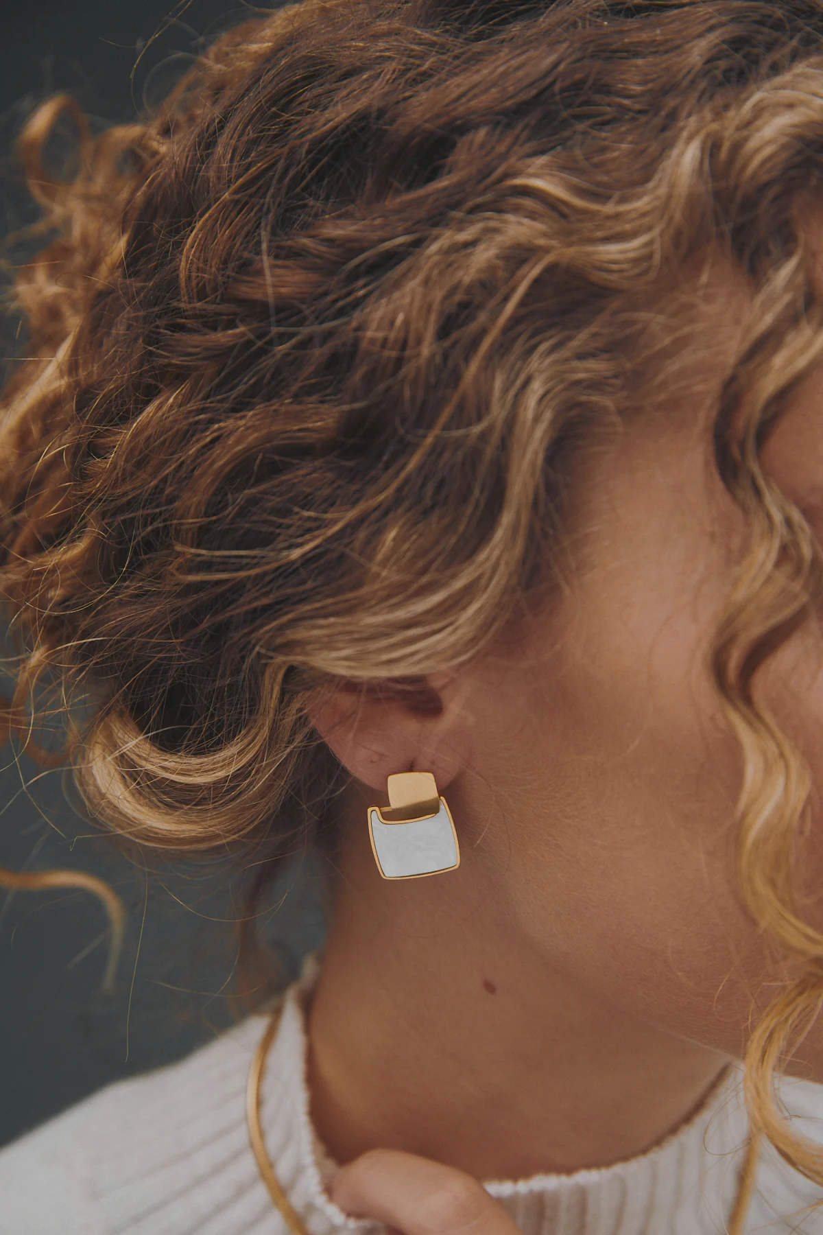 Geleneksel dokuların çağdaş bir yorumu: Kare Sedef Küpe, keskin geometrik bir çerçeveyi doğal ve ışıltılı sedefin eşsiz parlaklığıyla birleştiriyor. Mat altın rengi metalin üst bölümü, beyaz sedefin yumuşak ve dalgalı yansımalarıyla kontrast oluşturarak heykelsi bir derinlik yaratıyor; bu sanatsal parçalar, hem gündüz minimalist şıklığı hem de gece zarifliğini tamamlayacak sofistike ve zamansız bir aksesuar olarak stilinize natürel bir lüks katıyor.