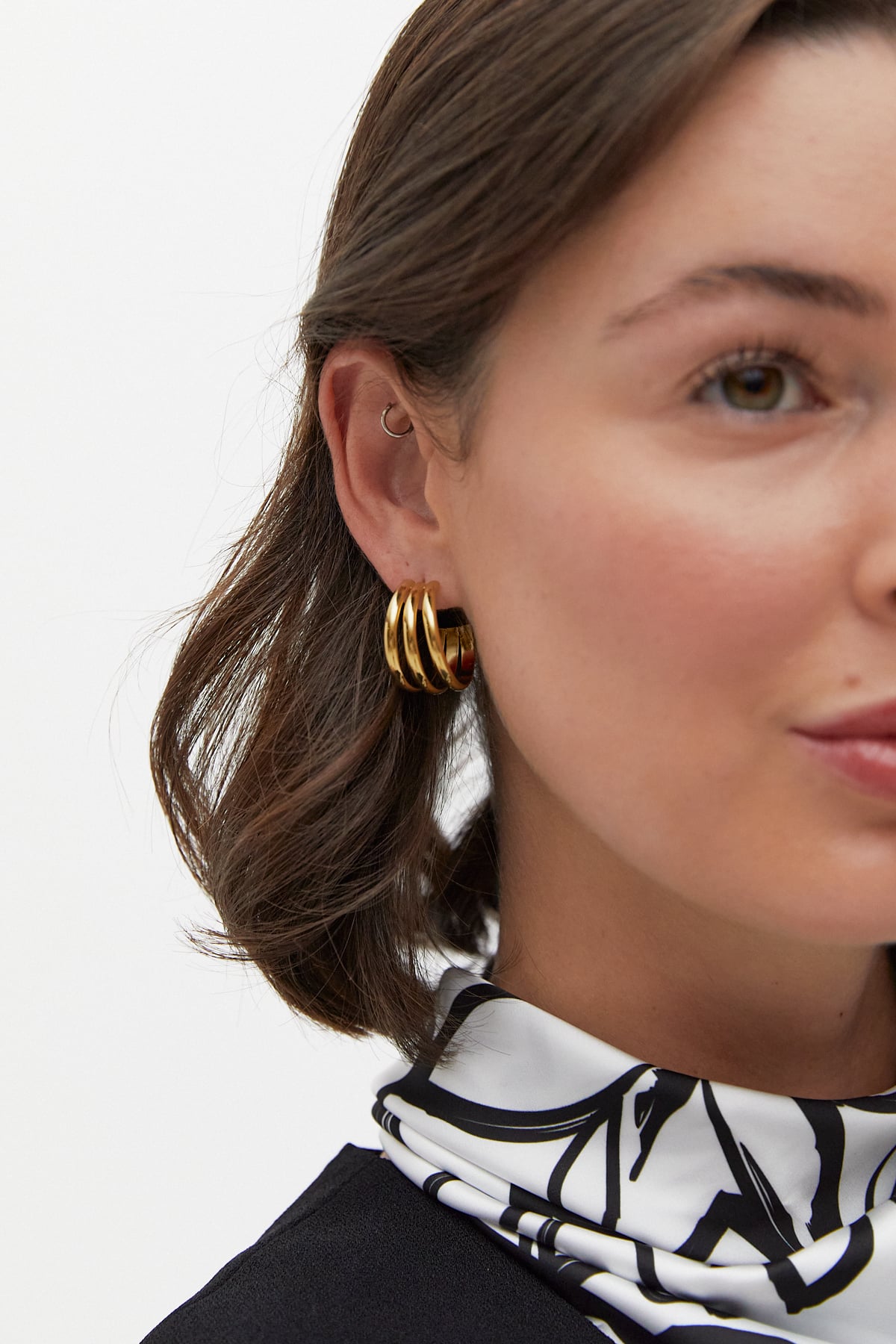 Üç Sıralı Halka Küpe, tek bir parça üzerinde birleşen ve kulağı saran heykelsi üç halka ile maksimalist bir etki yaratıyor. Akışkan ve kavisli formuyla modern bir sanat eserini andıran bu tasarım, parlak altın rengi metali hacimli bir şekilde kullanarak iddialı bir duruş sergiliyor; bu çarpıcı aksesuar, sade bir görünümü bile anında dramatik ve güçlü bir stile dönüştürerek tüm bakışları üzerinize çekecek.