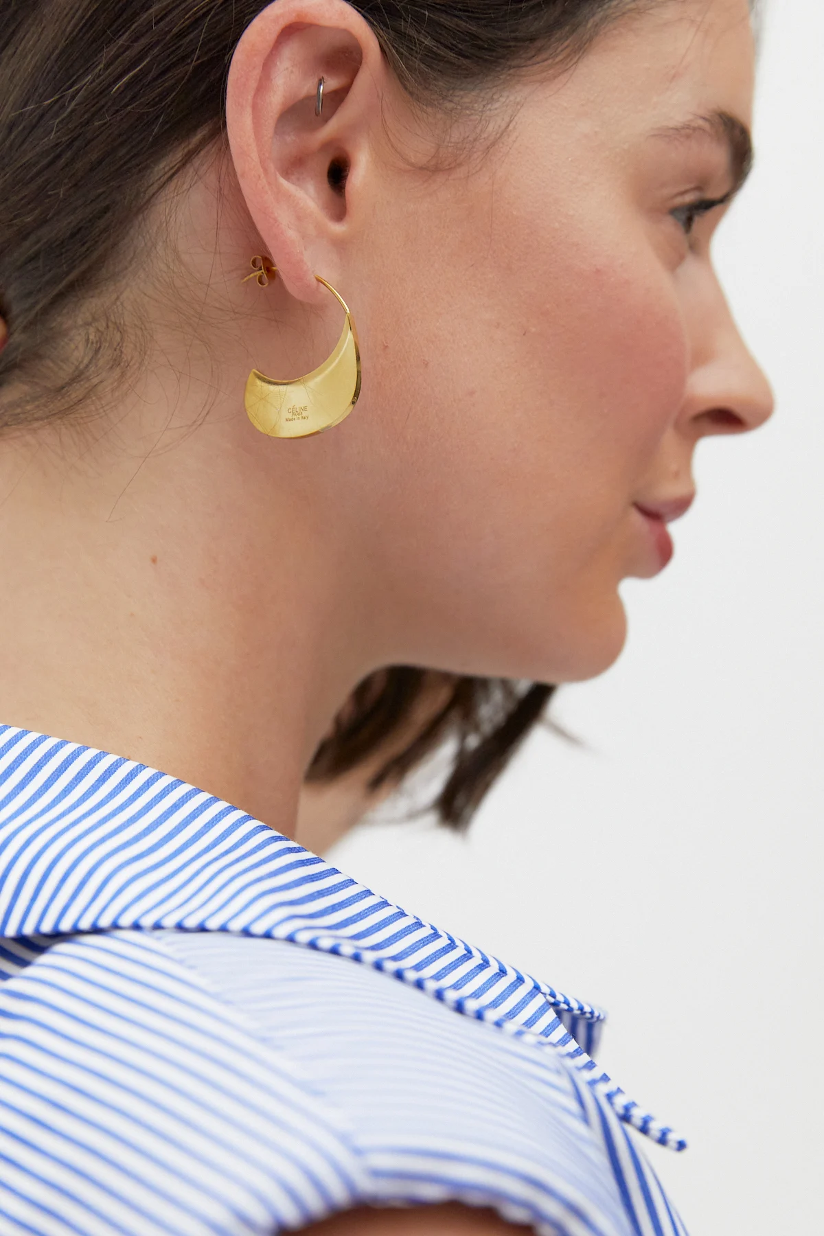 Saf minimalist lüksün vücut bulmuş hali: Altın Yay Küpe, belirgin ve akışkan yarım ay formuyla anında dikkat çeken, hacimli ve çarpıcı bir siluet sunuyor. Parlak altın rengi metalin pürüzsüz yüzeyi, ışığı mükemmel bir şekilde yansıtarak modern ve sanatsal bir hava yaratıyor; zamansız bir zarafete sahip bu heykelsi küpeler, basit bir kombini bile anında güçlü bir stile dönüştürme yeteneğine sahip.