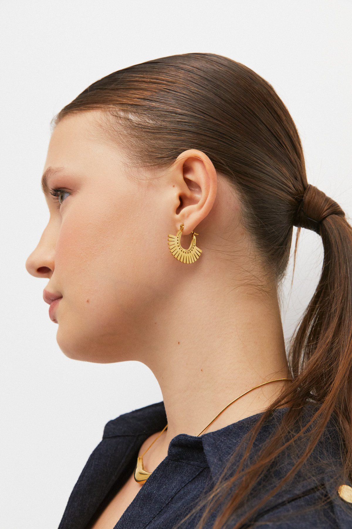 Altın tonlu, yarım güneş şeklinde tasarlanmış, üzerine küçük delik detayları eklenmiş halka küpe. Mandallı kilit sistemi ile kolayca takılıp çıkarılabilir. Hem günlük hem özel davetlerde şık bir tamamlayıcı olarak kullanılabilir.