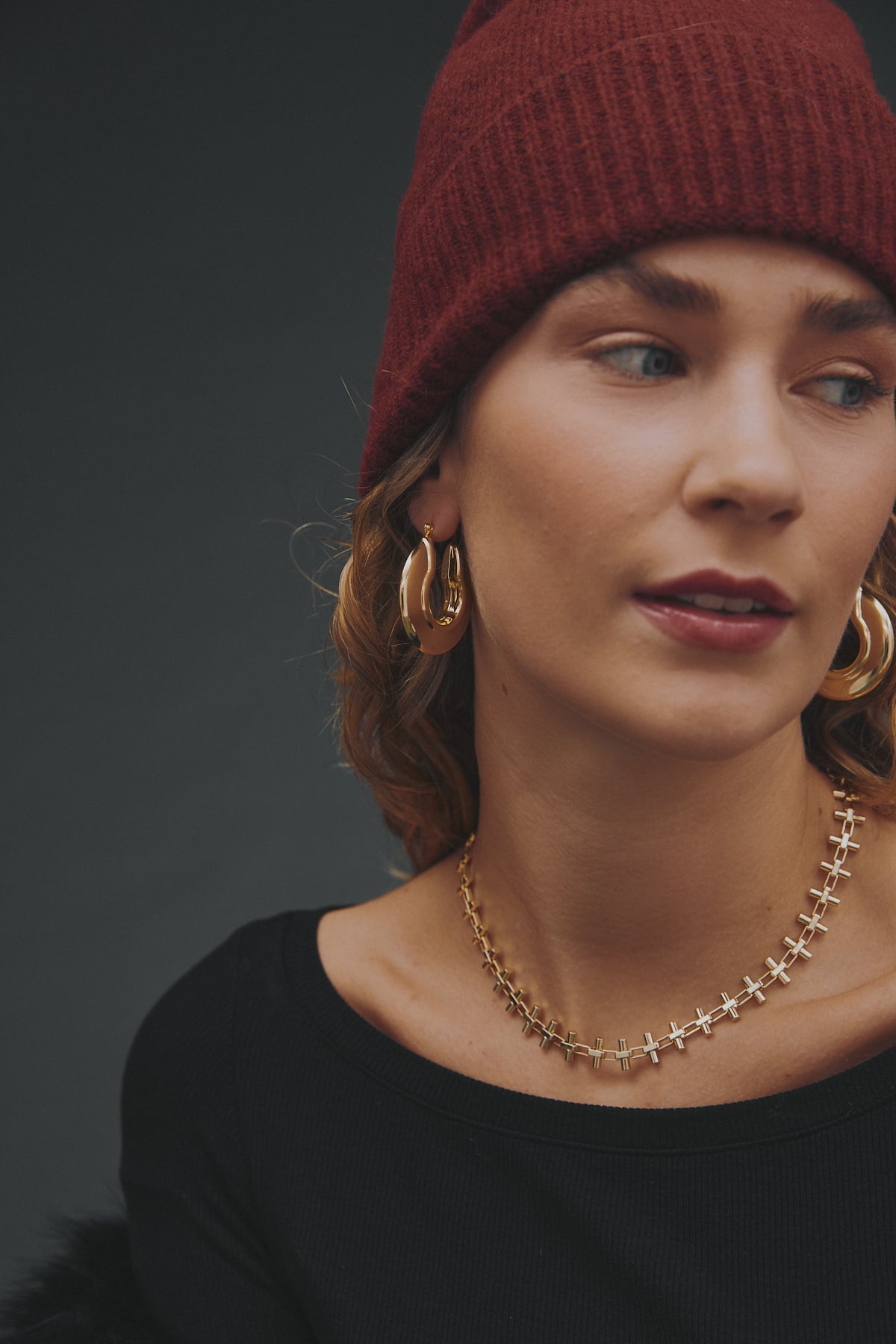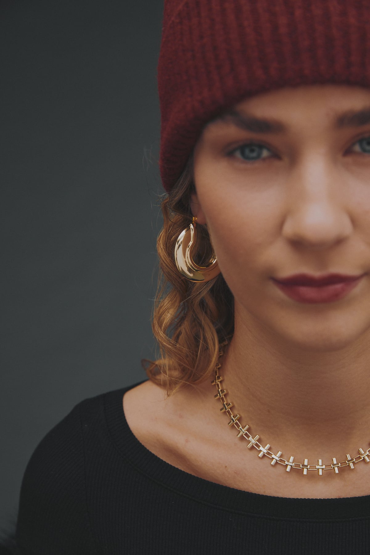 Minimal tasarıma sahip, parlak yüzeyli ve kalın formda halka küpe. Mandallı kilit mekanizması sayesinde güvenle kullanılabilir. Zamansız tasarımıyla hem günlük kombinlerde hem de özel davetlerde şık bir tamamlayıcıdır.