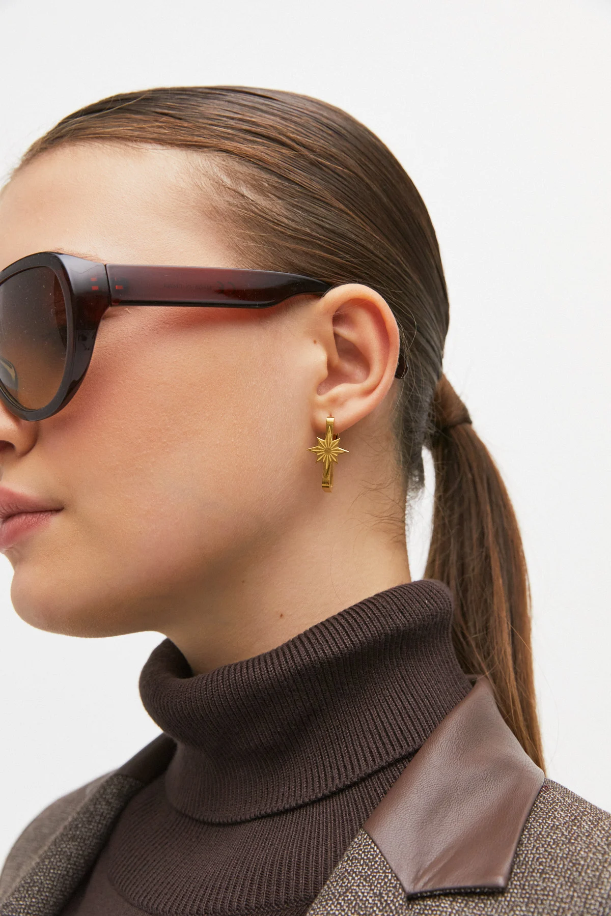 Cesur geometri ve gök temalı figürlerin enerjisini birleştiren bu altın tonlu sallantılı küpelerle stilinize iddialı bir dokunuş katın. Düz ve kalın çizgilerle oluşturulmuş modern kare halkanın ortasından sallanan üç boyutlu, pürüzsüz bir yıldız figürü; tasarıma hem modern bir yapısallık hem de dinamik bir hareket katıyor. Minimalist tasarımları seven ancak takılarında çarpıcı bir figür detayından vazgeçmeyenler için ideal olan bu küpeler, tek başına kullanıldığında bile tüm dikkatleri üzerinize çekmenizi sağlayacak güçlü bir ifade parçasıdır.