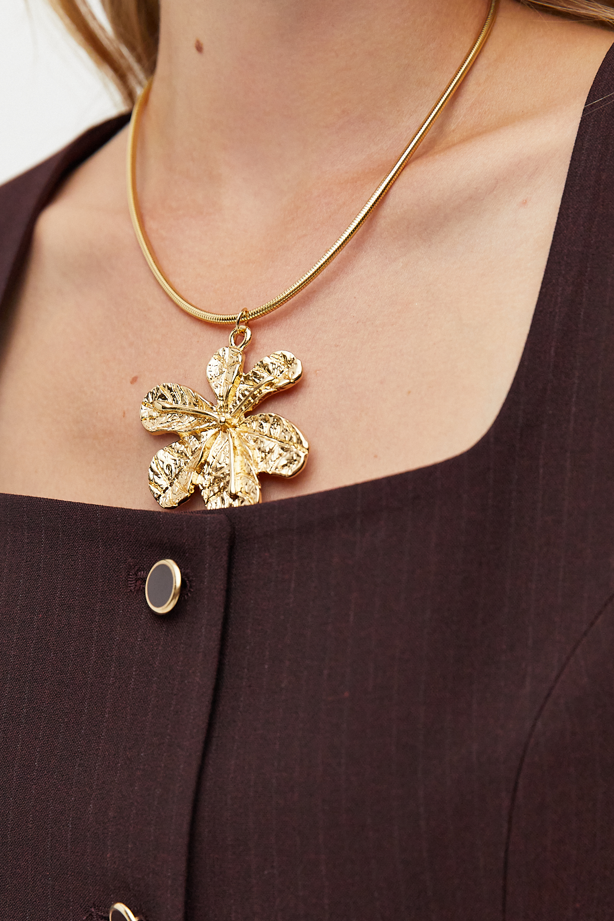 Kabartma Çiçek Detaylı KolyeAltın tonlu yaka kolye, hacimli ve kabartma dokulu çiçek formu ile dikkat çeker. Feminen ve güçlü bir ifade sunar, sade elbiselerle ya da gömleklerle çarpıcı bir kontrast yaratır.