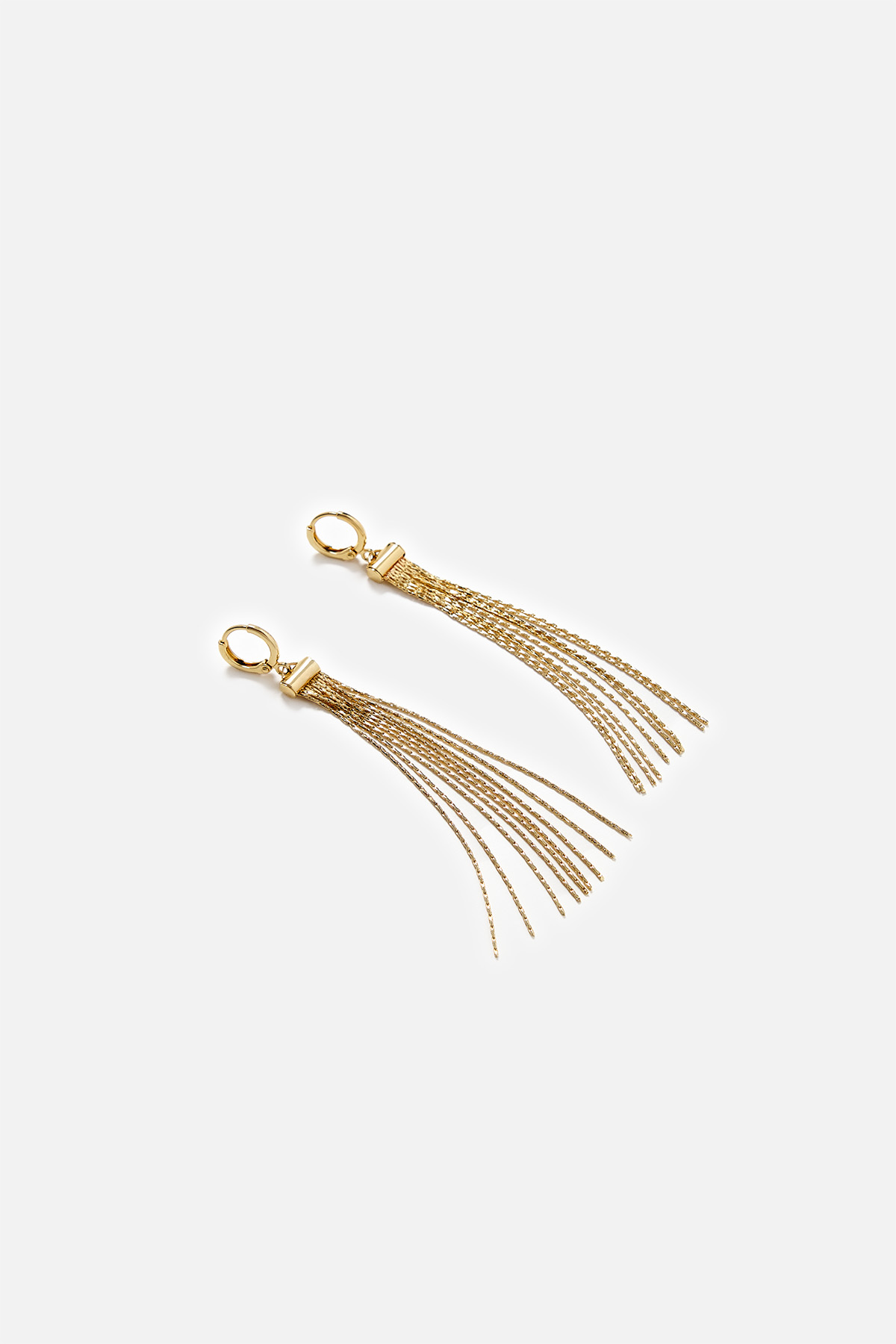 Bu gold ve gümüş tonlu uzun sallantılı küpe, çoklu zincirlerin oluşturduğu hacimli ve akışkan saçak formuyla sofistike bir hareket sunuyor. Her bir zincirin ışıltısı, küpenin genelinde zengin ve dinamik bir parlaklık yaratarak, kulakta göz alıcı bir şelale etkisi bırakır. Gece şıklığınıza ihtişam katmak veya özel anlarınızı daha da vurgulamak için ideal olan bu küpe, stilinize dramatik ve modern bir dokunuş ekler.