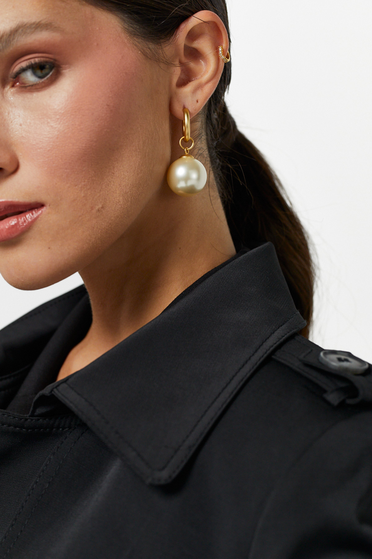 Zamansız zarafeti cesur bir formla birleştiriyor. Parlak altın rengi kilitli halkanın altına asılı duran, büyük boyutlu ve kremsi parlaklıktaki inci top detayı, klasik bir parçayı çağdaş ve dikkat çekici bir aksesuara dönüştürüyor. Minimalist bluzlardan abiye elbiselere kadar her türlü kıyafetle kusursuzca eşleşerek, anında lüks ve göz alıcı bir hava katmak isteyenler için vazgeçilmez bir parçadır.