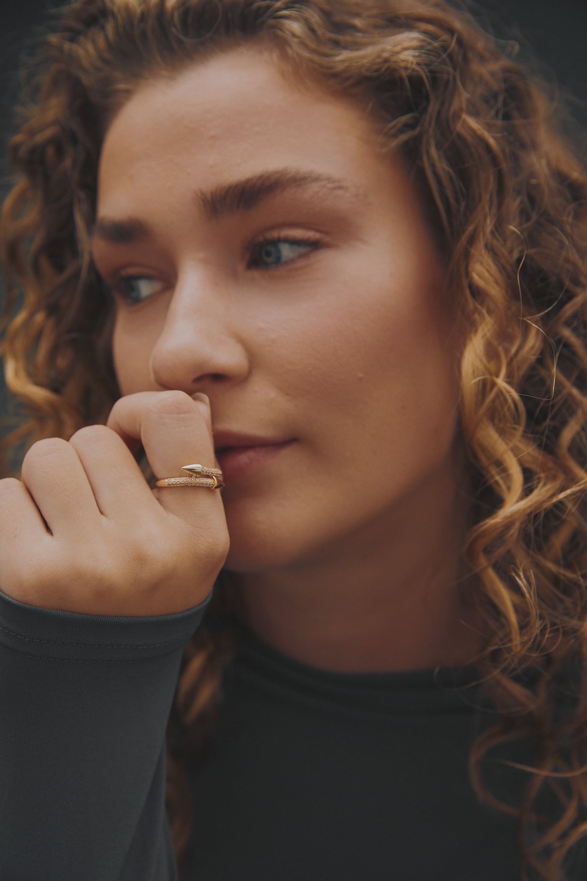 Modern ve cesur bir görünüm sunan bu yüzük, iki uçlu sivri metal detayı ve ince taş işlemeleriyle sofistike bir kontrast yaratır. Altın tonlu yapısı sayesinde hem minimal hem de iddialı kombinlerde rahatlıkla kullanılabilir.