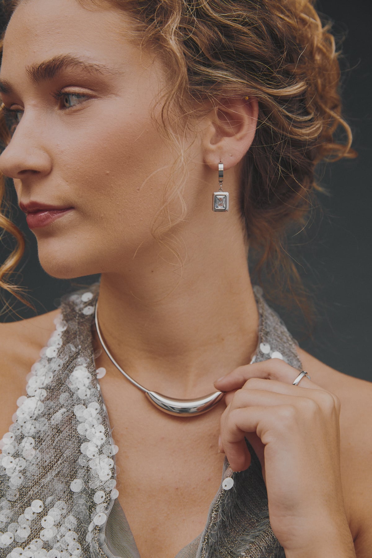 Minimalist tasarımıyla öne çıkan bu gümüş renkli halka küpe, dikdörtgen kesim taş detayıyla zarif bir görünüm sunar. Günlük kombinlerinizi tamamlamak veya özel günlerde şıklığınıza modern bir dokunuş katmak için idealdir.