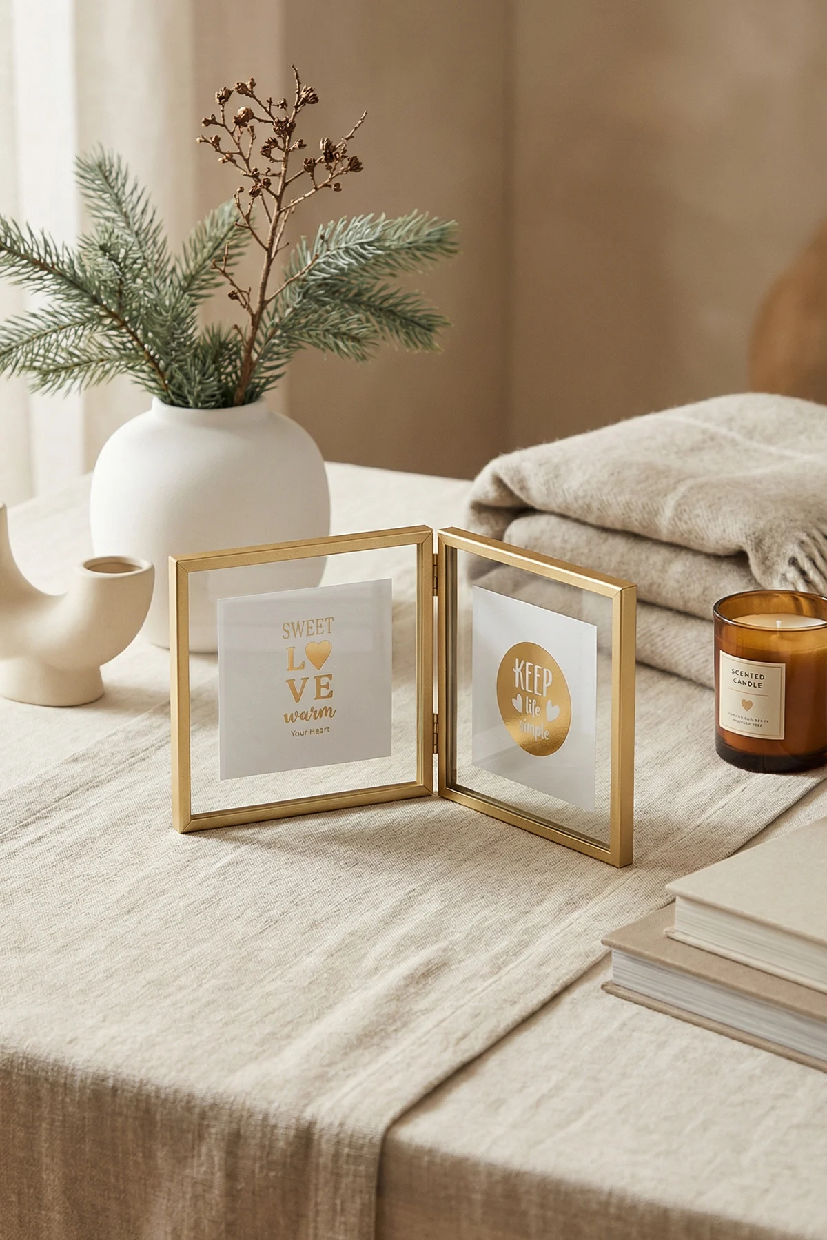 Minimalist ve göz alıcı bir sunum arayanlar için ideal. İki kare fotoğraf çerçevesi, zarif bir menteşe ile bağlanarak fotoğraflarınızı yan yana şık bir diptik (ikili eser) halinde sergilemenizi sağlar. İnce, altın rengi metal çerçeve ve şeffaf cam paneller sayesinde fotoğraflarınız adeta odanın içinde süzülüyormuş gibi görünür. Hem yatay hem de dikey yüzeylerde kolayca konumlandırabilir, en değerli anılarınızı bir arada tutabilirsiniz.