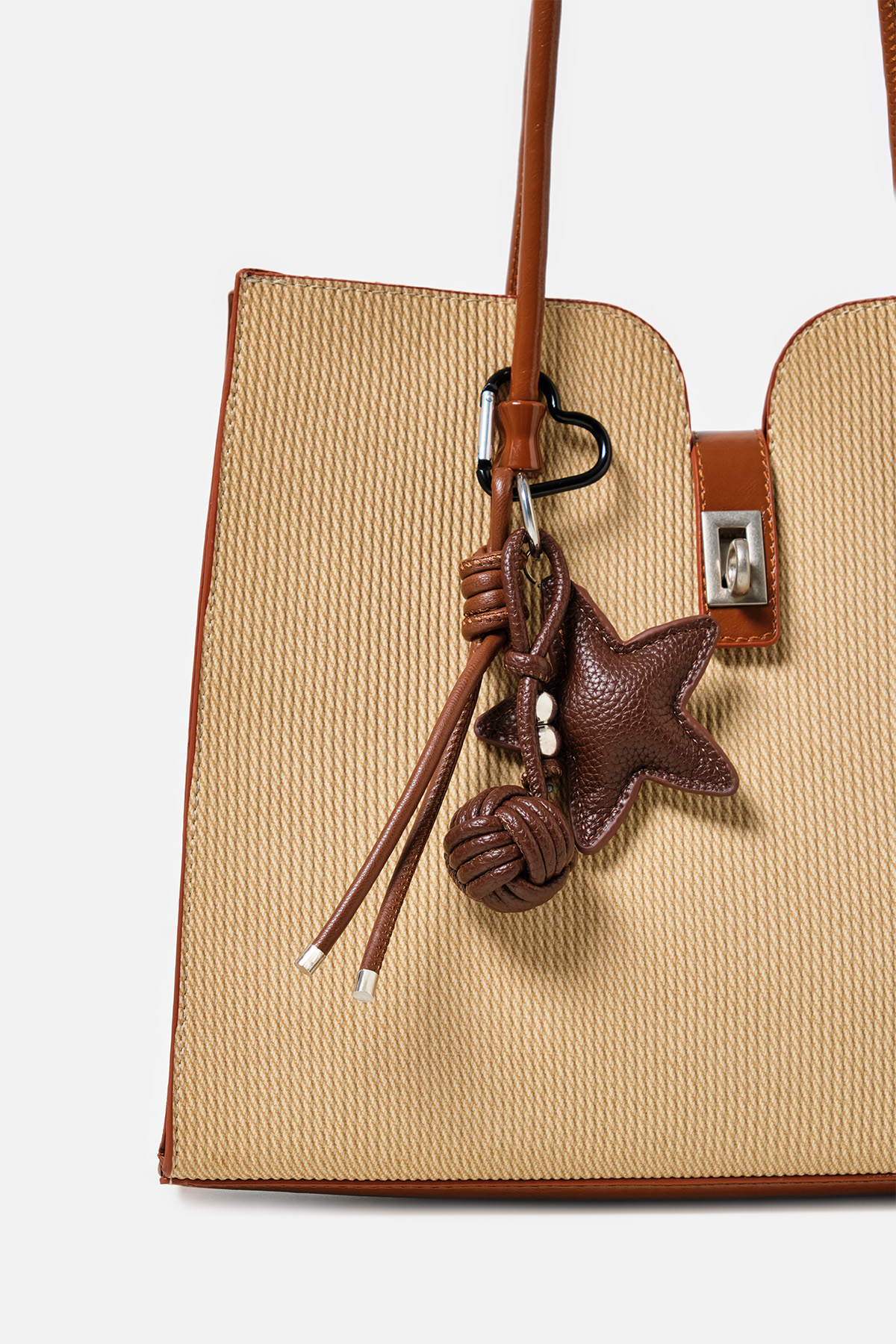 Sıcak kahverengi tonuyla öne çıkan bu charm, yıldız figürüyle modern ve özgün bir görünüm sunar. Deri dokusu, örgü detaylı top ve metal boncuk süslemeleriyle tamamlanarak şık bir bütünlük oluşturur. Kalp şeklindeki karabina sayesinde anahtarlık ya da çanta süsü olarak rahatça kullanılabilir.