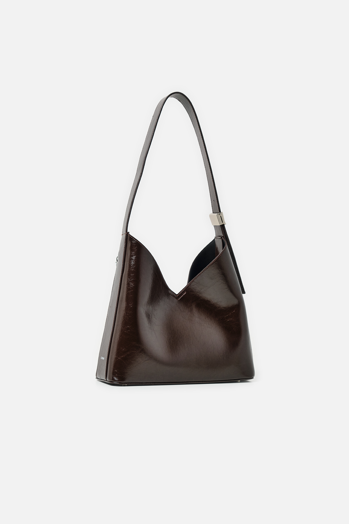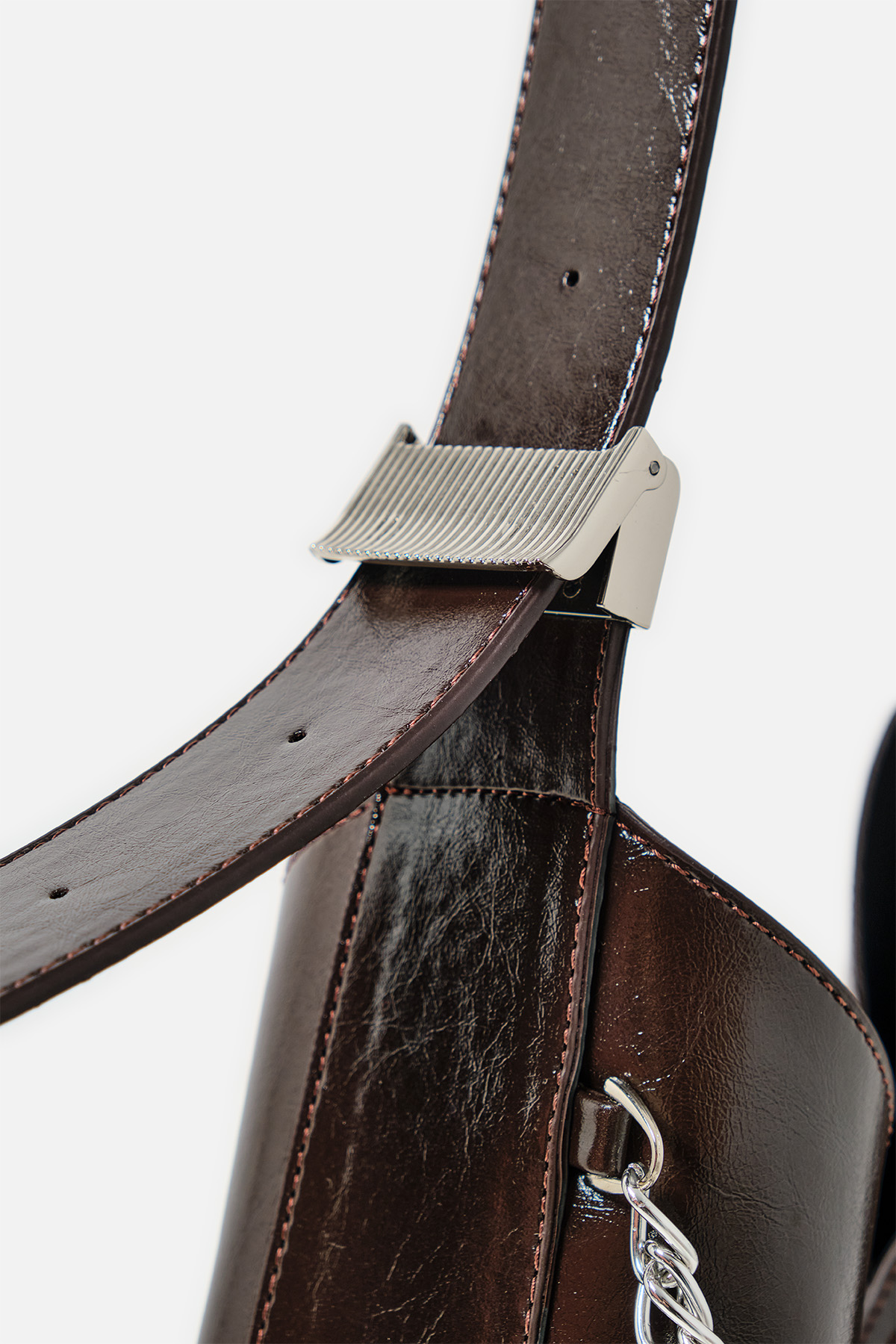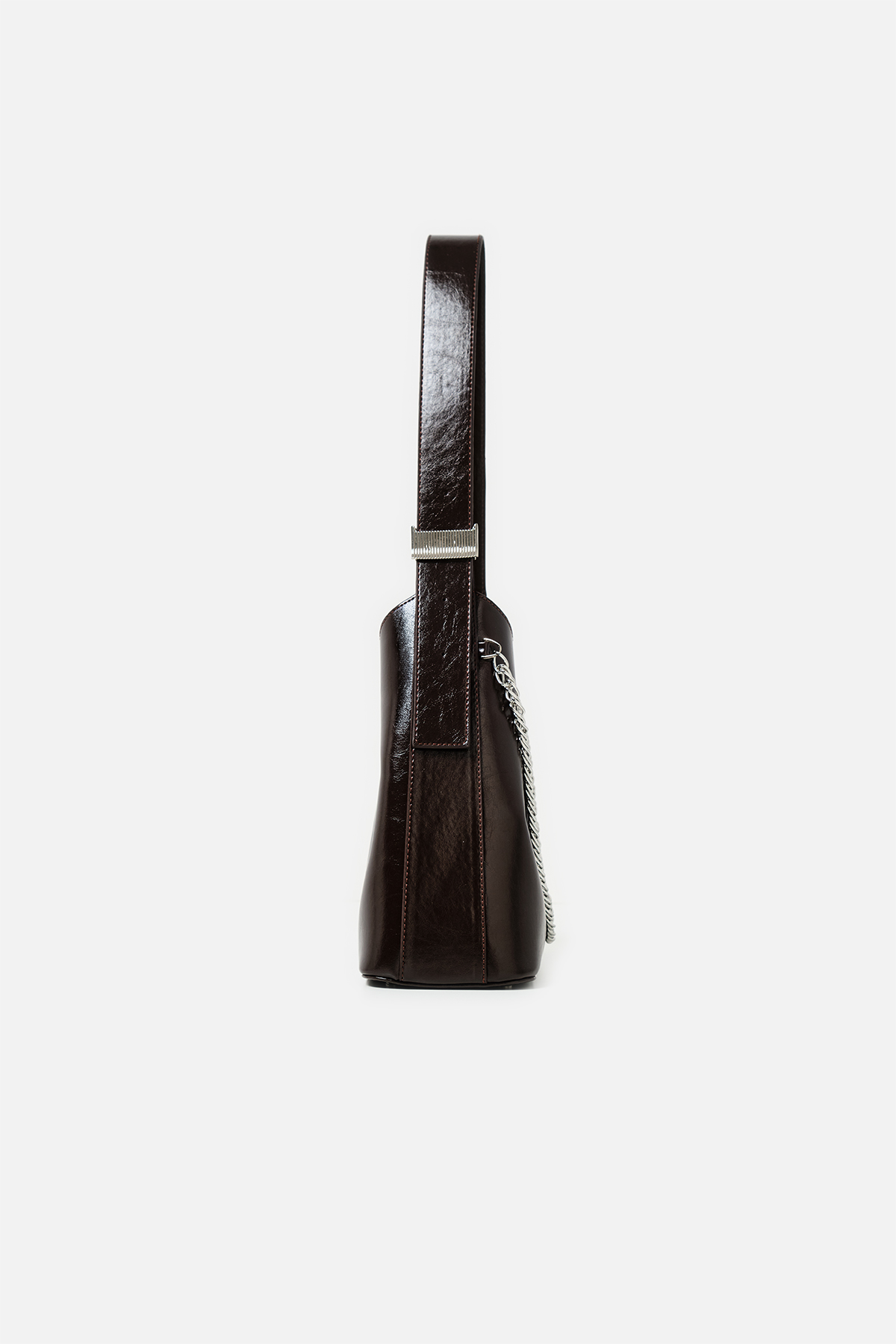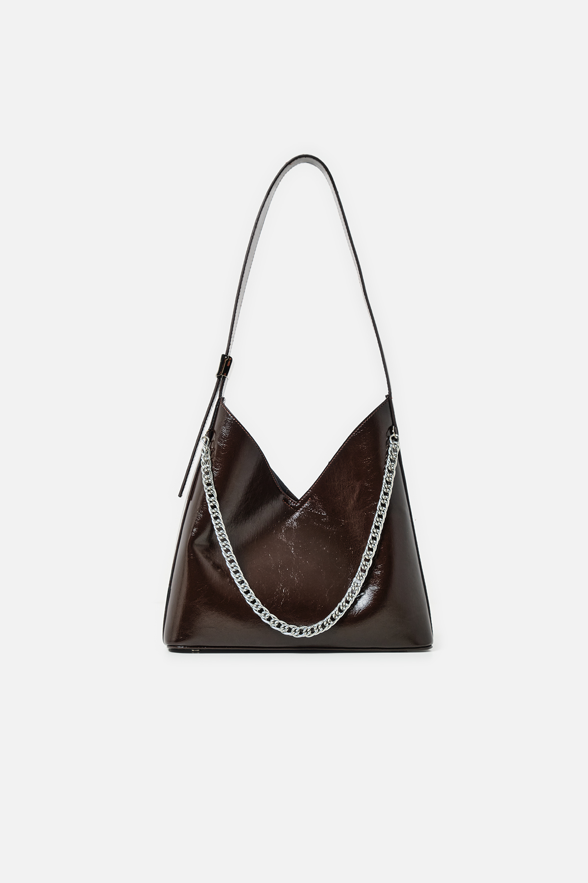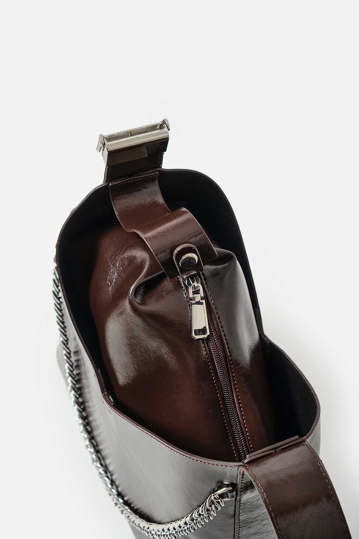 Parlak deriden ön kısmında metal zincir detayı iç kısmında aynı deriden yavrusu bulunan omuz askıı uzunluğu metal aparatı ile değiştirilebilen omuz çantası.