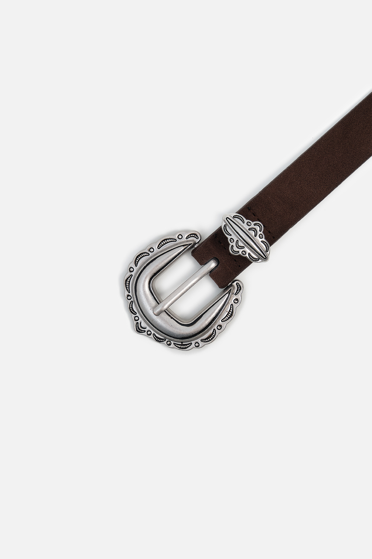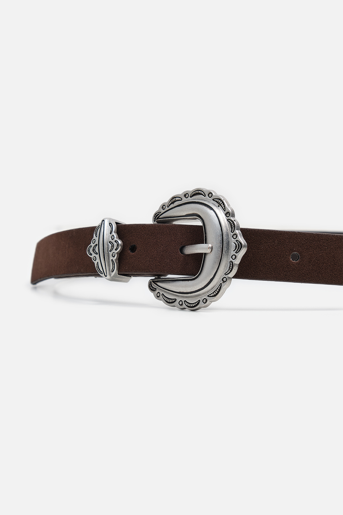 Vahşi batı ruhunu modern şıklıkla buluşturan bu kahverengi süet kemer, detayların büyüsüyle dikkat çeker! Kadifemsi dokusuyla yumuşacık, antik gümüş rengi işlemeli tokasıyla ise göz kamaştırıcı. Her kombine karakter katar, özgün bir stilin imzası olur.