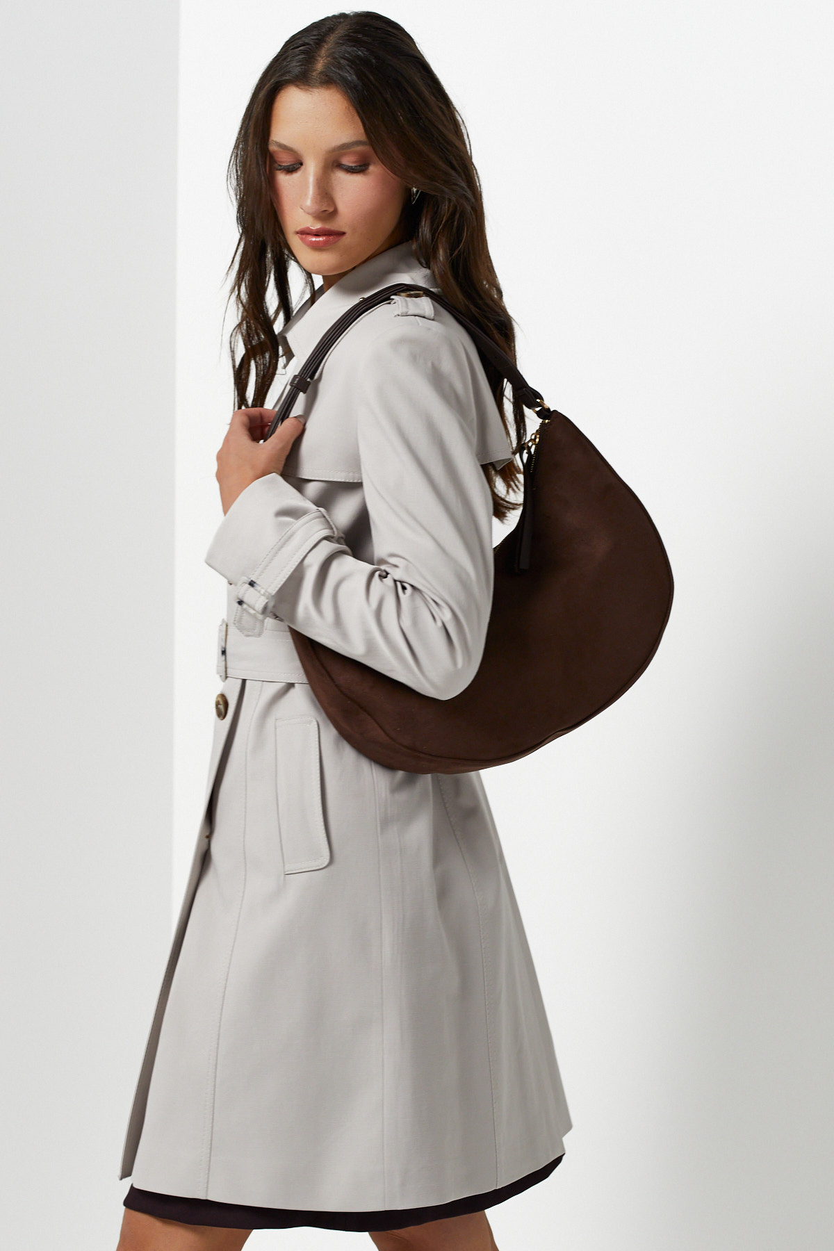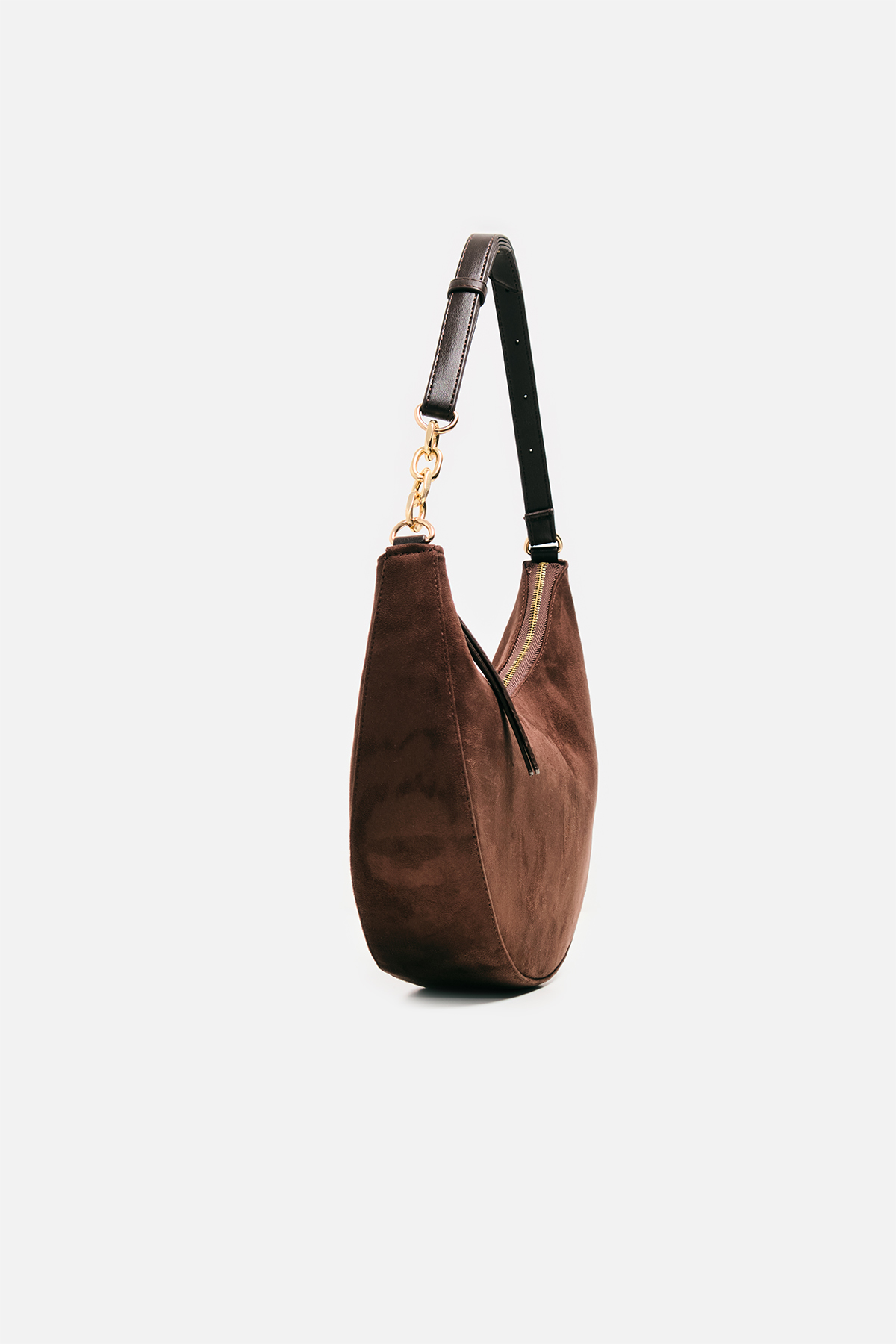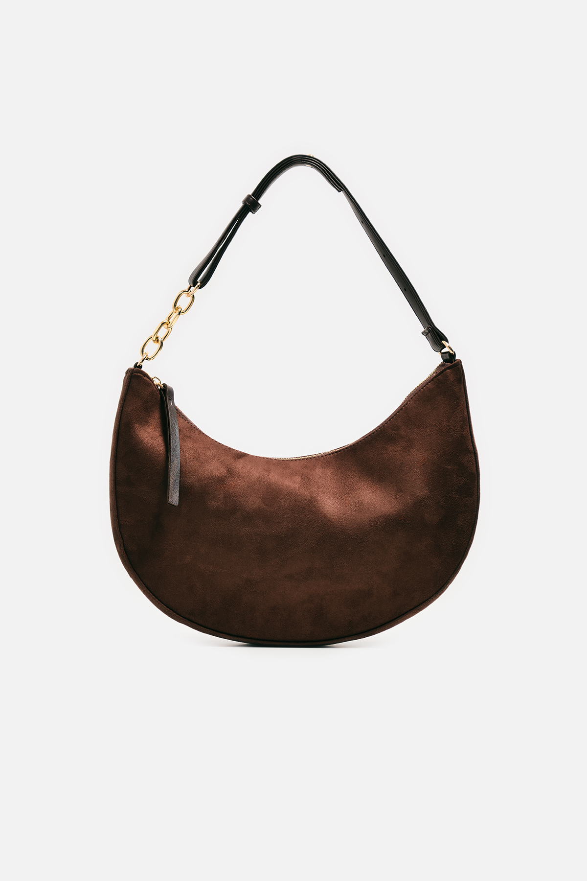 Modern yarım ay (hobo) formuyla dikkat çeken bu tasarım, yüksek kaliteli suni süet dokusuyla stilinize yumuşak ve şık bir dokunuş katıyor. Hem doğa dostu tercihlere hitap eden hem de estetikten ödün vermeyen yapısıyla günün her saatinde yanınızda.