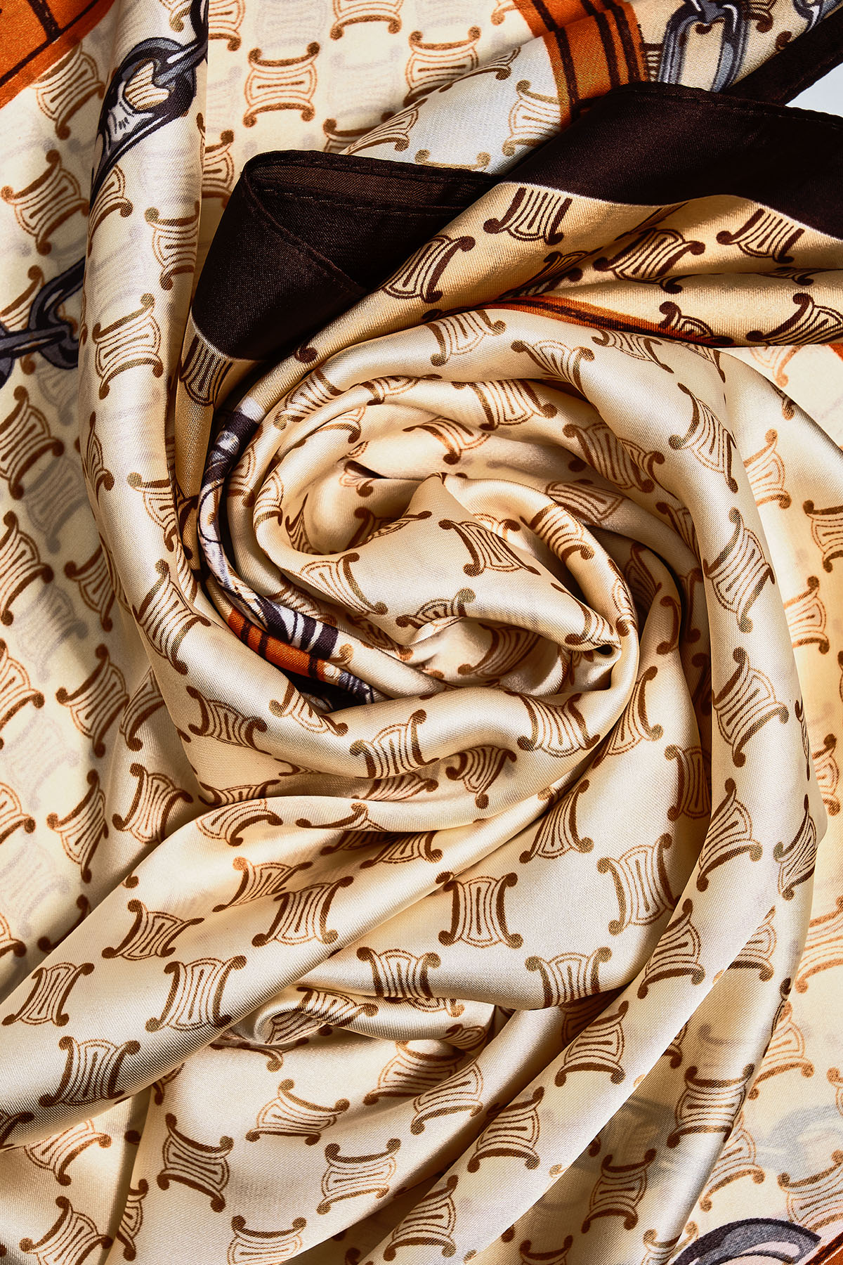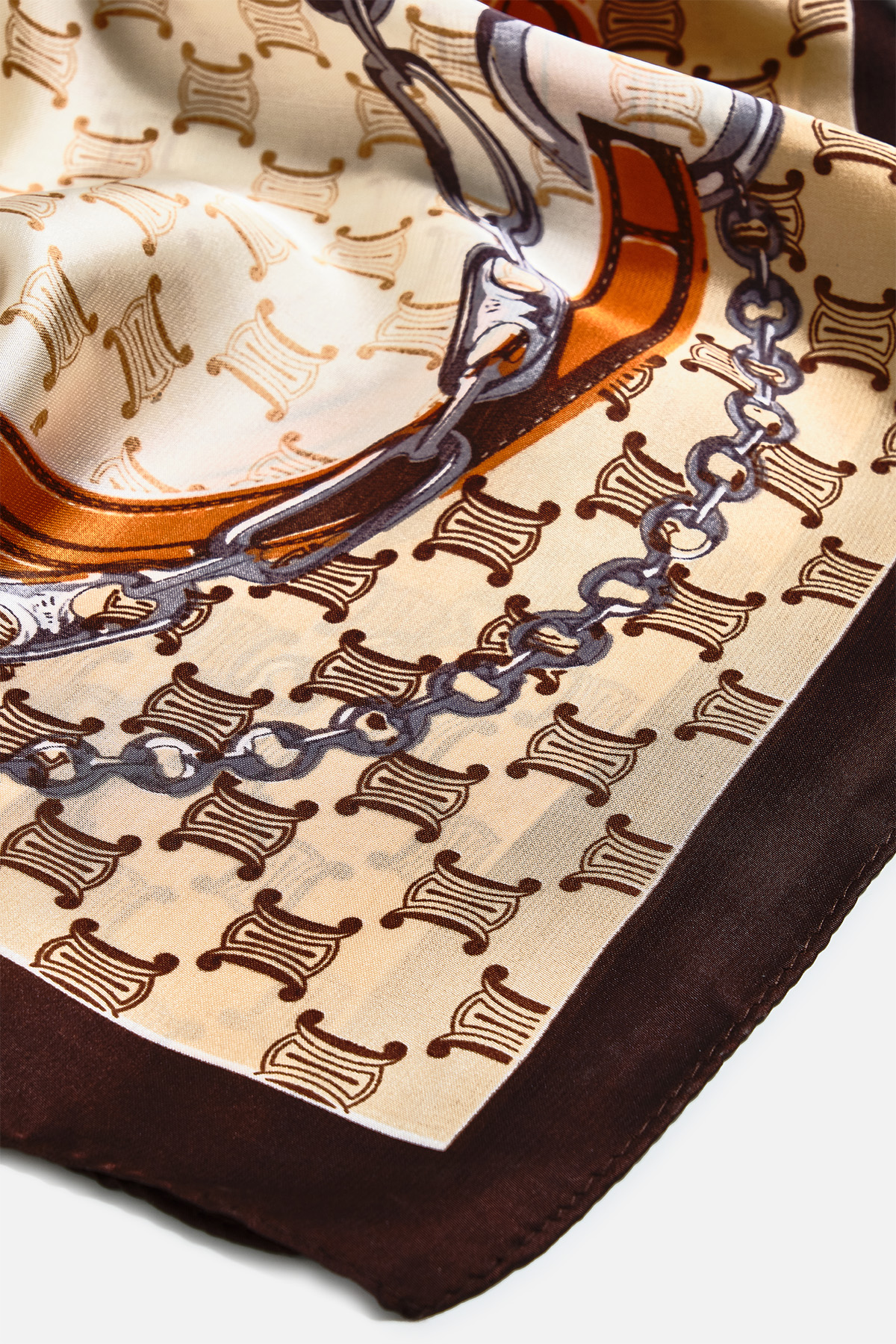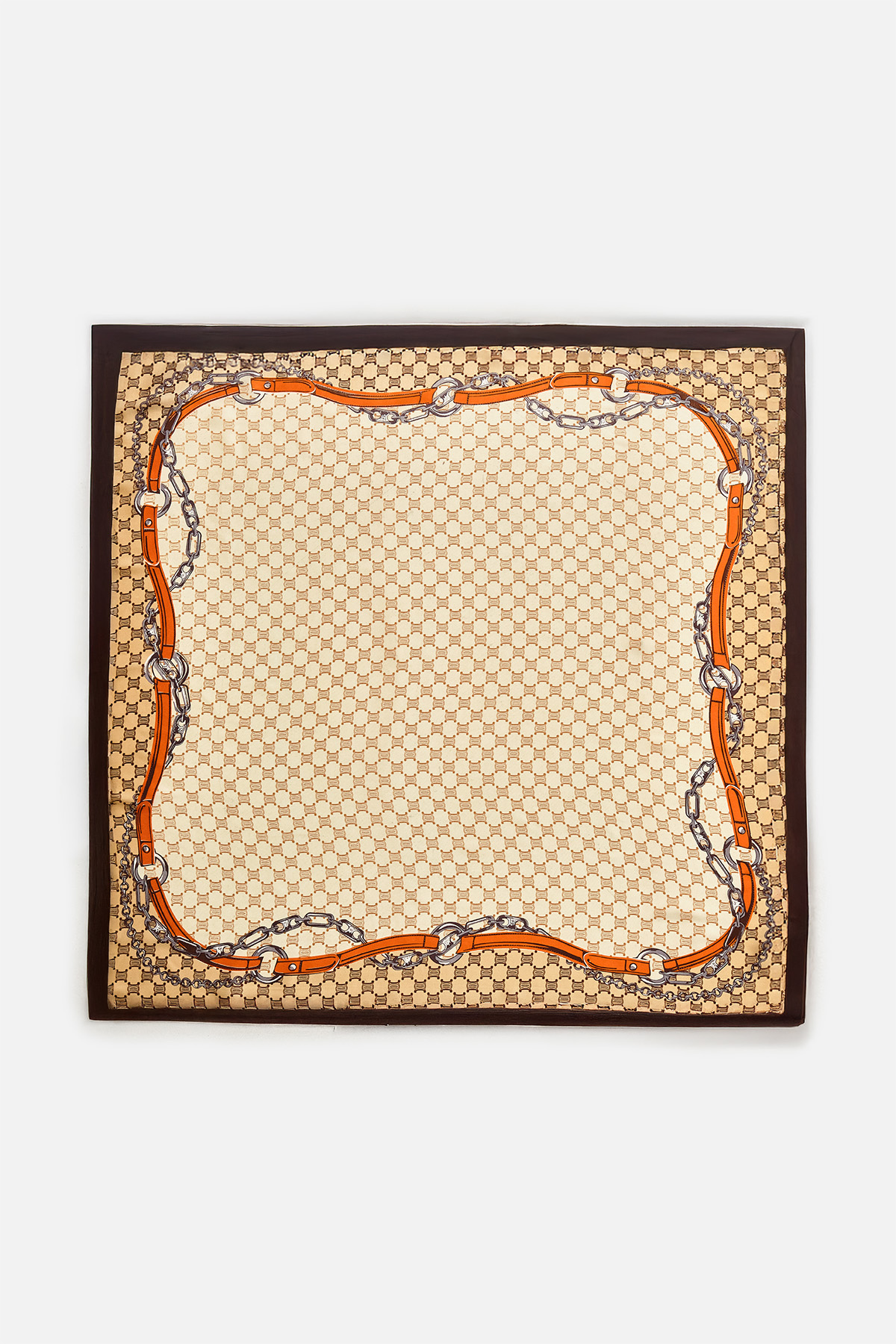 Lüksün sessiz çığlığı: Bej zemin üstüne ince monogram desen, turuncu deri-zincir çerçeve ve kahve bordürle tamamlanmış. İpeksi dokusuyla saçına, boynuna ya da çantana değdiği anda quiet luxury havası. Katla, bağla, sar; her hareketinde kombinin en pahalı parçası o olsun.