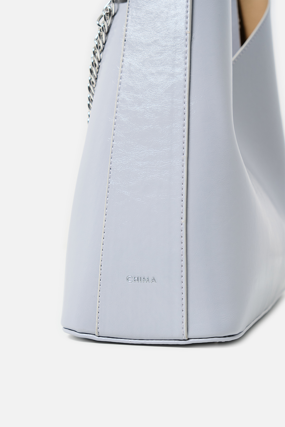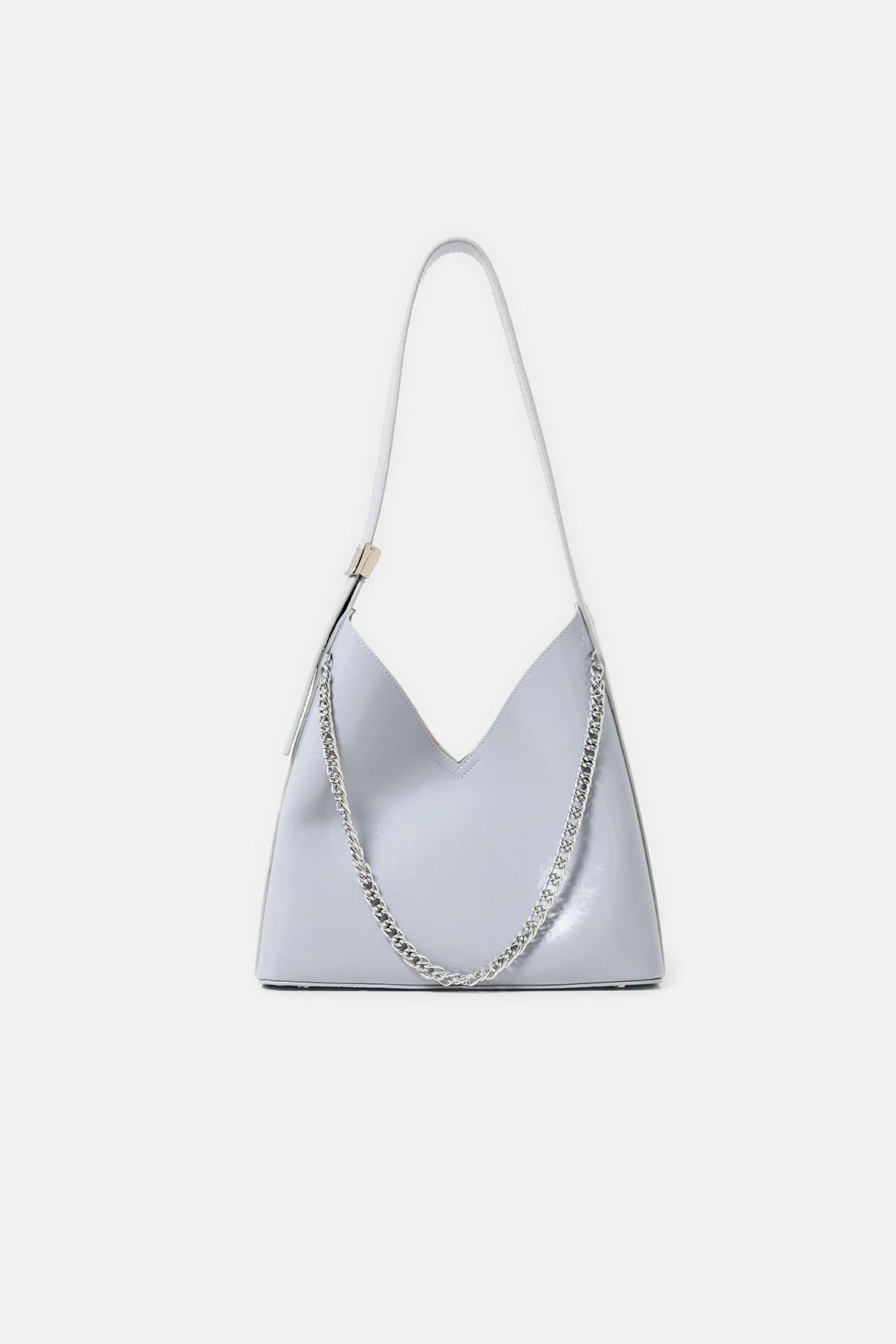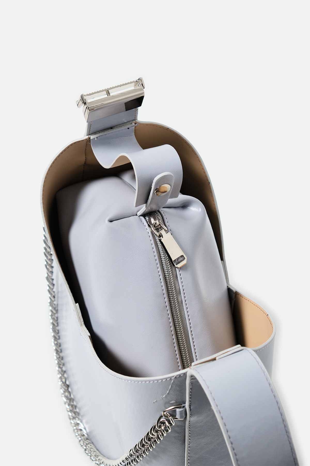 Parlak deriden ön kısmında metal zincir detayı iç kısmında aynı deriden yavrusu bulunan omuz askıı uzunluğu metal aparatı ile değiştirilebilen omuz çantası.
