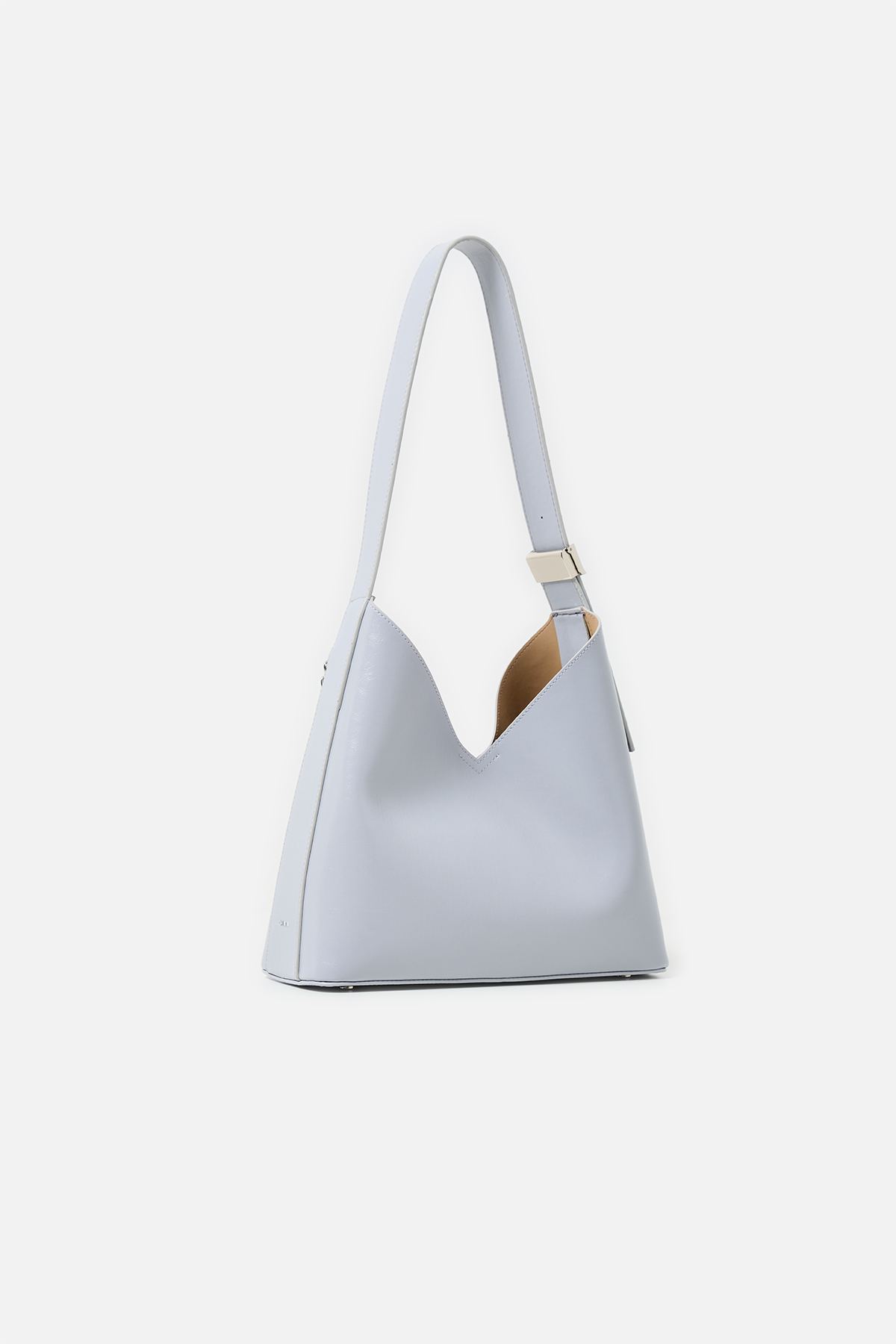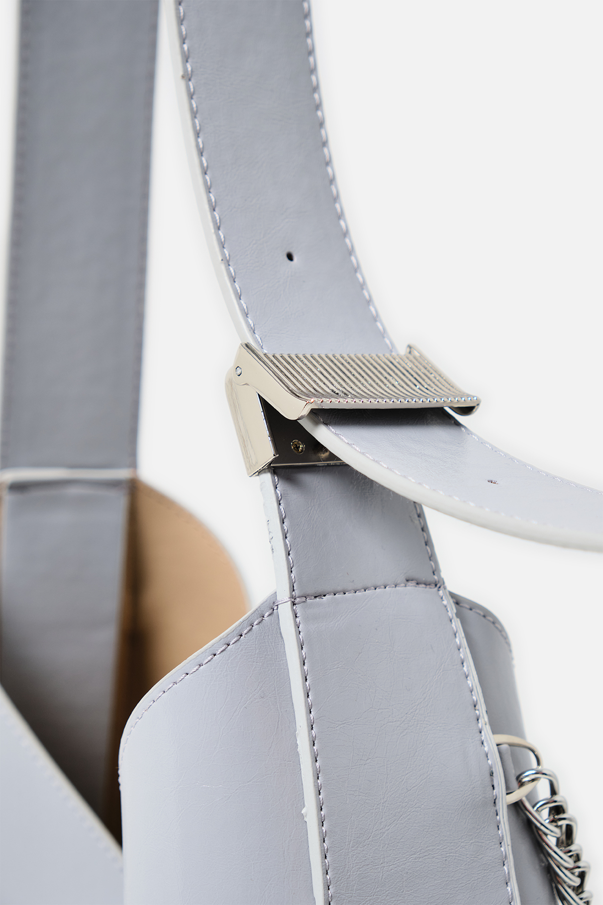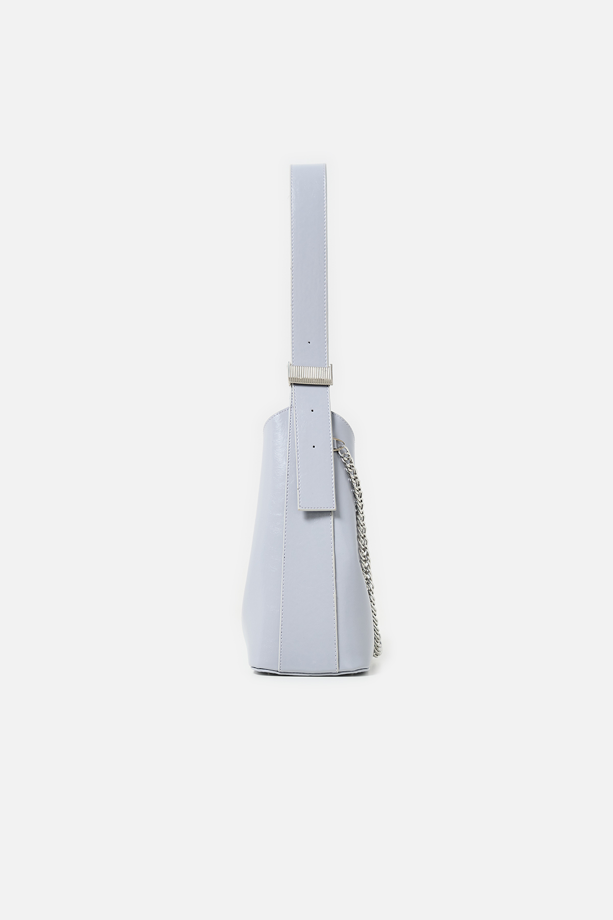 Parlak deriden ön kısmında metal zincir detayı iç kısmında aynı deriden yavrusu bulunan omuz askıı uzunluğu metal aparatı ile değiştirilebilen omuz çantası.