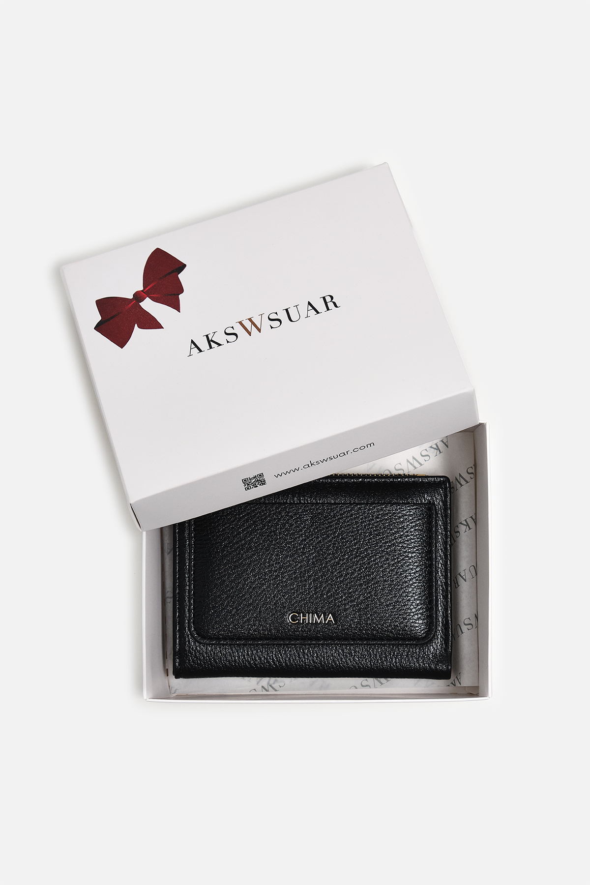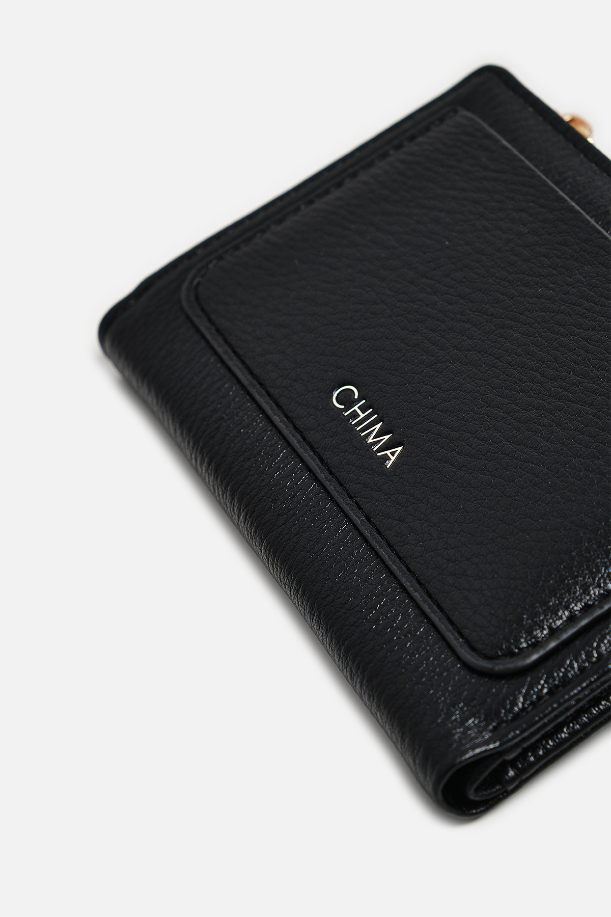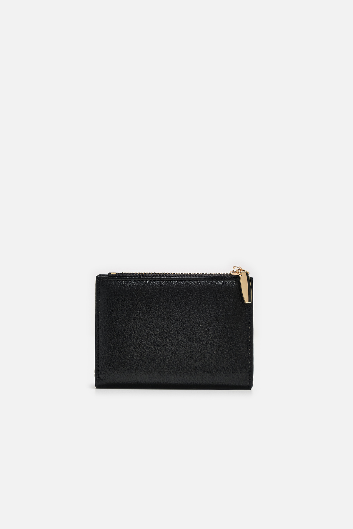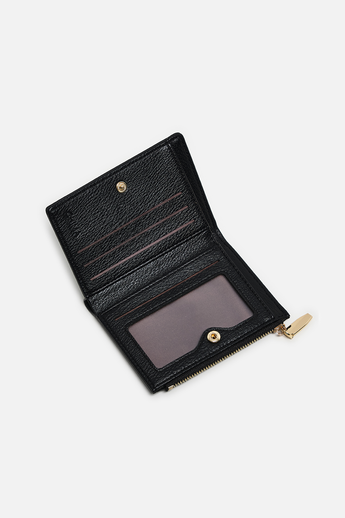 Dokulu deri görünümlü dış yüzey. Altın rengi fermuar tasarımına ve çıtçıtlı kapama ile iç yüzeyde dört adet kart yuvasına sahip.