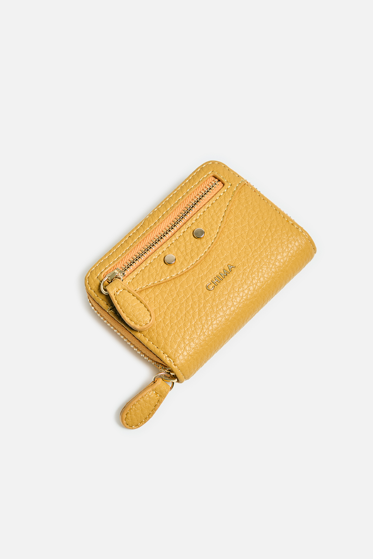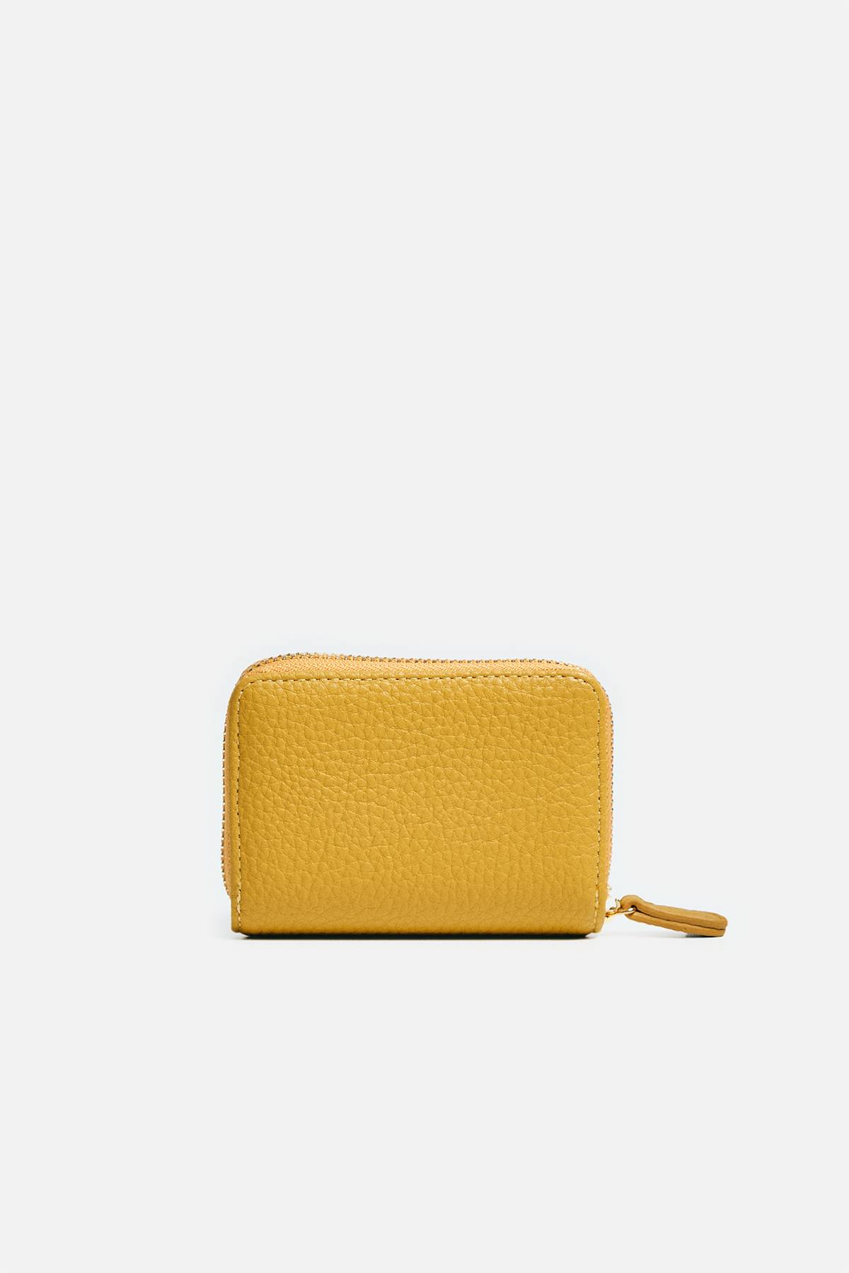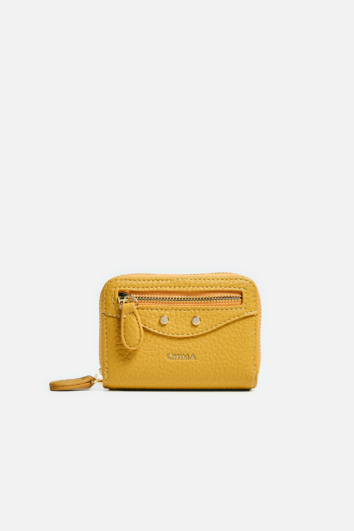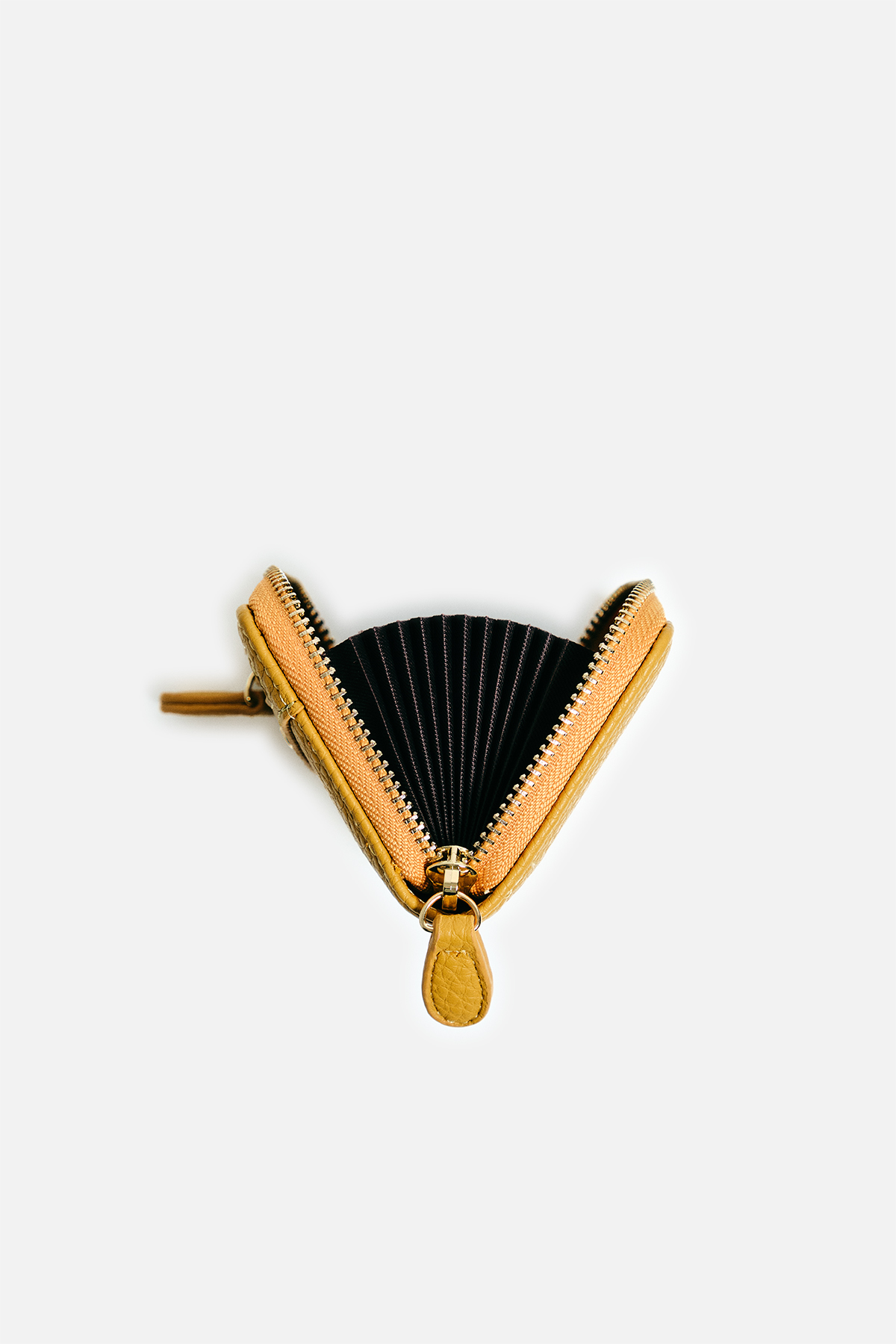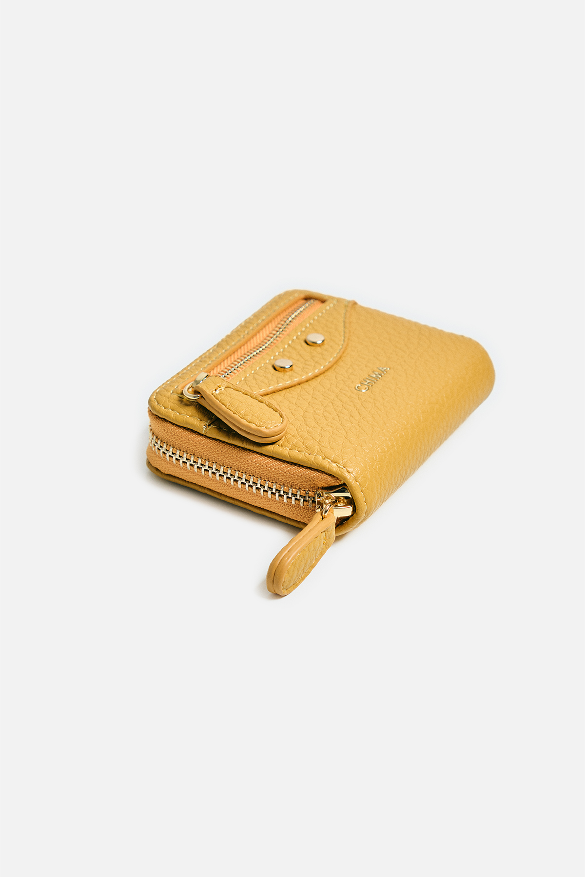 Dokulu deri görünümlü dış yüzey. Ön yüzde katmanlı tasarım, fermuar ve iki adet dairesel motif bulunuyor. İç yüzeyde akordiyon tasarım.