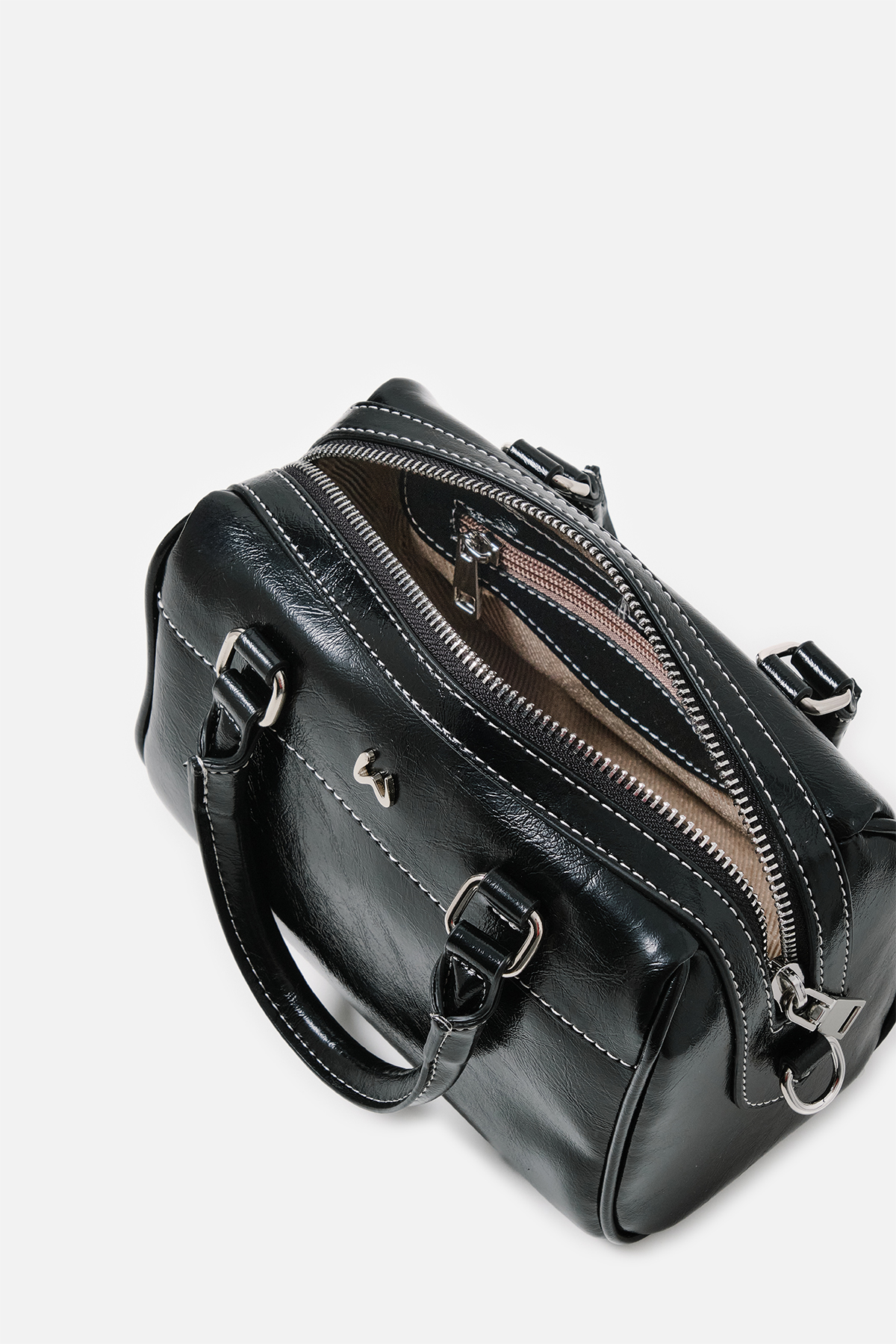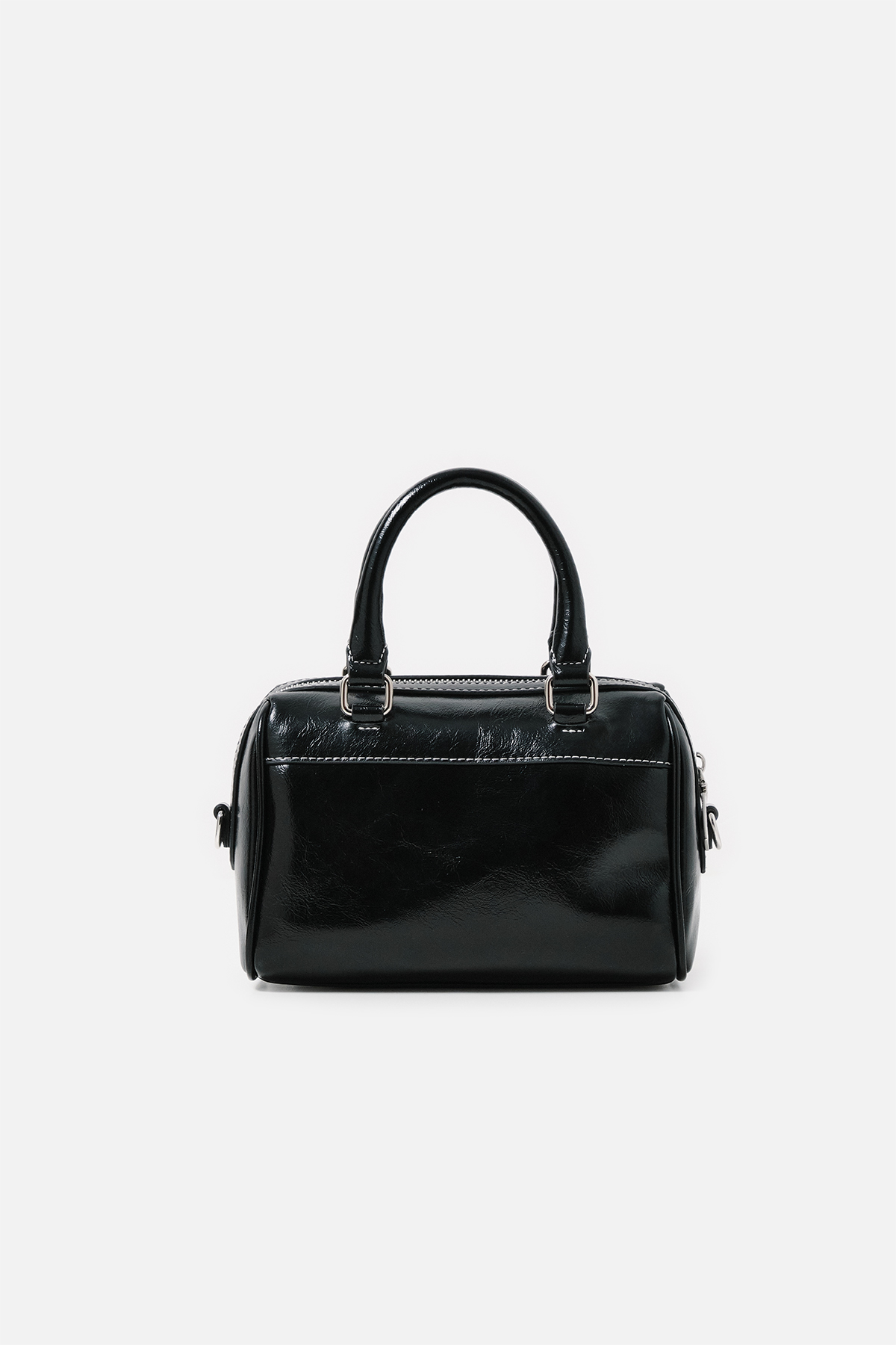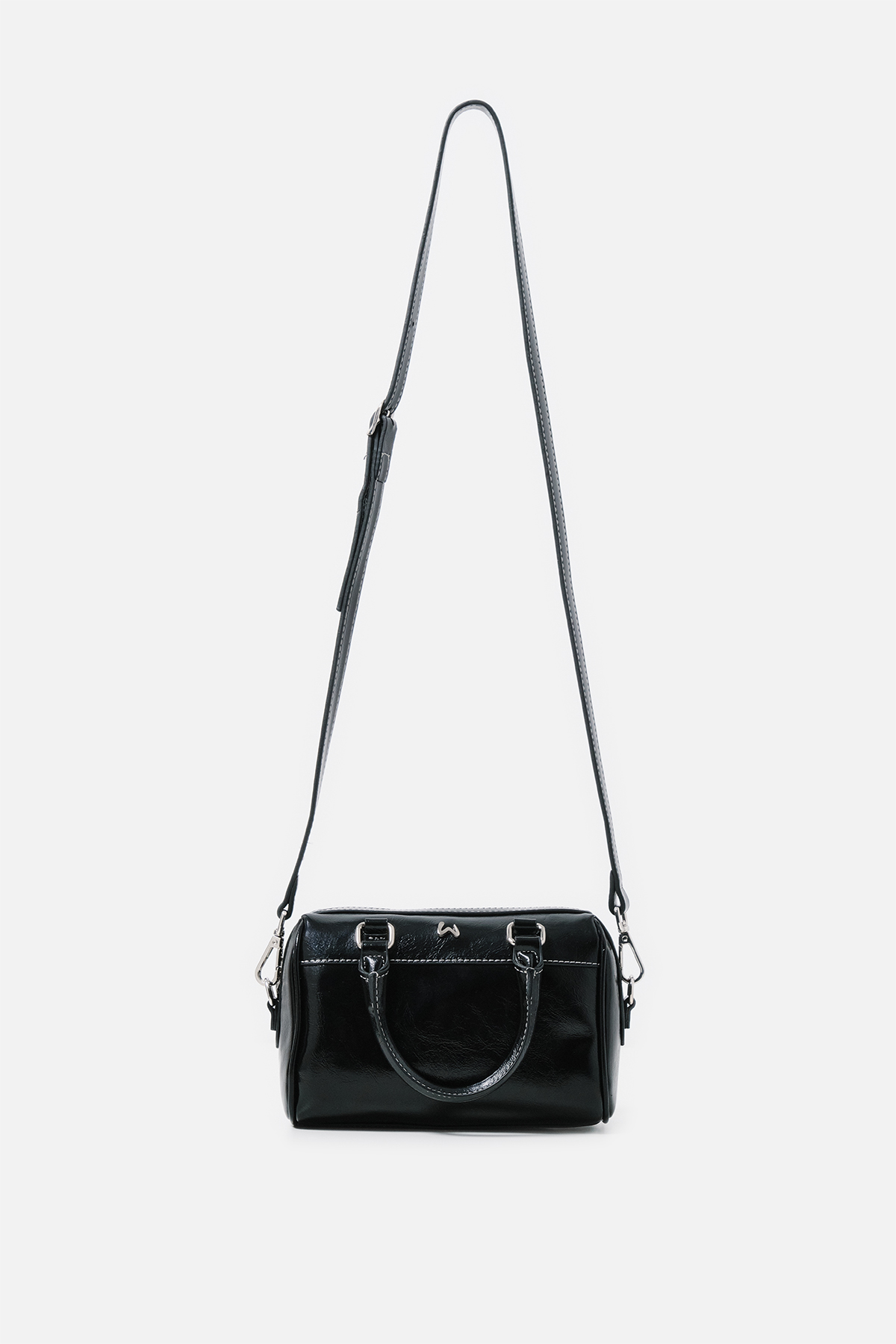 Mat yumuşak suni deriden çapraz askılı mini çanta. Gümüş rengi aksesuar detaylar. Fermuarlı,astarlı,iç cepli. Ayarlanabilir çapraz askı eklentili çanta
