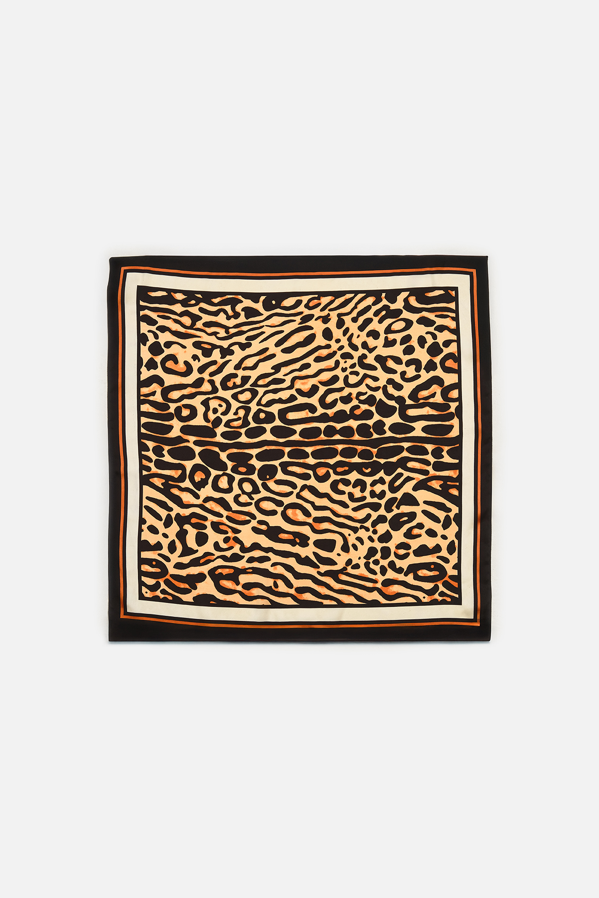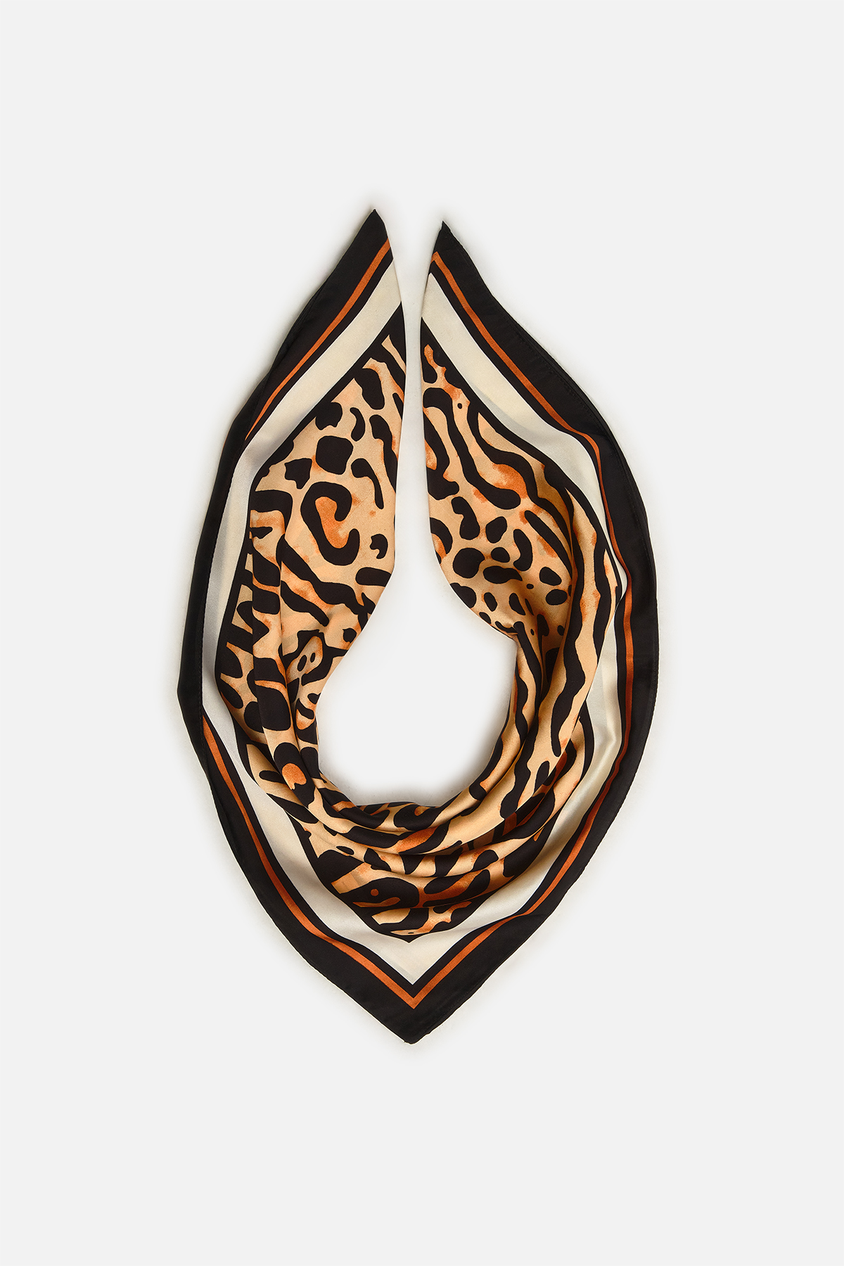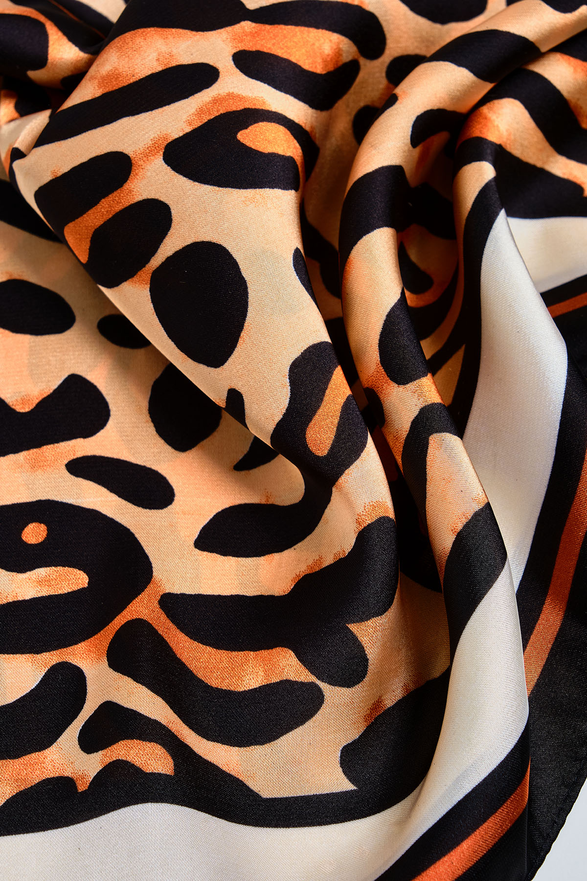 Sezonun en cool printi: Klasik leopar deseni turuncu-siyah çerçeve içinde, tam bir enerji bombası. İpeksi akışkan dokusuyla boynuna doladığında ya da saçına bağladığında anında stilini zirveye taşır. Çanta sapına sar, blazer cebine sıkıştır ya da bileğine tak; her kullanımda kombinin yıldızı olur.