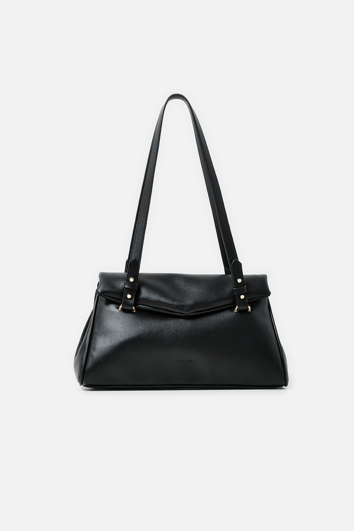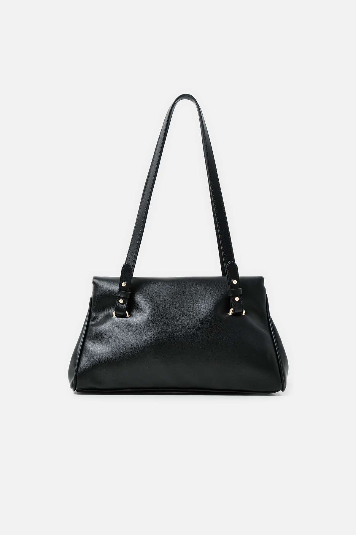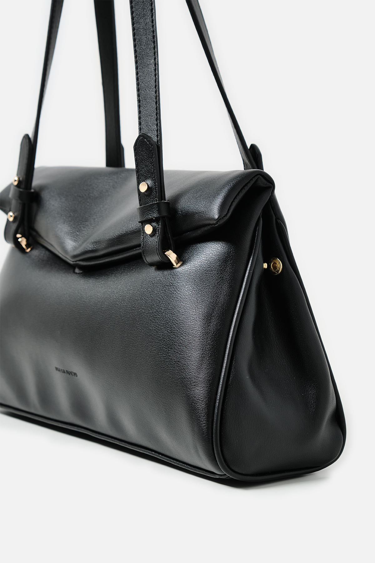 Yumuşak dokulu suni deri. Çift tutma saplı omuz çantası. Altın rengi metal detaylar. Mıknatıslı kapamalı. Fermuarlı, astarlı iç cepli.