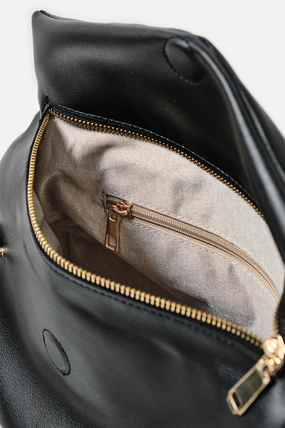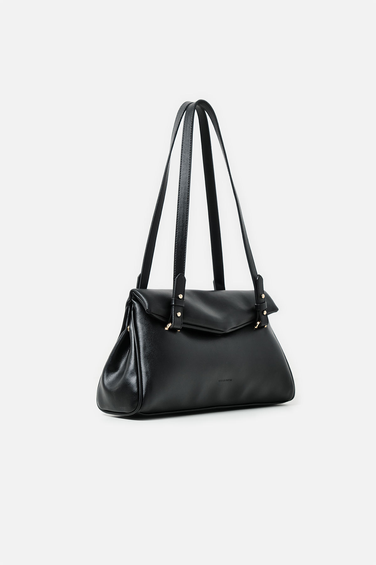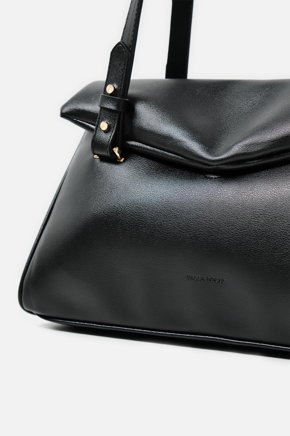 Yumuşak dokulu suni deri. Çift tutma saplı omuz çantası. Altın rengi metal detaylar. Mıknatıslı kapamalı. Fermuarlı, astarlı iç cepli.