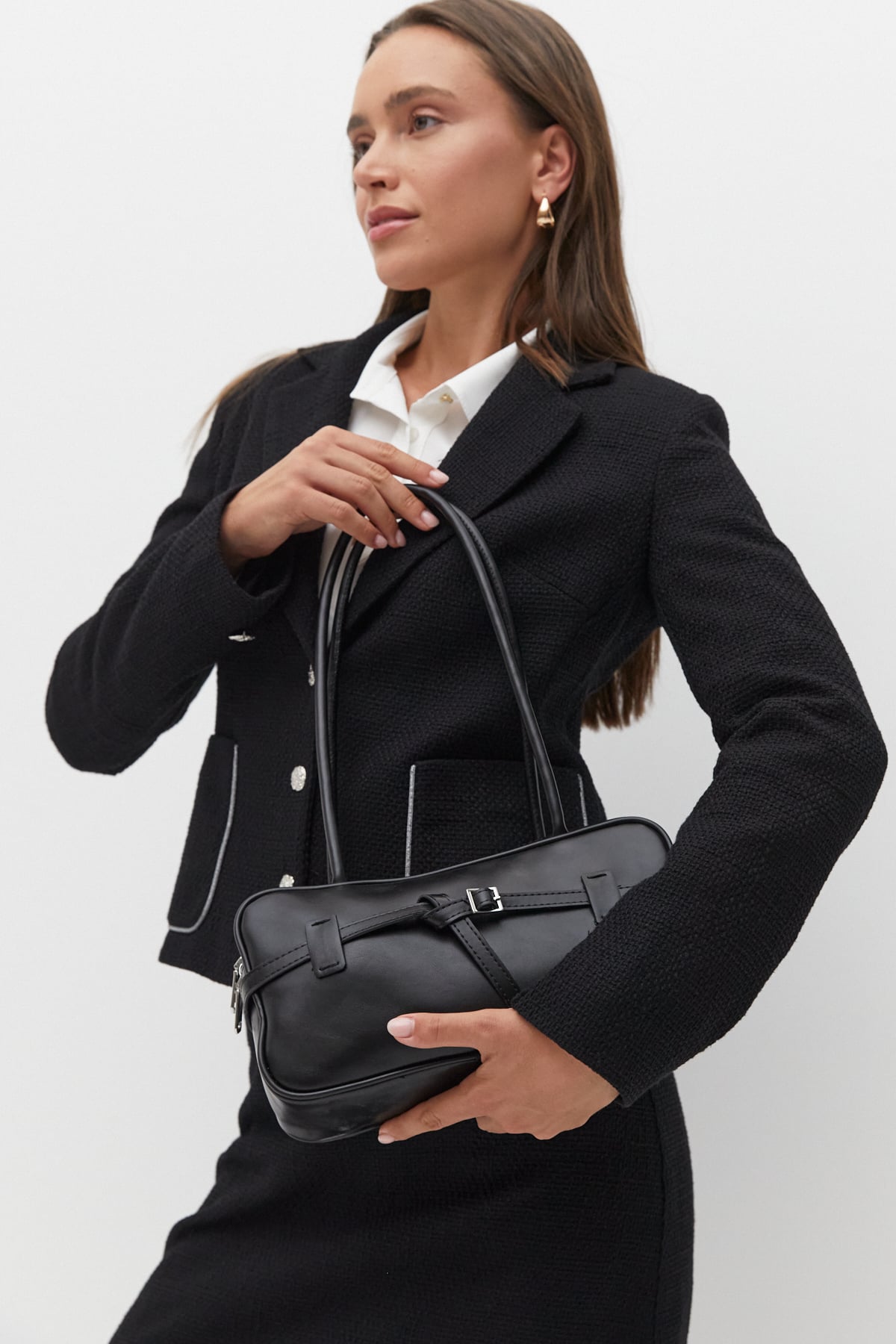 Modern ve şık bir silüete sahip tokalı omuz çantası.