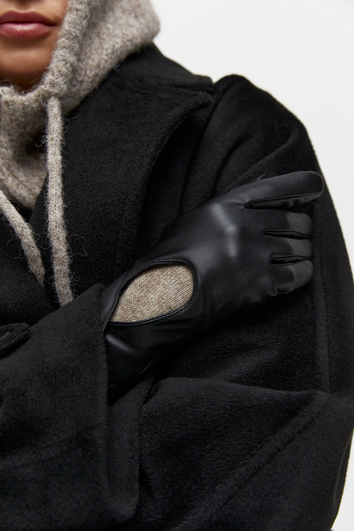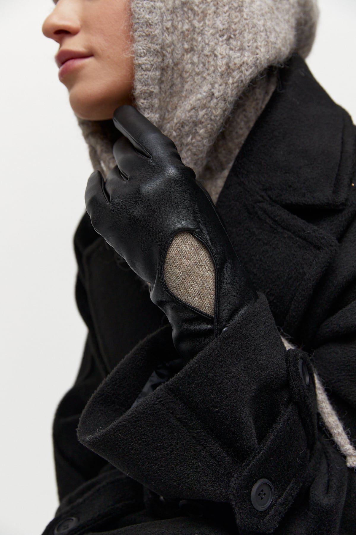 Siyah derinin klasik ve zarif görünümü, yumuºak örgü manºet detayı?yla buluºuyor. Bu eldivenler, modern tasarı?mı? ve üstün sı?caklı?k sağ?layan yapı?sı?yla kı?º ayları?nı?n en ºı?k aksesuarı? olacak.