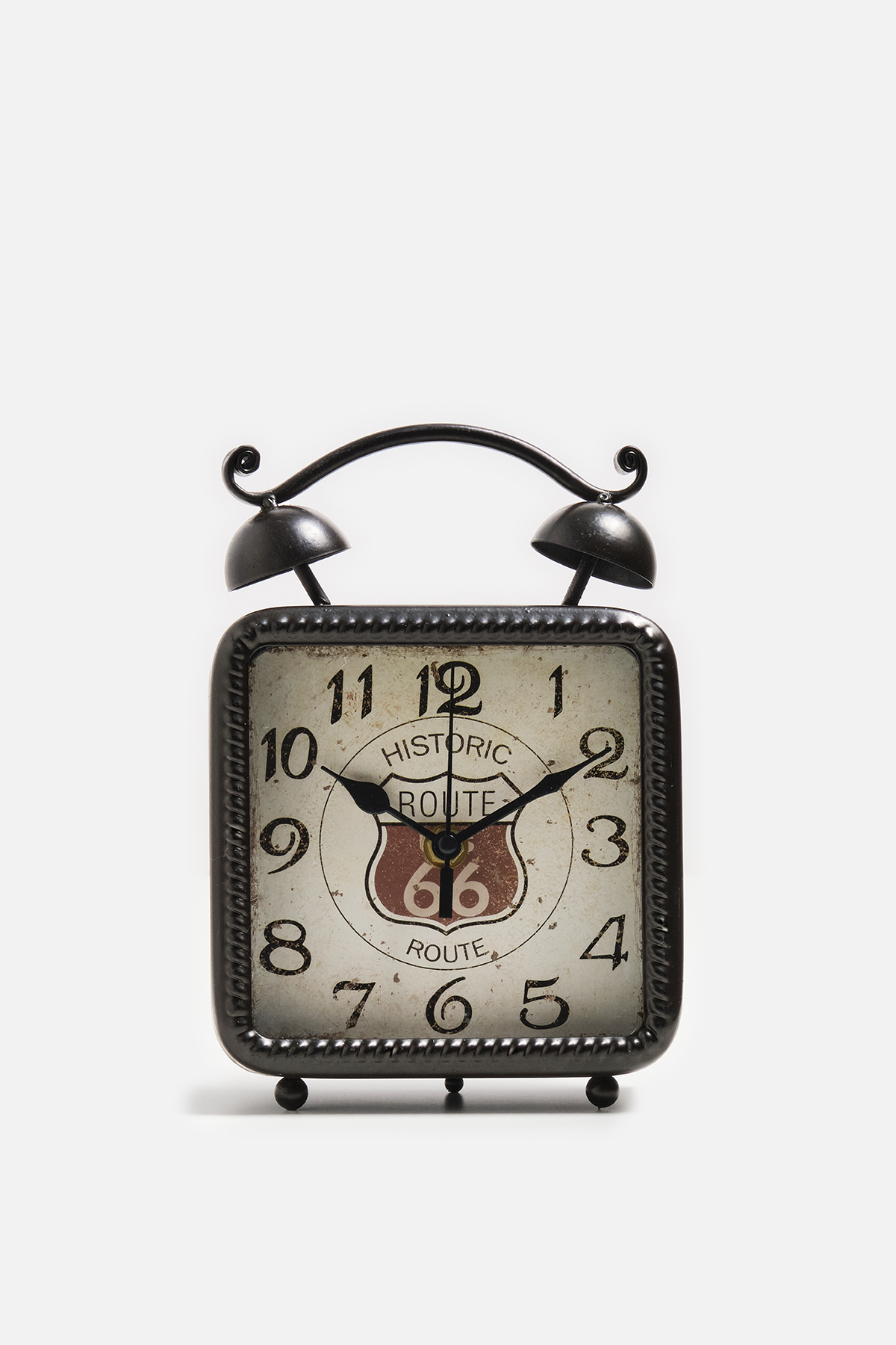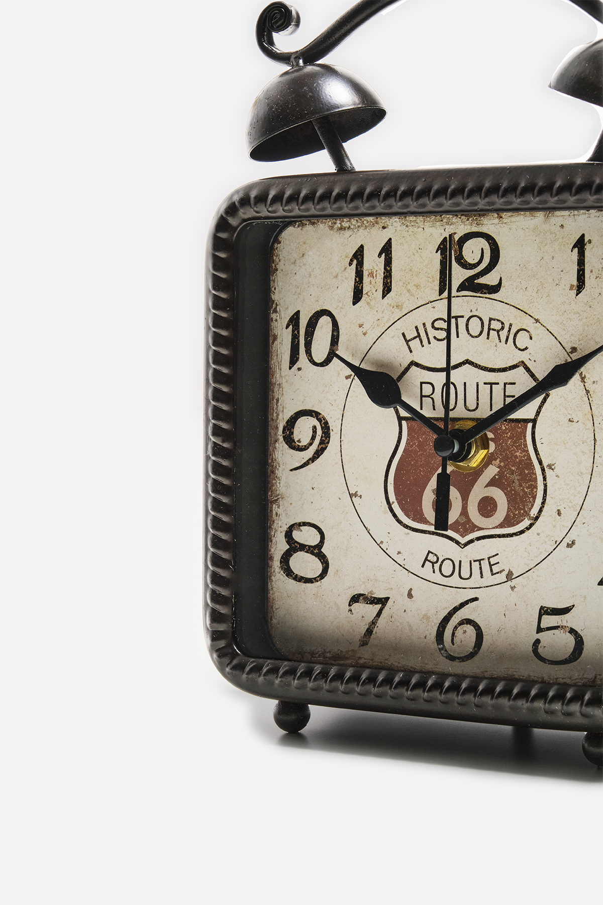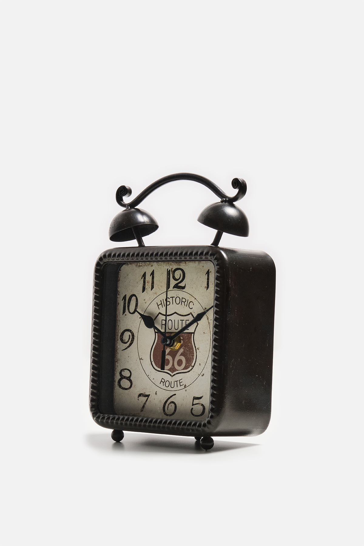 Amerikan retro ve endüstriyel esintileri birleştiren bu çalar masa saati, dekorasyonunuza karakteristik ve nostaljik bir hava katar. Saatin gövdesi, eskitilmiş bir görünüme sahip mat, koyu metalden yapılmıştır. Kare formdaki kadranı çevreleyen örgülü (halat benzeri) metal çerçeve detayı, ürüne belirgin bir doku ve karakter katar. Kadran, eskitilmiş, kremsi beyaz bir zemin üzerinde kalın, siyah rakamlara sahiptir. Merkezde yer alan "Historic Route 66" işaretinin vintage illüstrasyonu, saate retro bir yolculuk teması kazandırır. Üst kısmında yer alan kıvrık metal kollu iki adet klasik çan, saatin geleneksel çalar saat formunu tamamlar. Bu saat, endüstriyel, rustik veya Amerikan temalı dekorasyonlarda güçlü bir vurgu parçası olarak kullanılabilir.