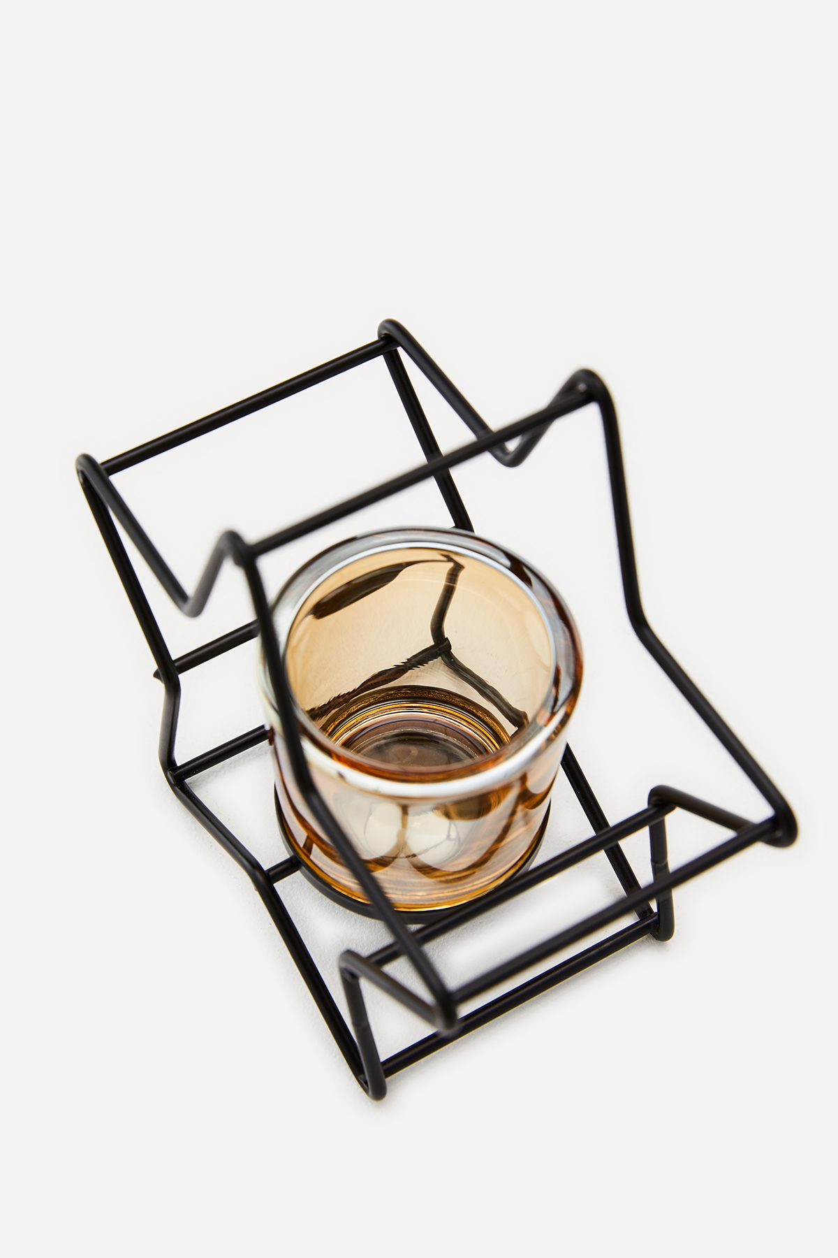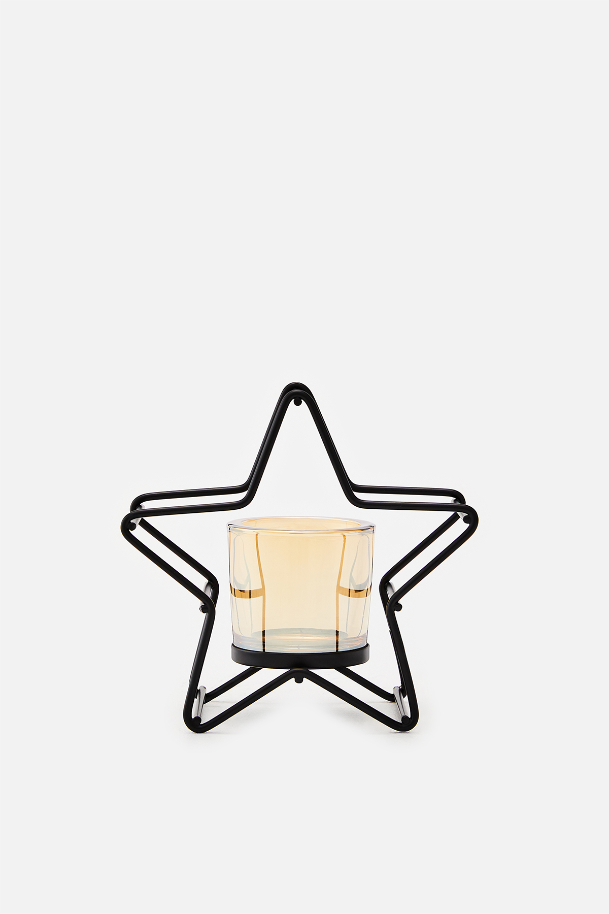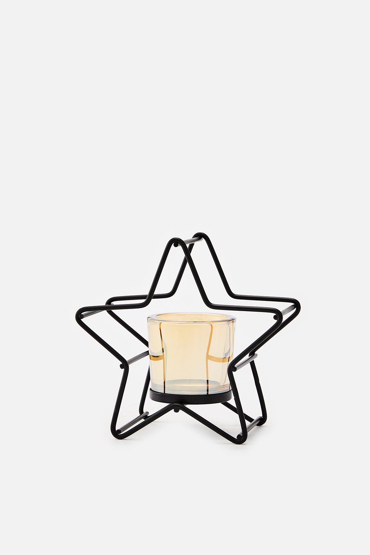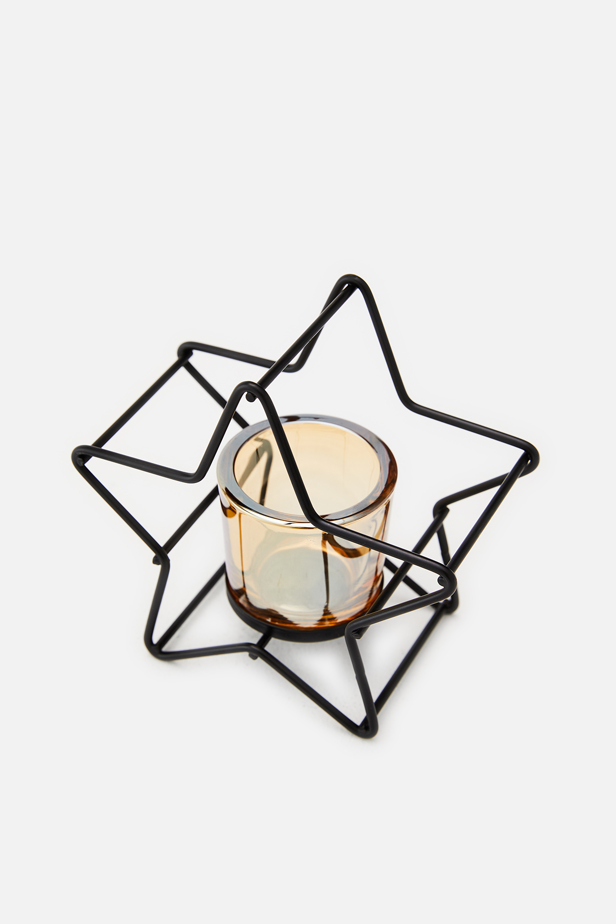 Minimalist ve modern çizgileriyle tasarlanan bu küçük yıldız mumluk, dar alanlara bile ışıltılı bir dokunuş katıyor. Siyah metalin keskin hatları, içindeki kehribar renkli cam mumlukla kontrast oluşturarak şık bir denge kuruyor. Komodin, kitaplık veya küçük masalarınızda, ışığı sanat eseri gibi yansıtan bu parça, mekanınıza iddialı ve modern bir stil kazandırır.