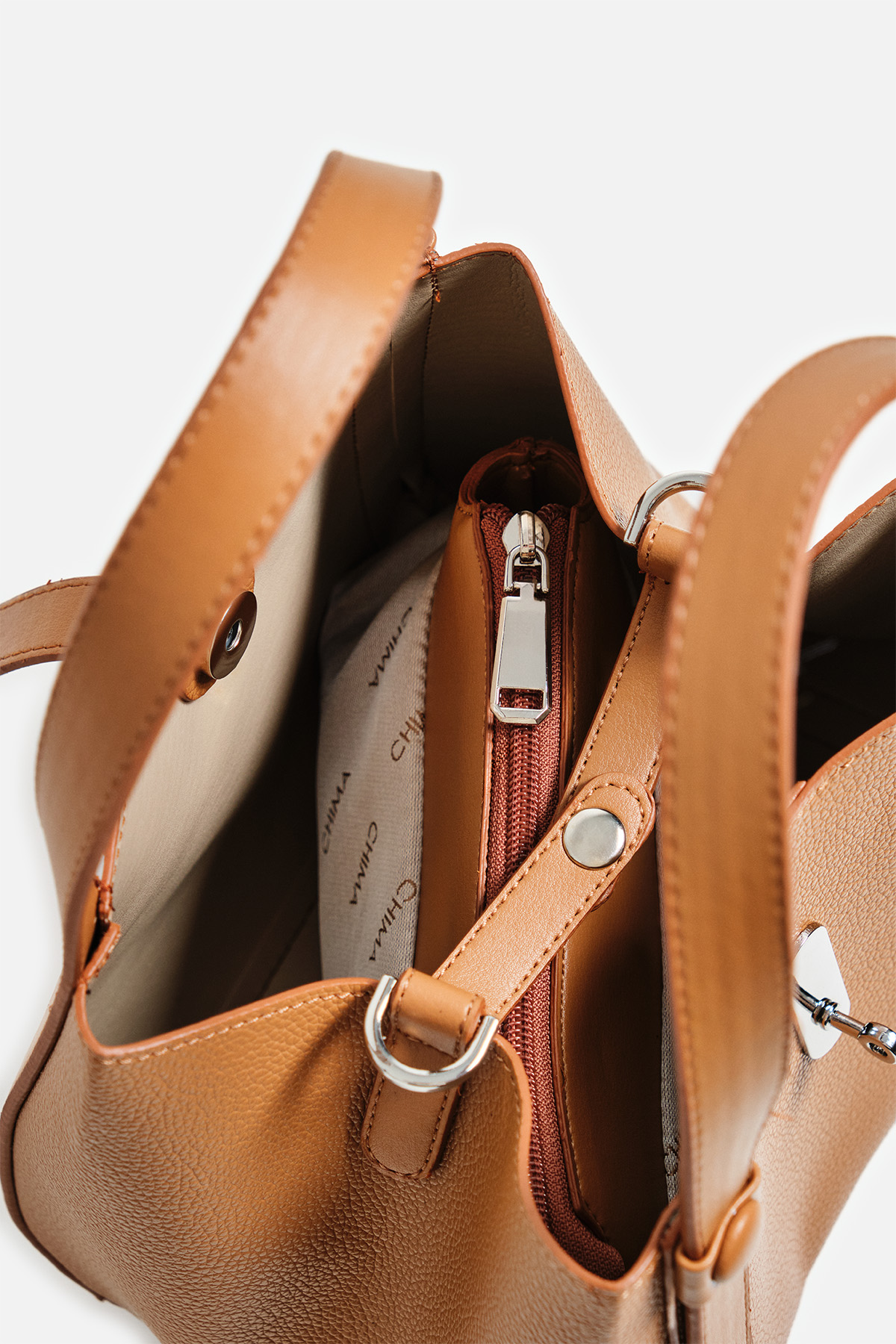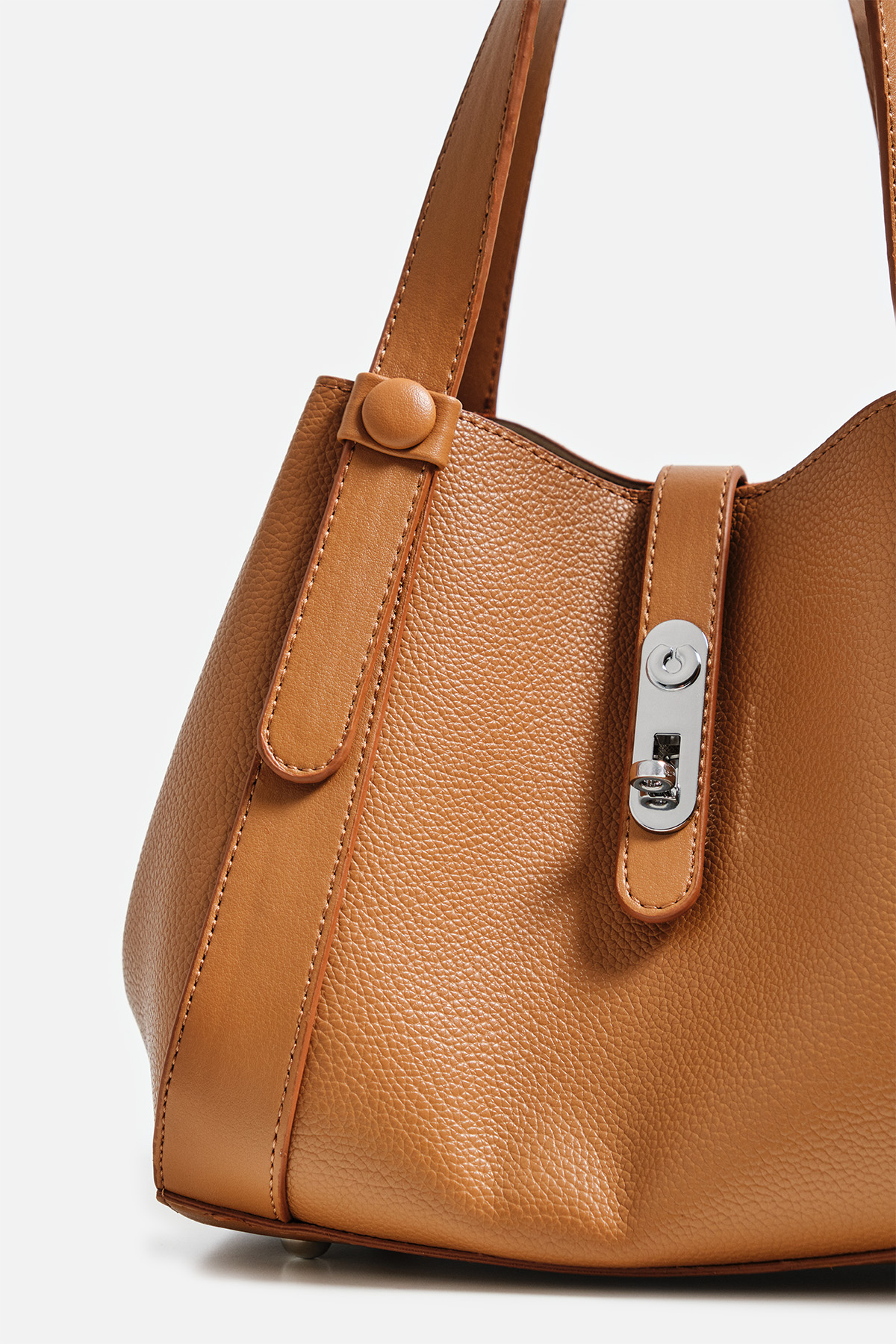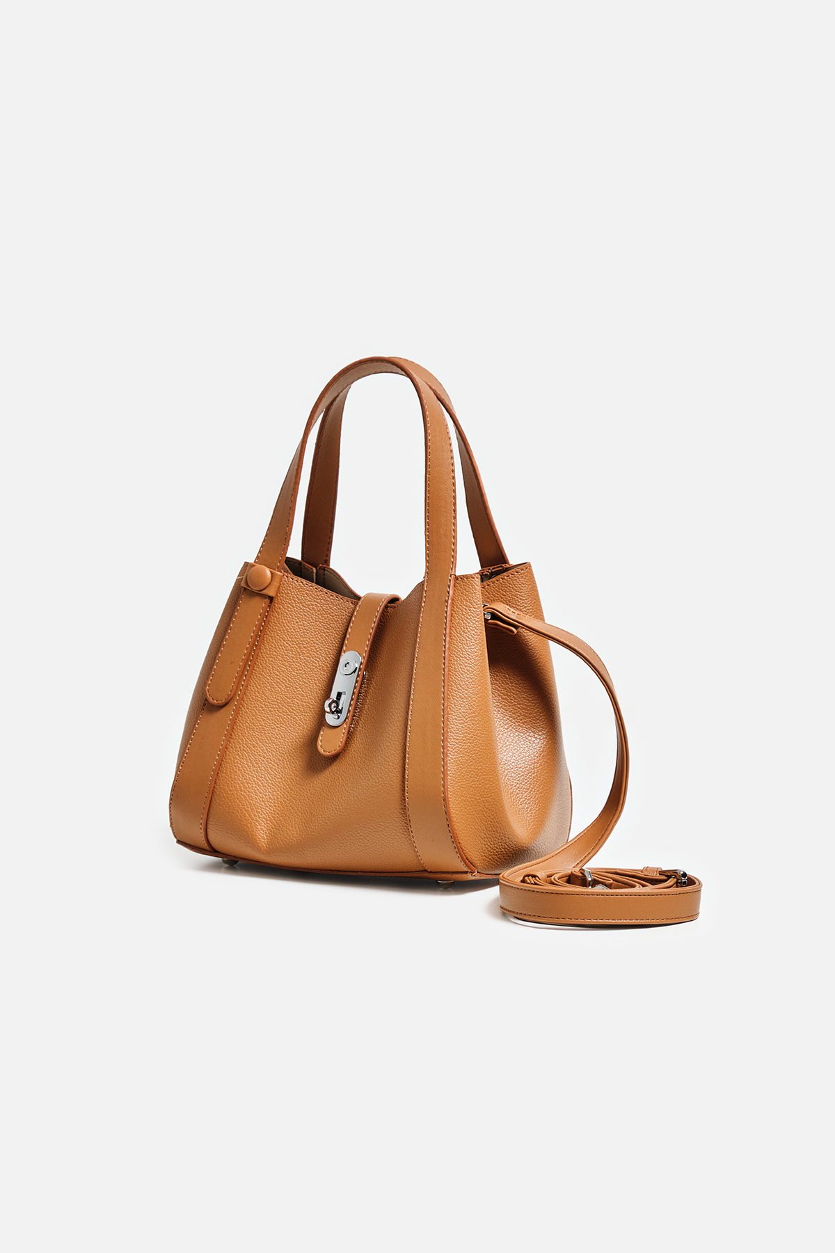 Dokulu suni deriden çıkarılabilir çapraz askılı ön kısmında metal toka detaylı iç yavrusu bulunan el çantası