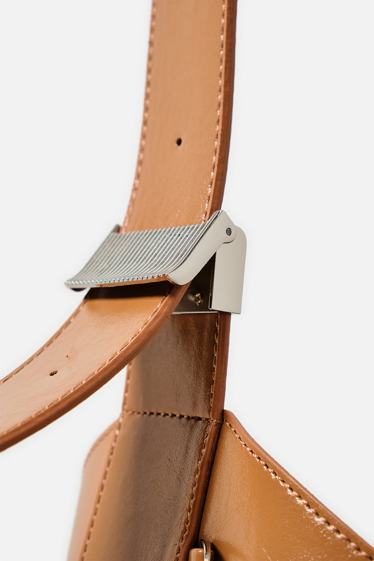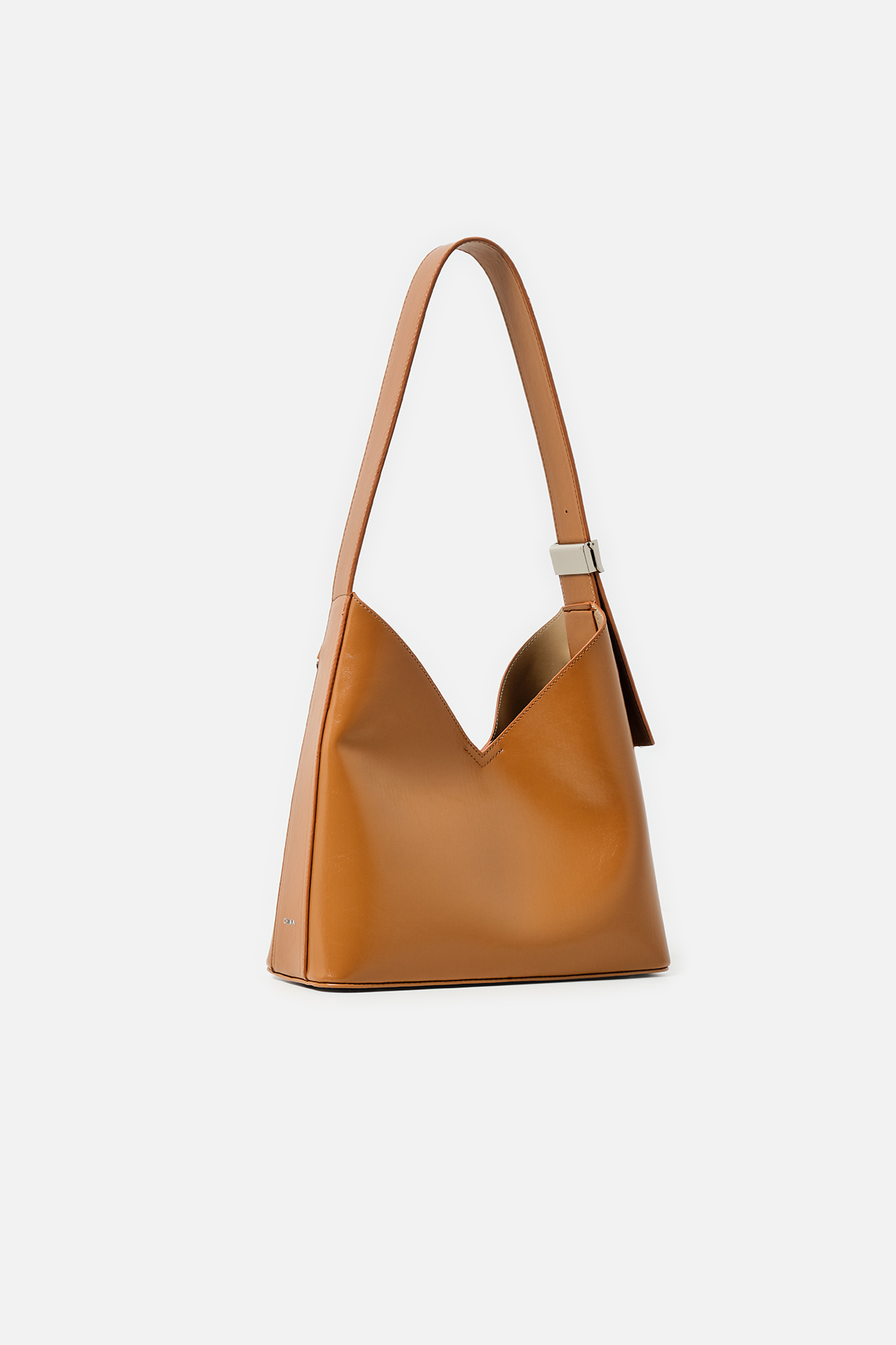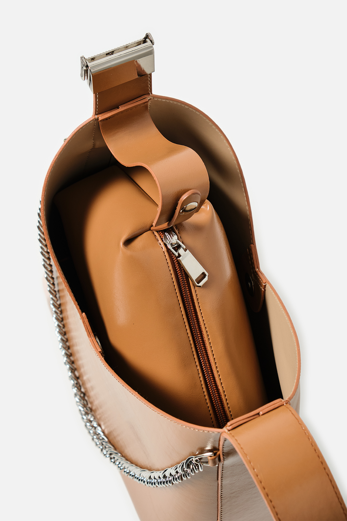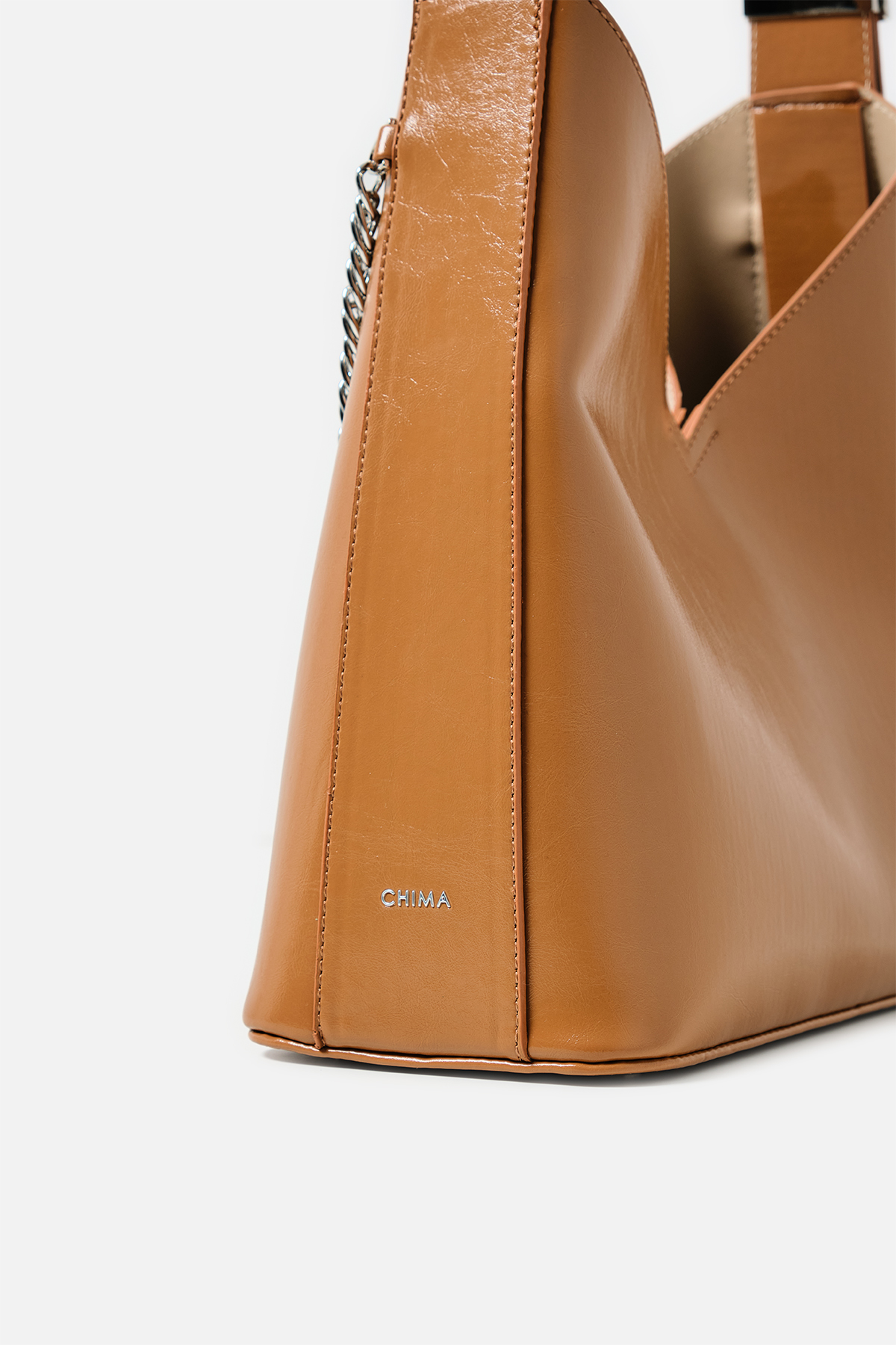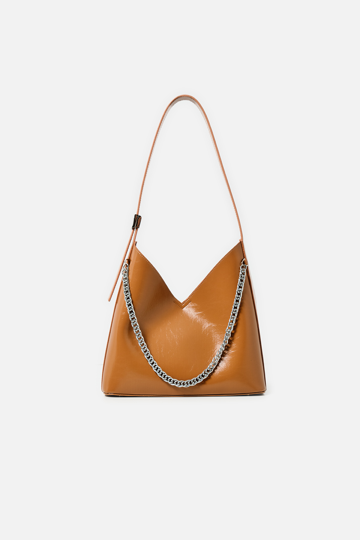 Parlak deriden ön kısmında metal zincir detayı iç kısmında aynı deriden yavrusu bulunan omuz askıı uzunluğu metal aparatı ile değiştirilebilen omuz çantası.