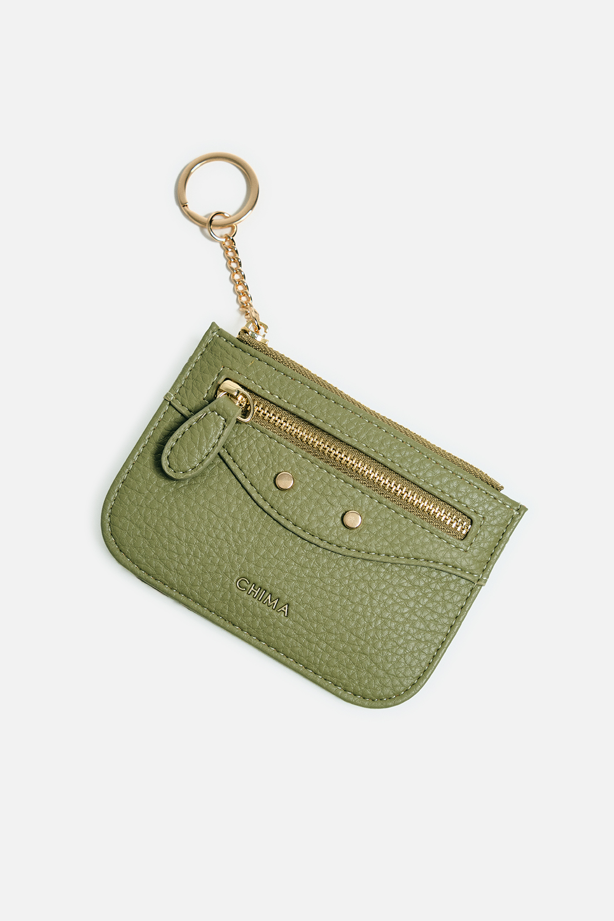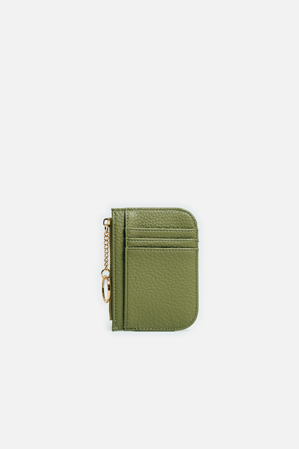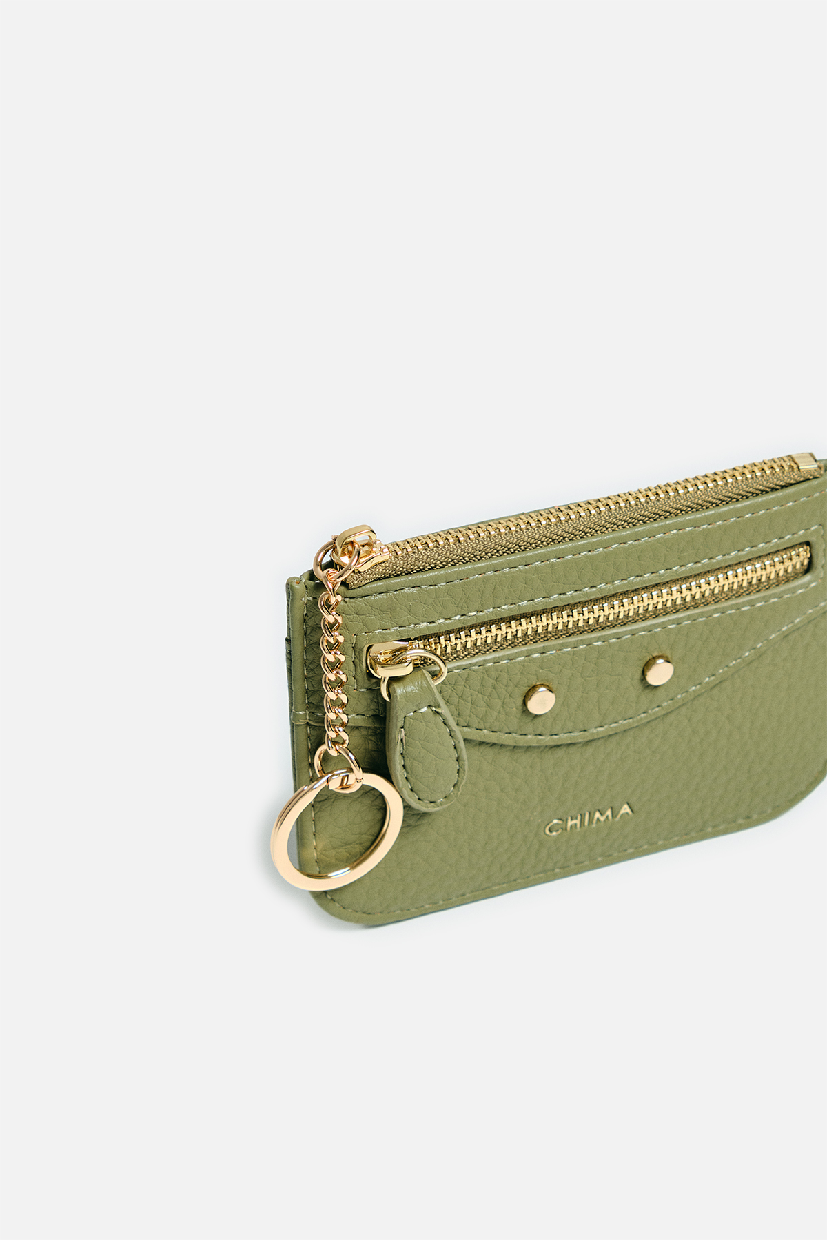 Dokulu deri görünümlü dış yüzey. Ön yüzde katmanlı tasarım, fermuar ve iki adet dairesel motif bulunuyor. İç kısmında bozuk para yeri ve arka yüzünde kartlık tasarımı mevcut.